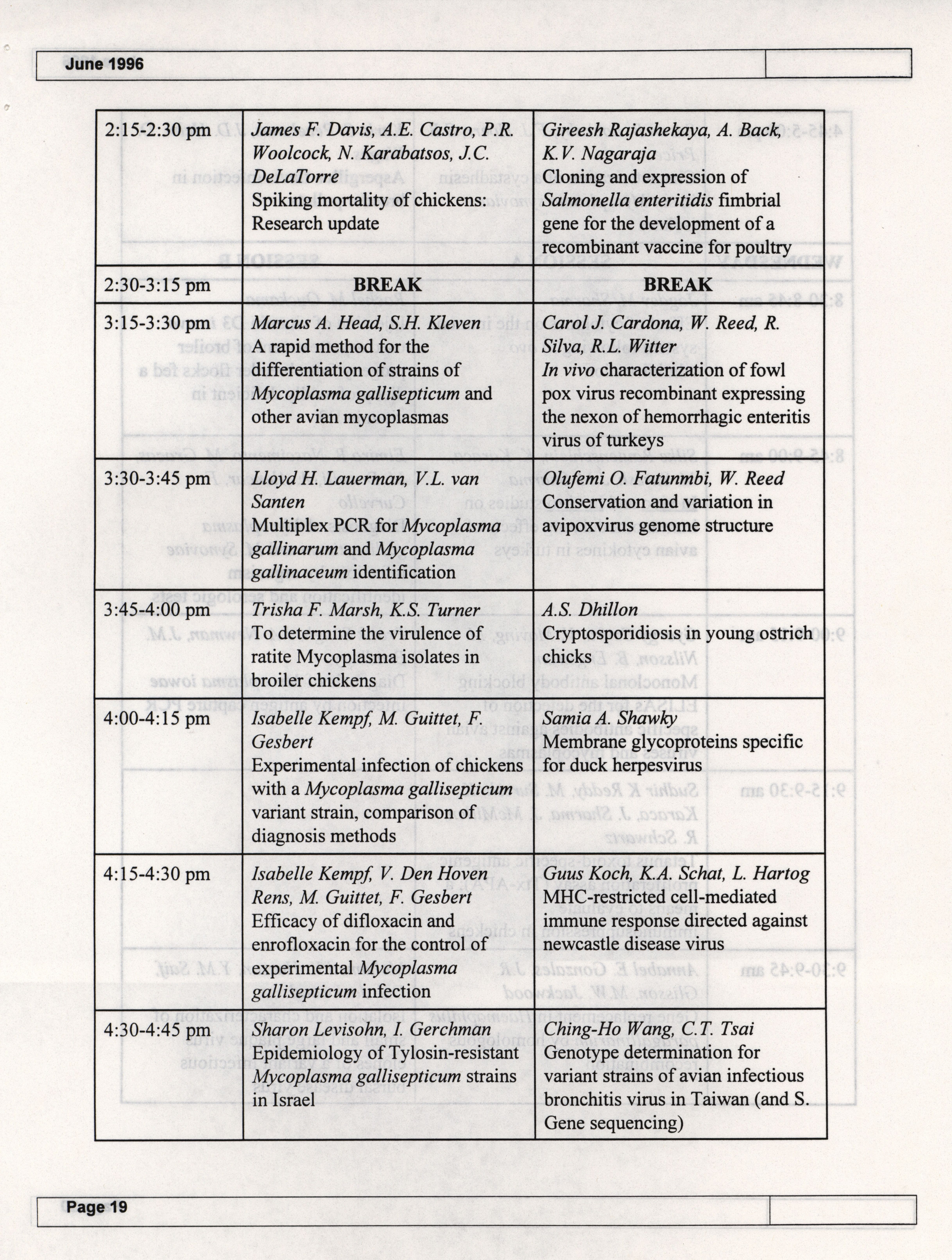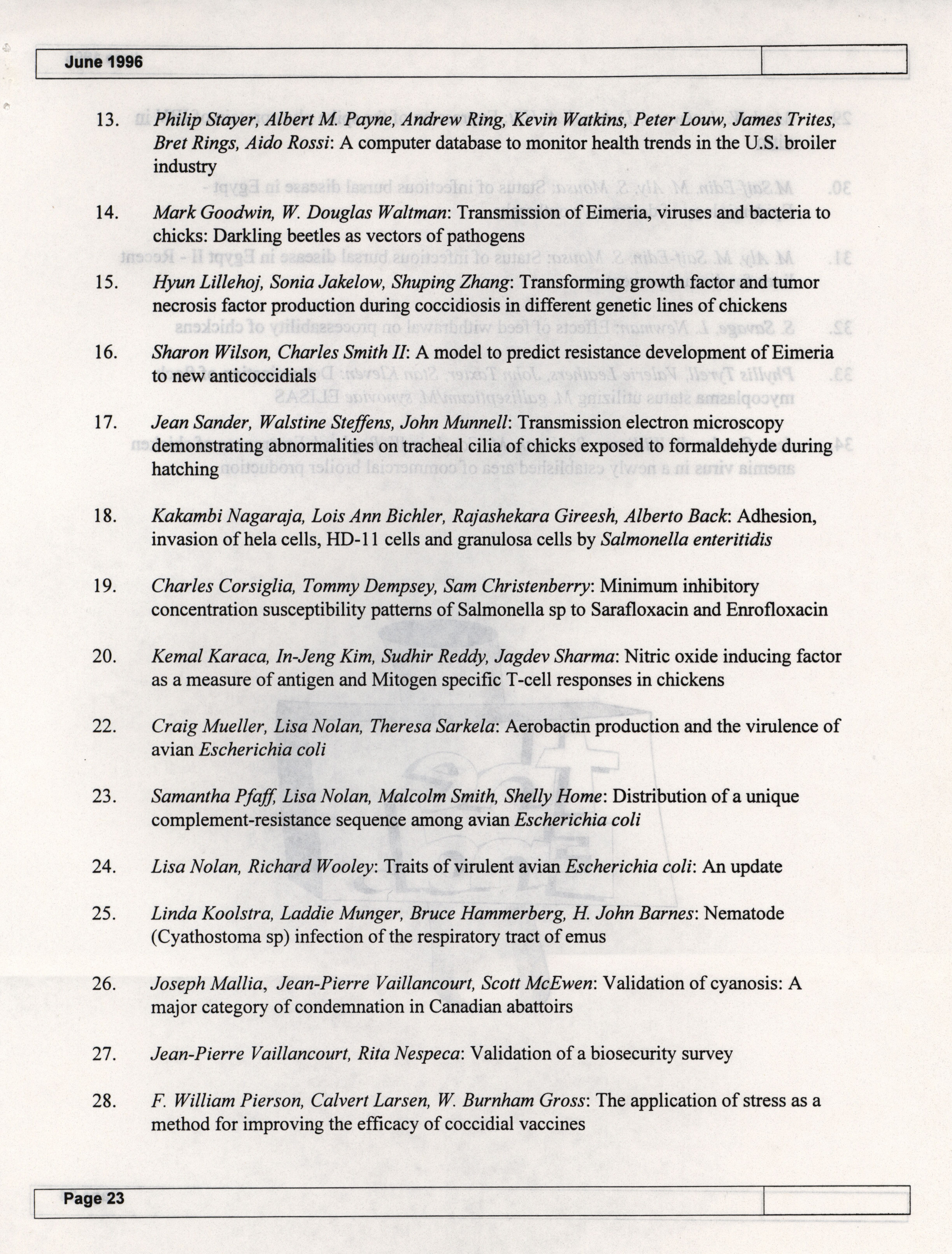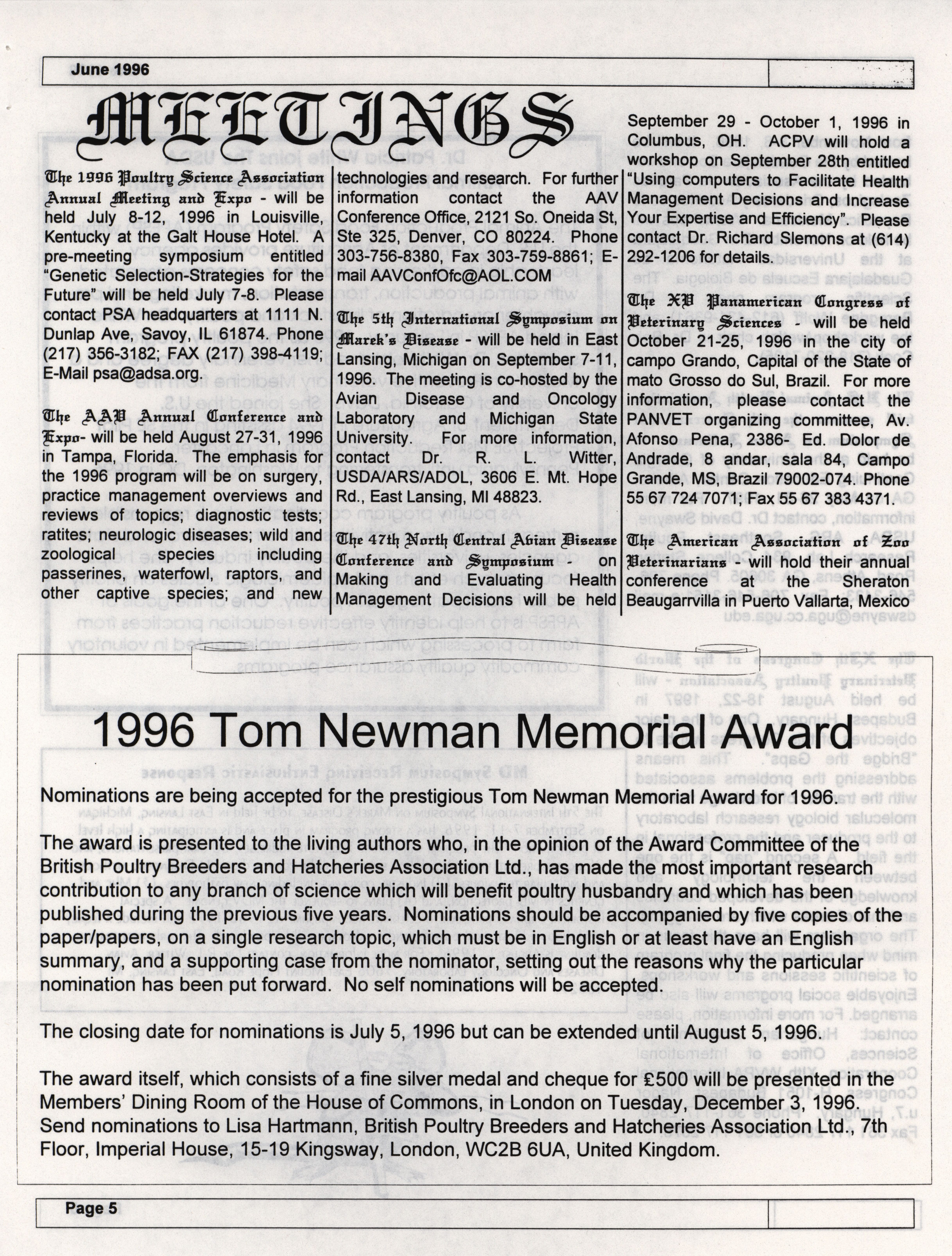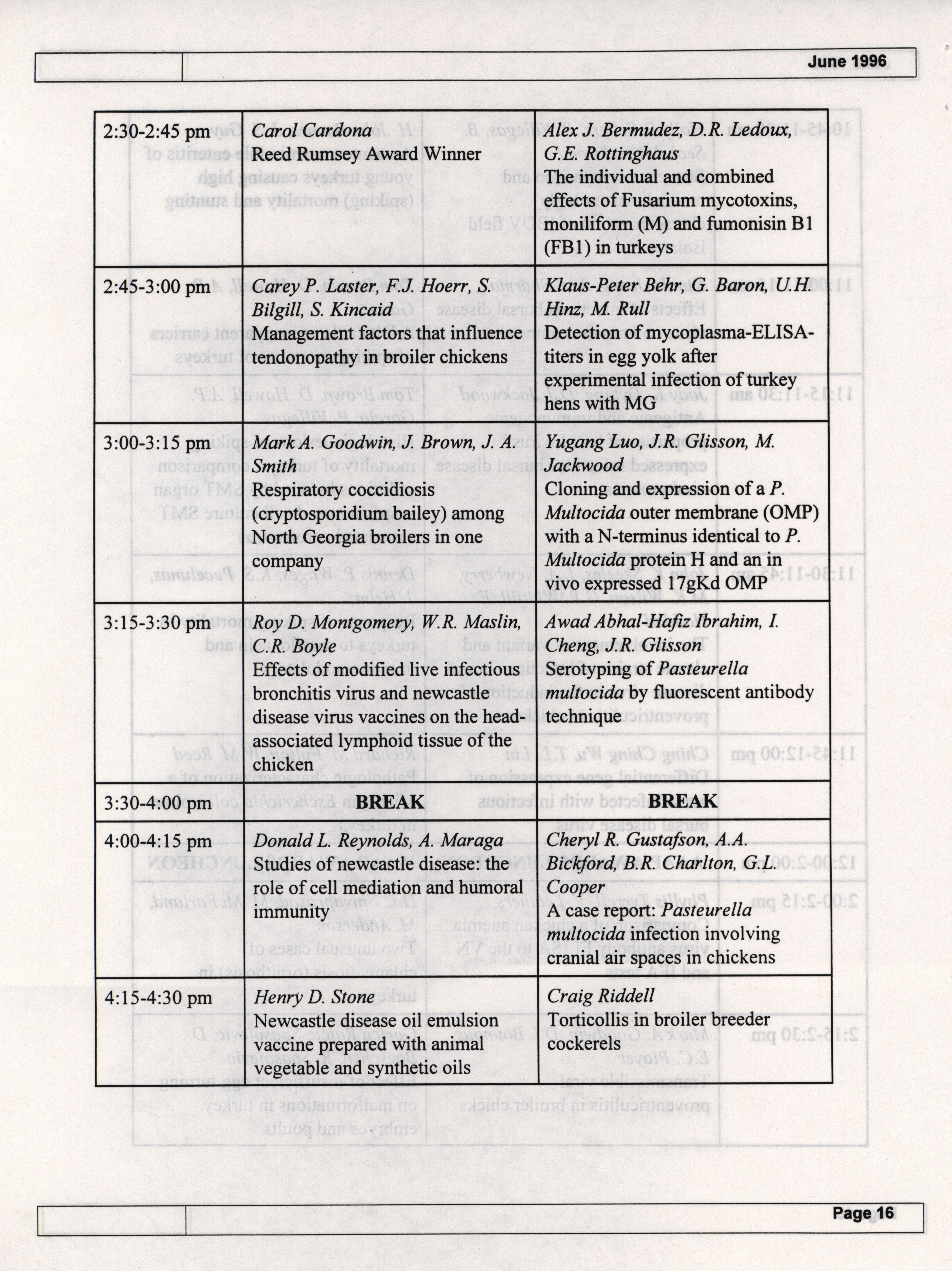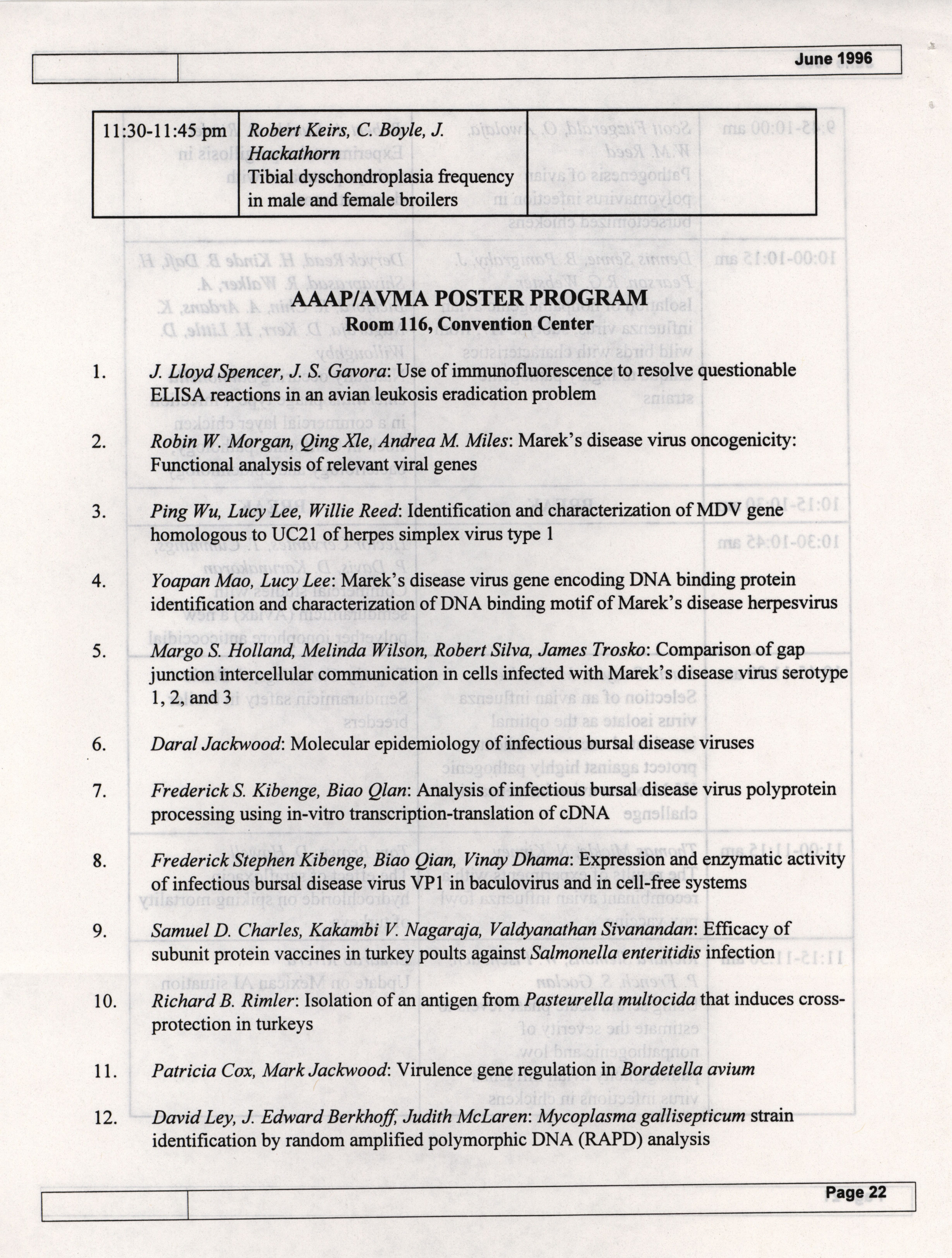 - The summer newsletter of the American Association of Avian Pathologists, June 1996. The quarterly newsletter features several different topics, including 1996 annual meeting information and scientific program, 1996 AAAP committee reports and 1996 committee meetings.