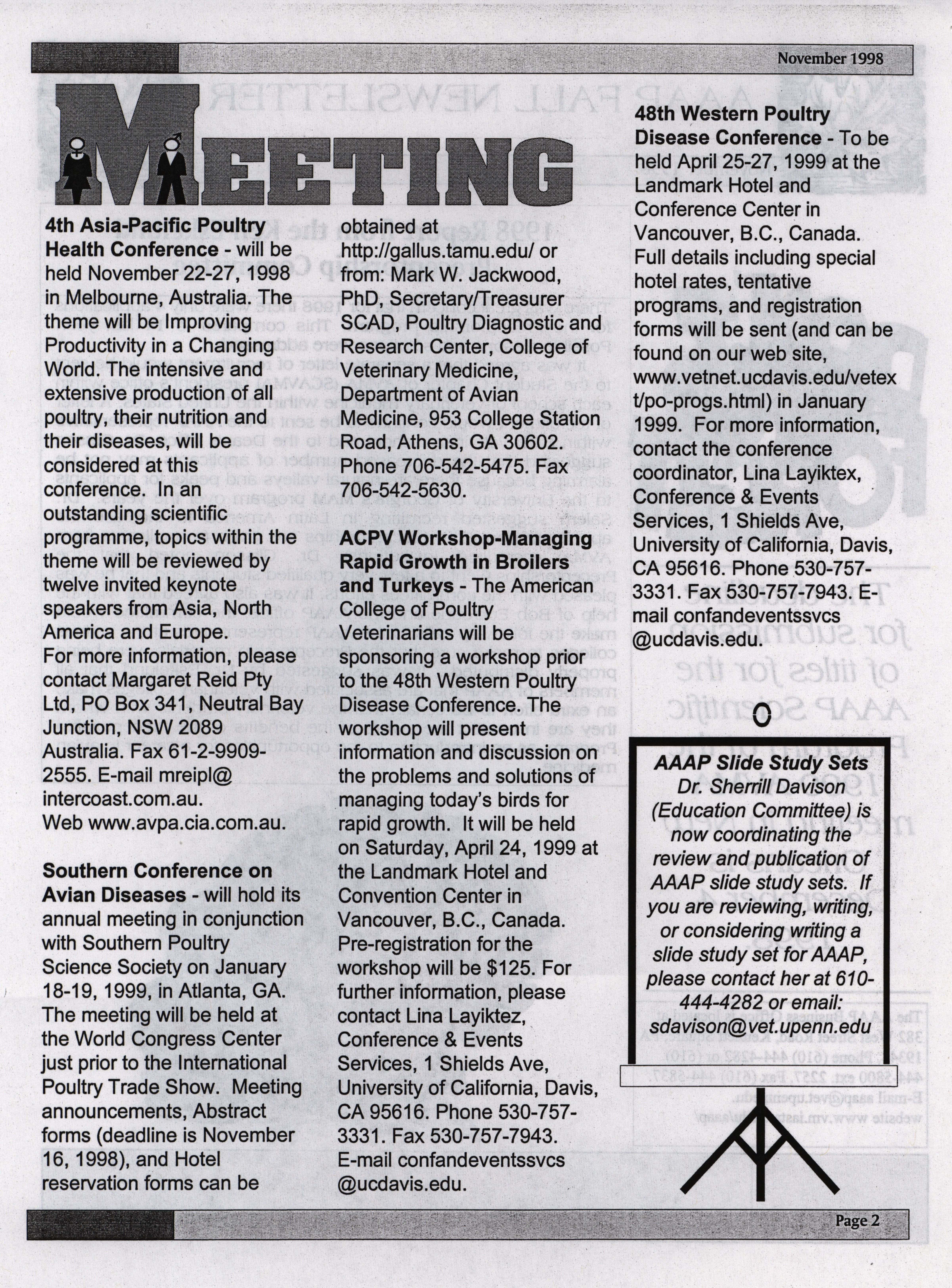 - The fall newsletter of the American Association of Avian Pathologists, November, 1998. The quarterly newsletter features several different topics, including a report from the preceptorship committee and meeting schedules.