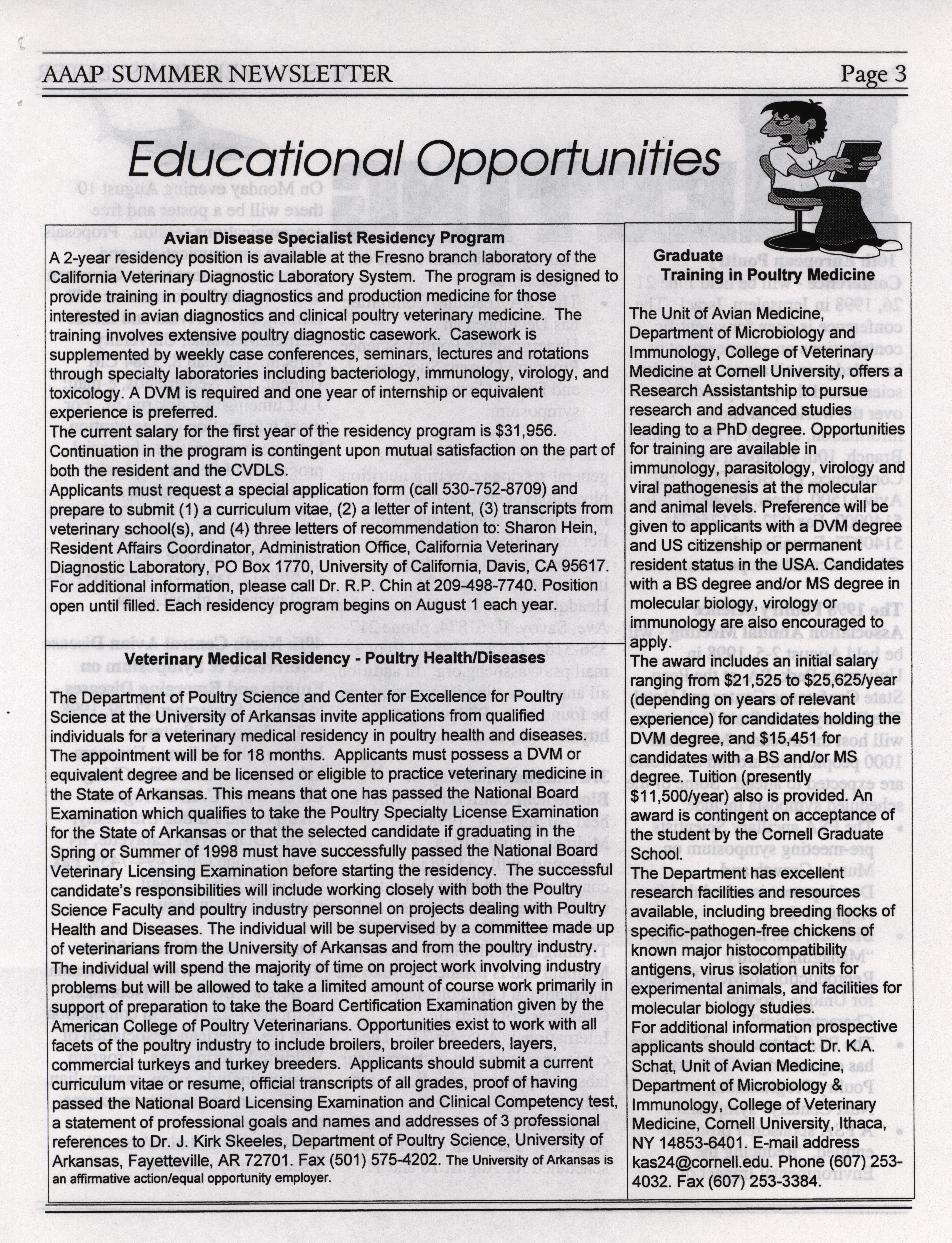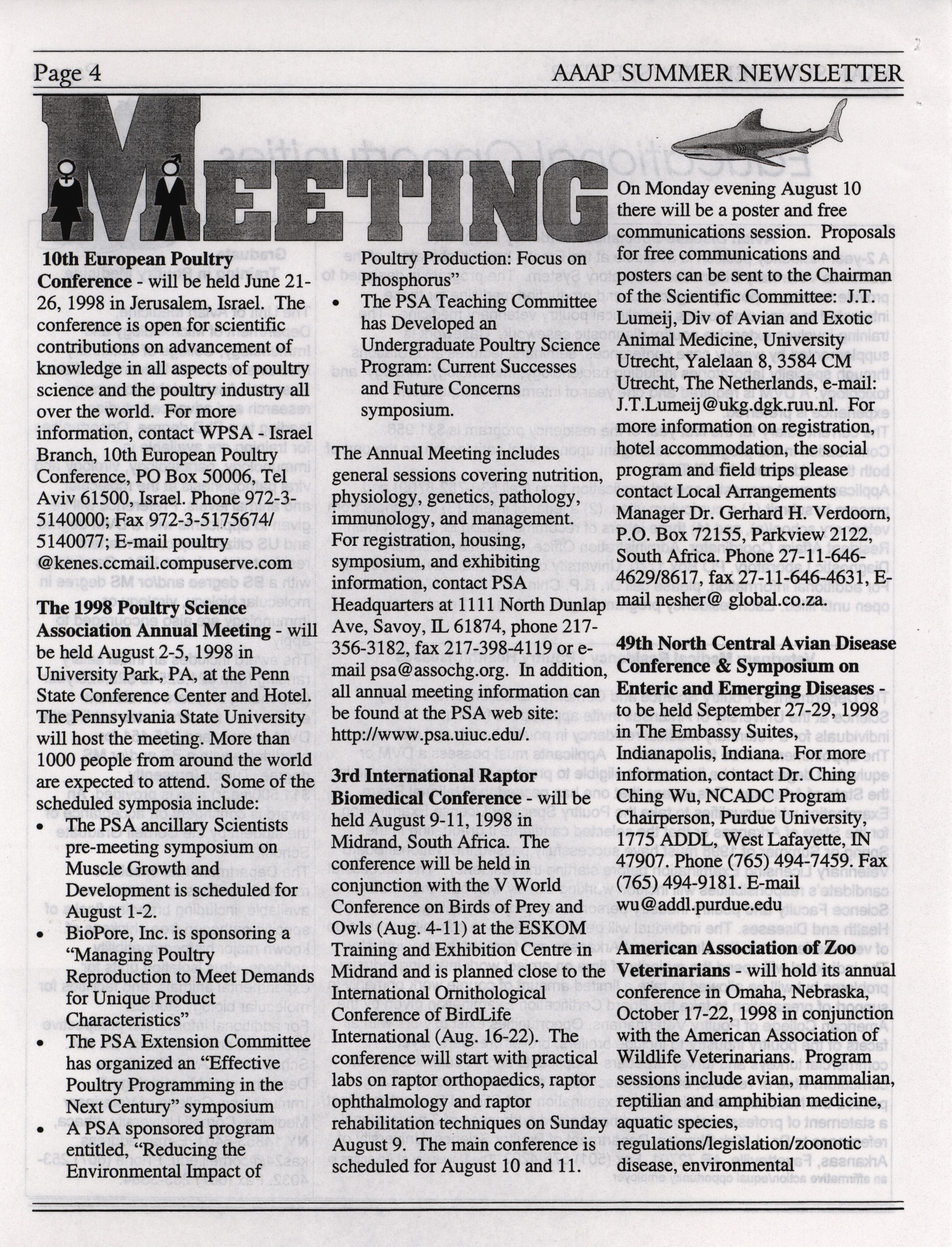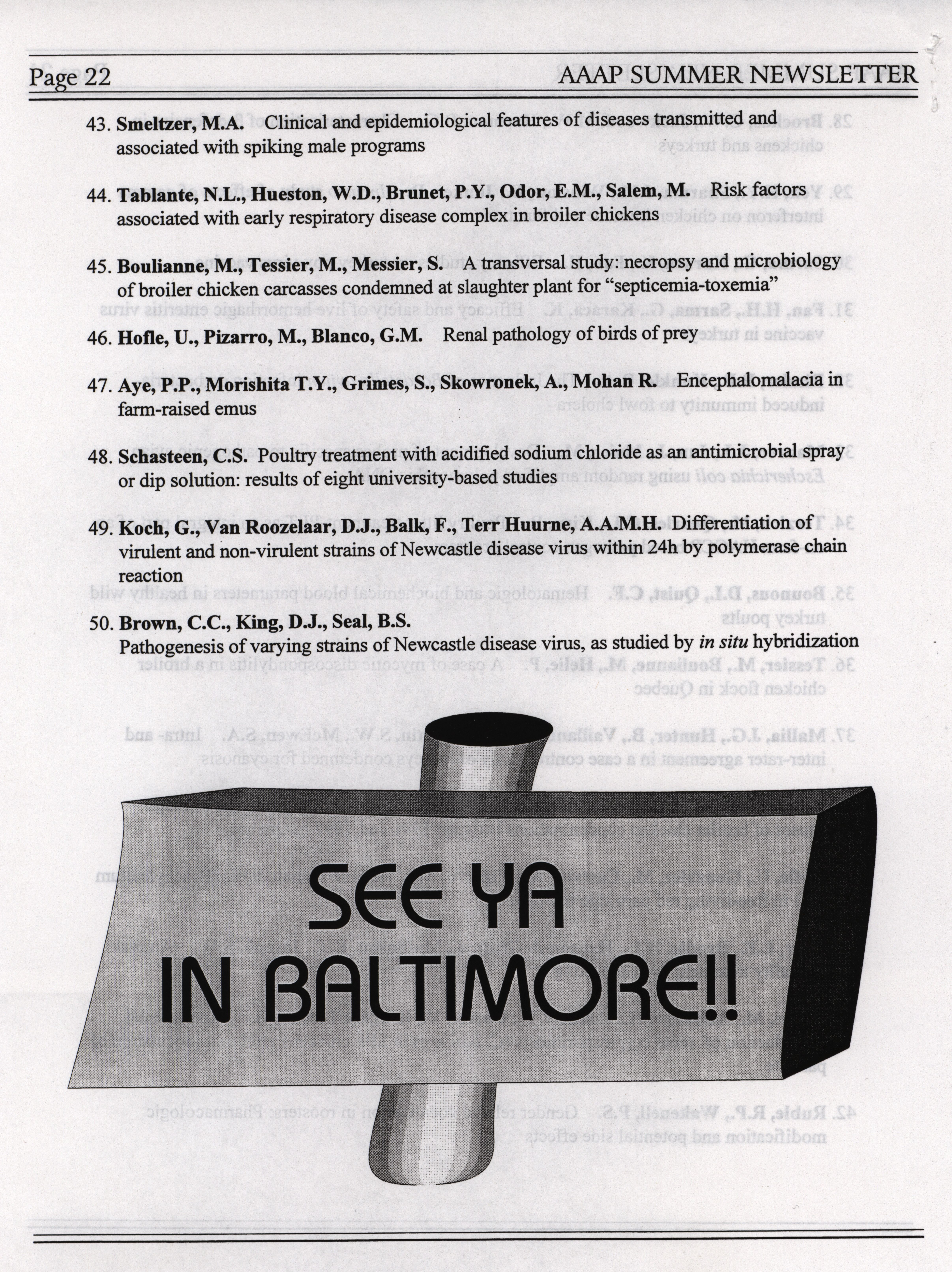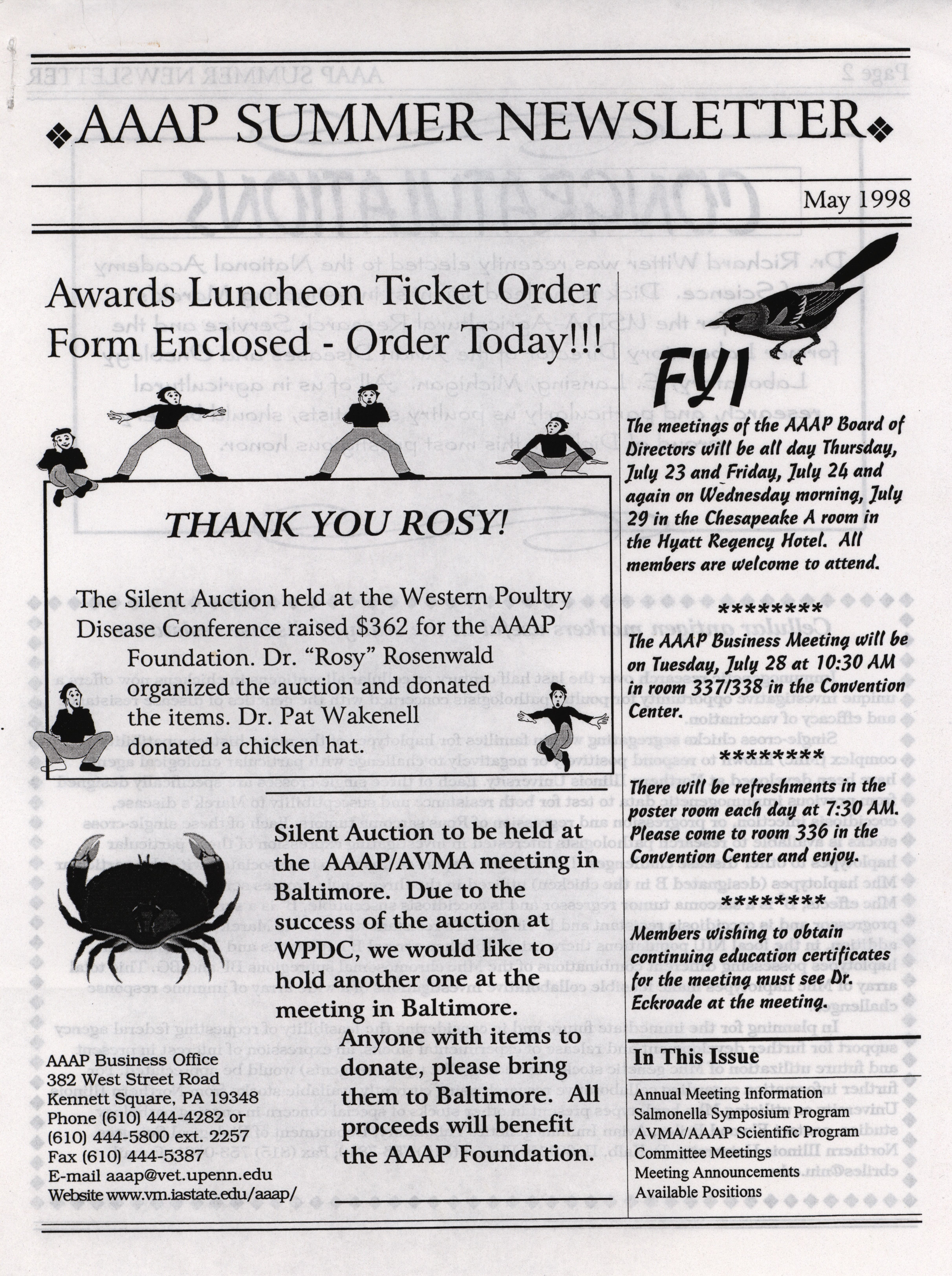 - The summer newsletter of the American Association of Avian Pathologists, May 1998. The quarterly newsletter features several different topics, including annual meeting information, the AVMA (American Veterinary Medical Association)/AAAP scientific program, and committee meetings.