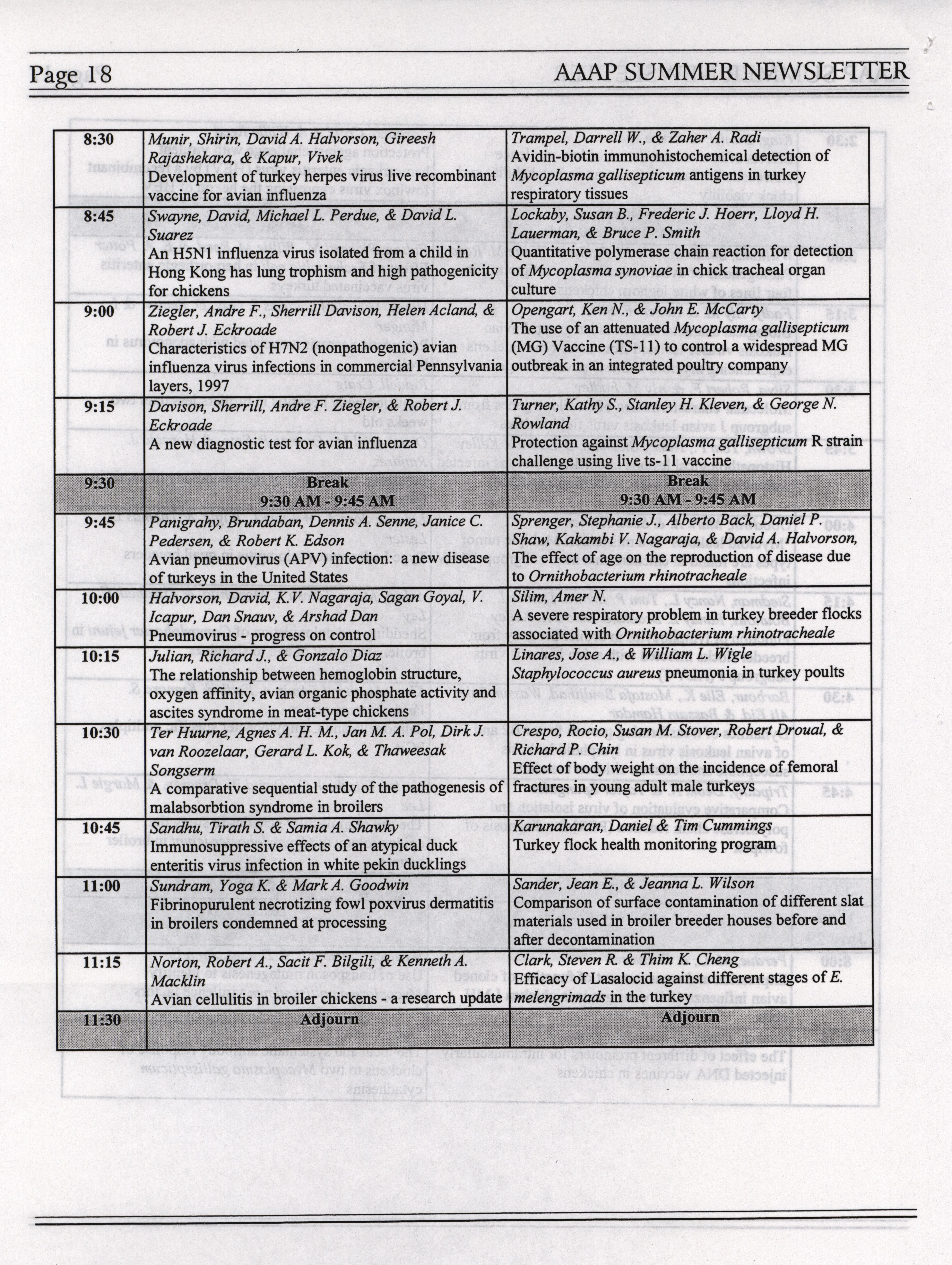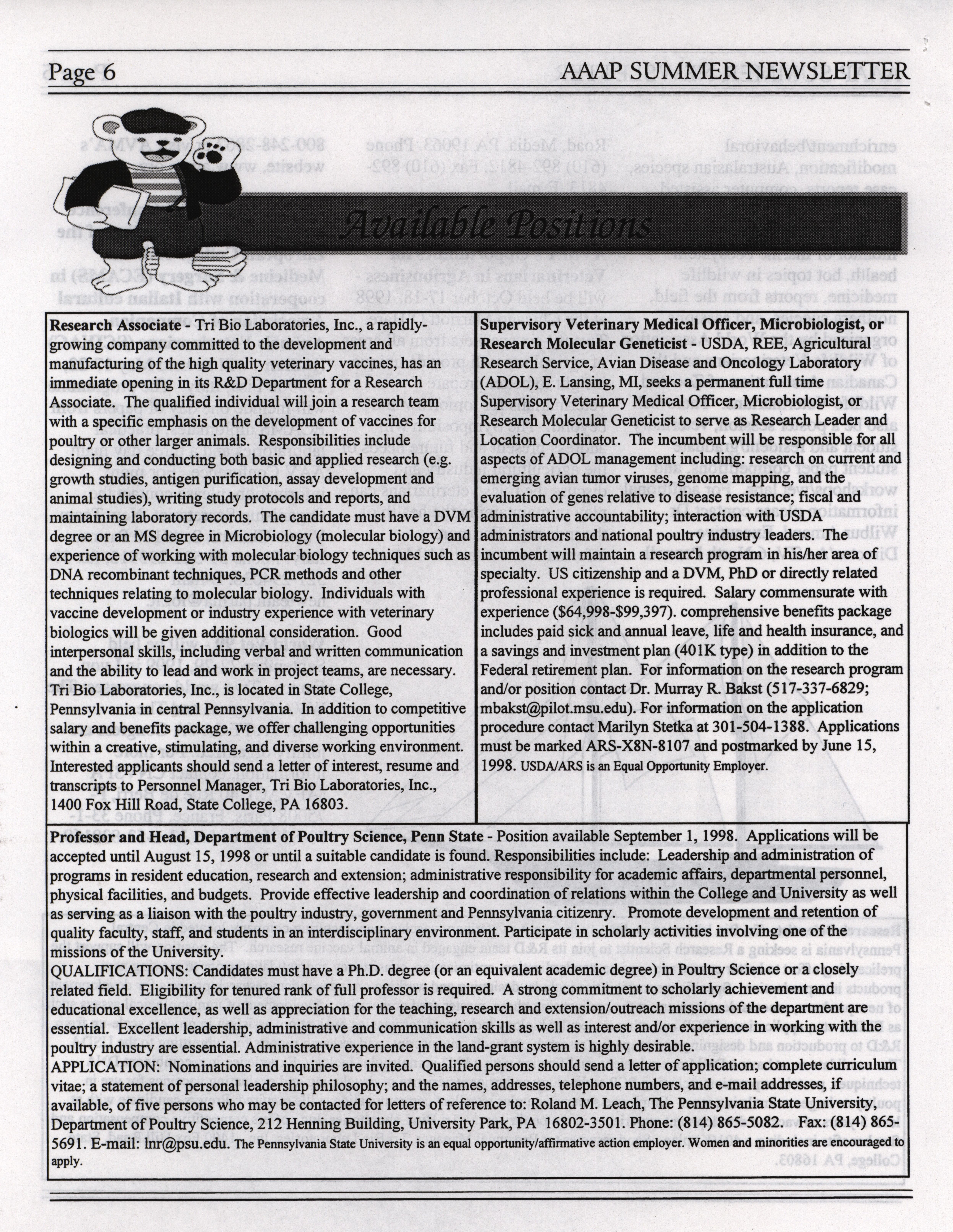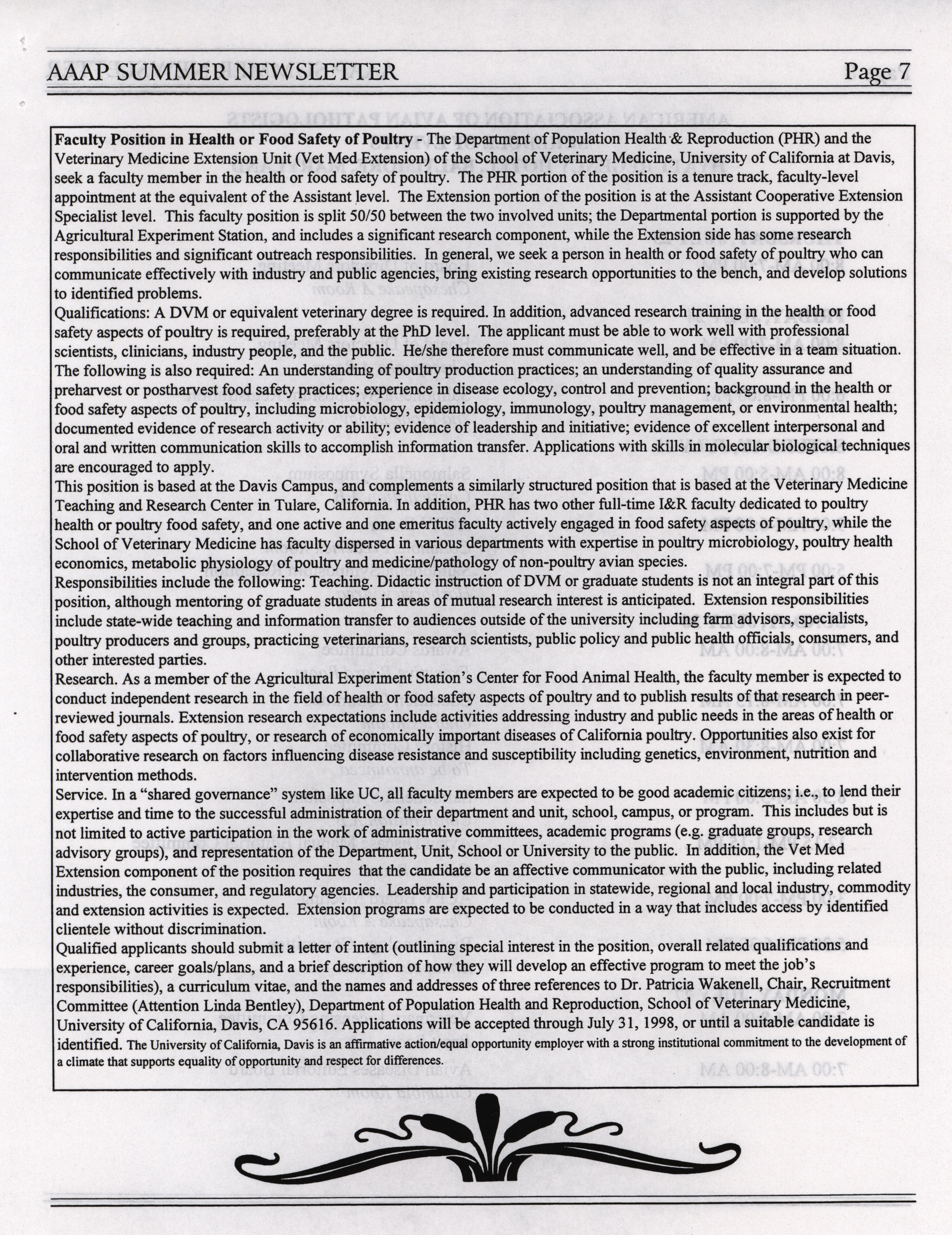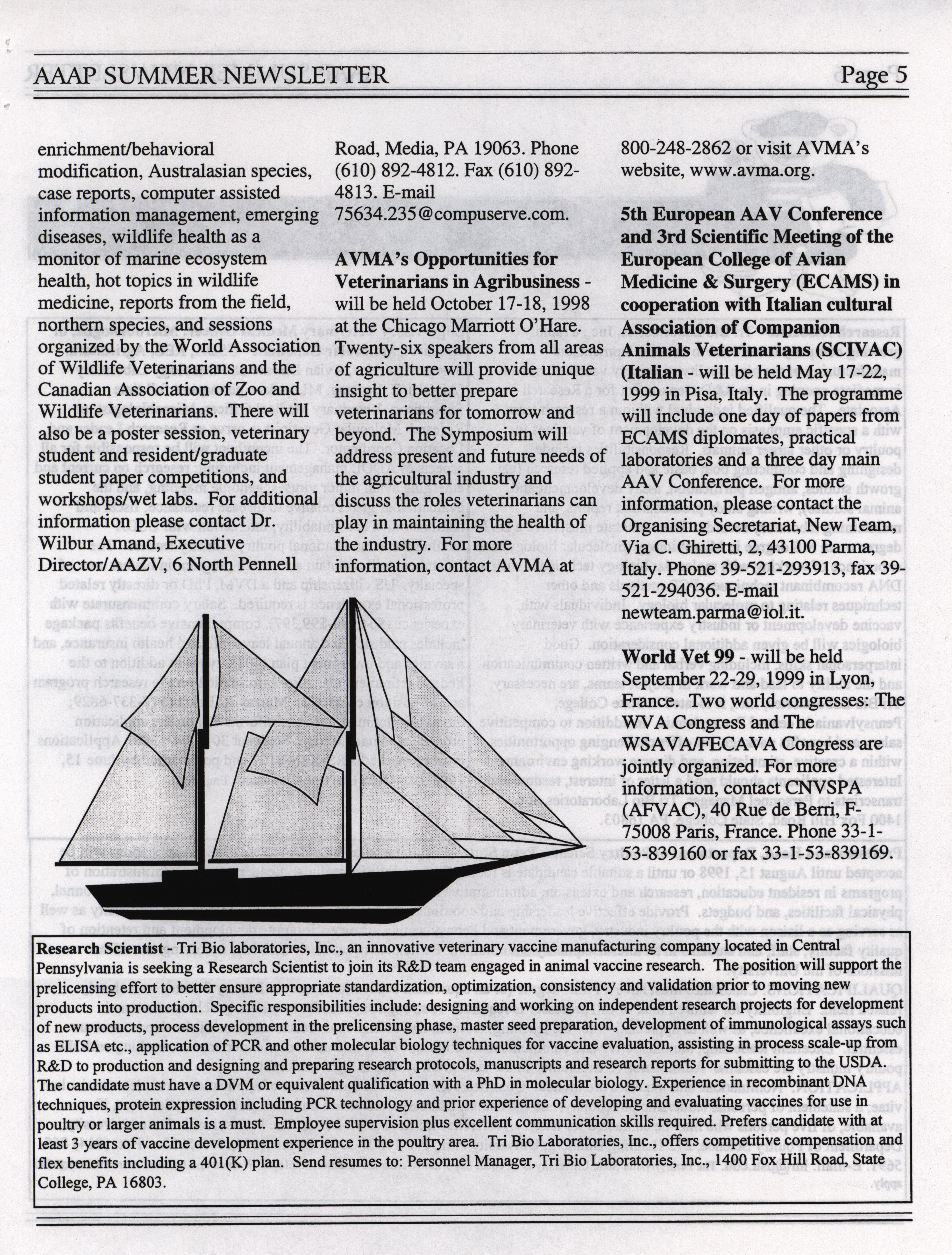 - The summer newsletter of the American Association of Avian Pathologists, May 1998. The quarterly newsletter features several different topics, including annual meeting information, the AVMA (American Veterinary Medical Association)/AAAP scientific program, and committee meetings.