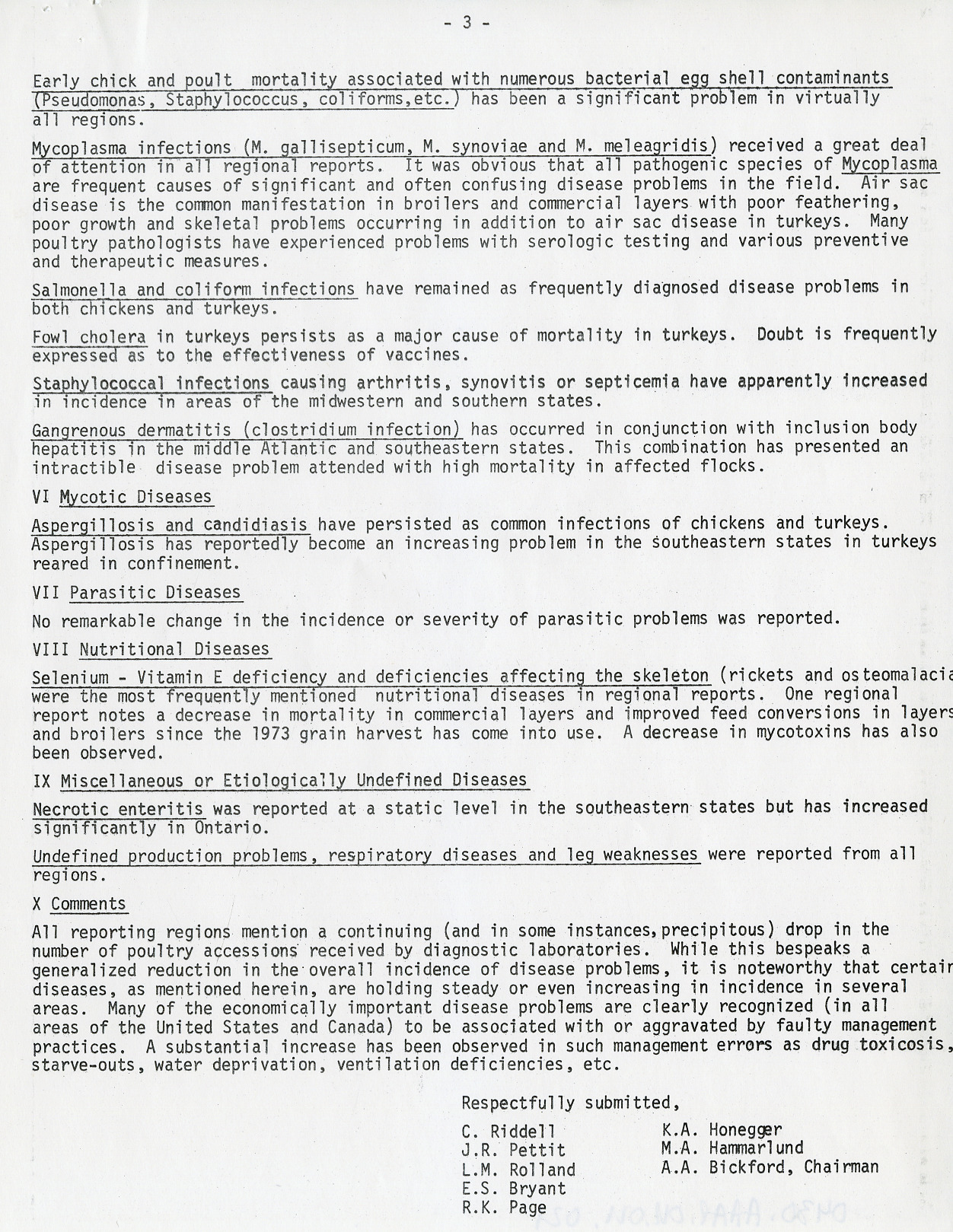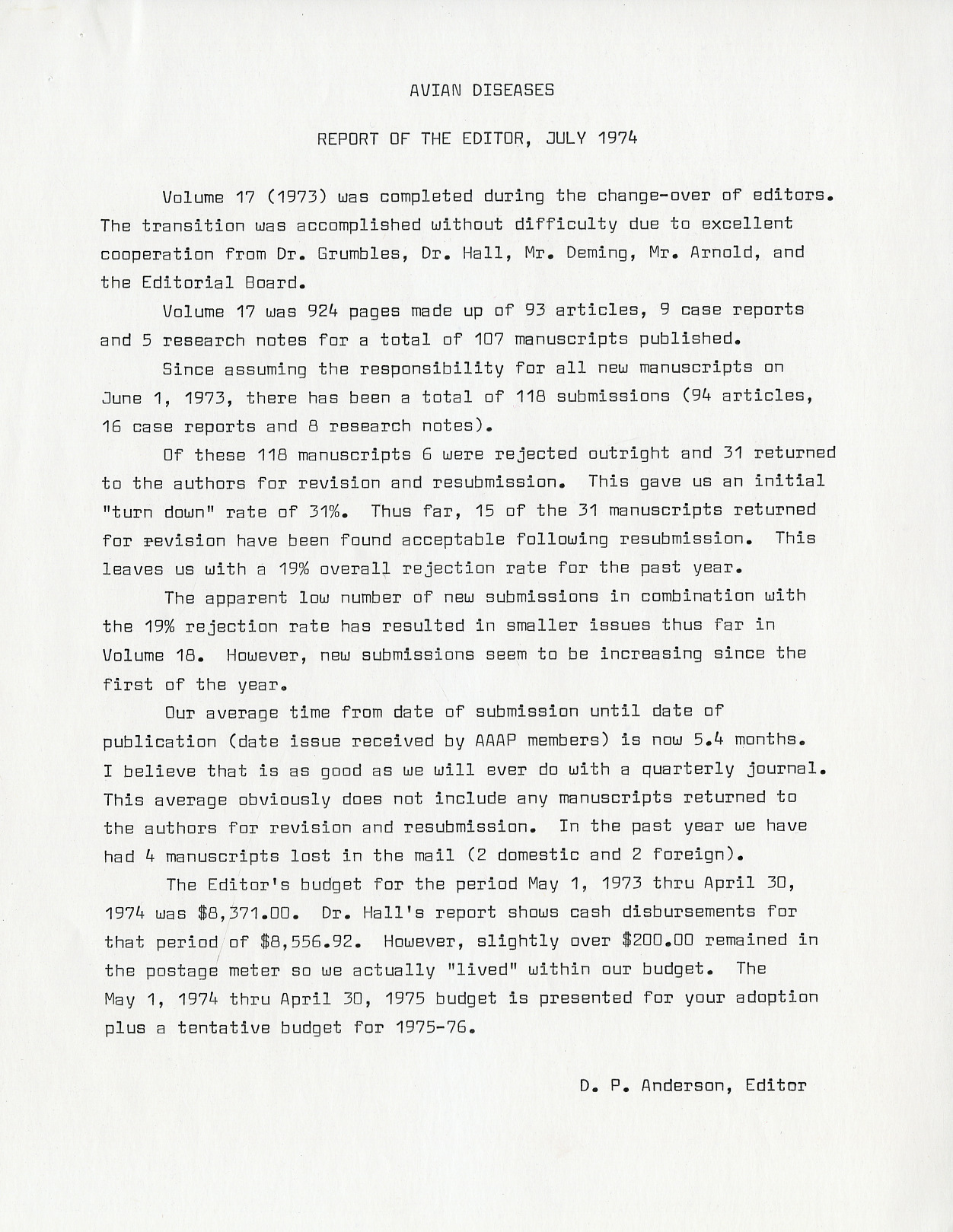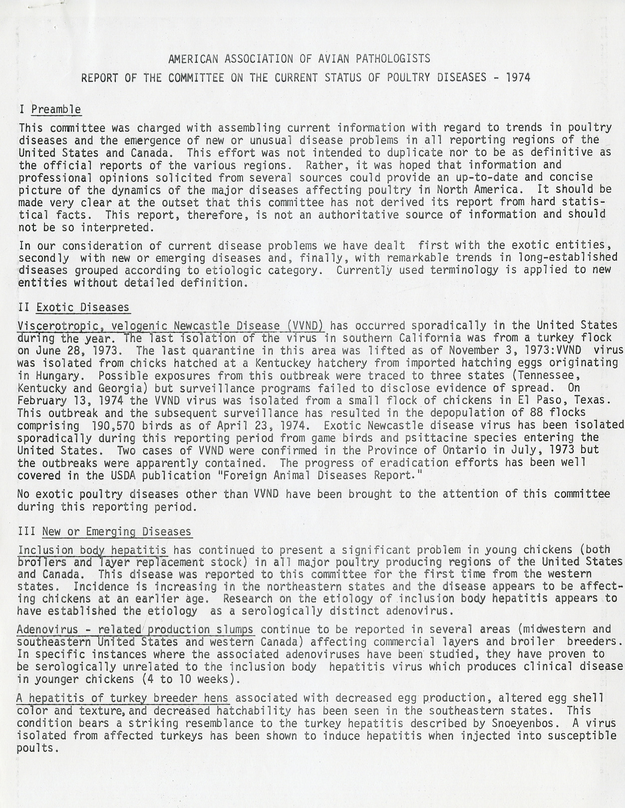 - "Avian diseases: report of the editor, July 1974", American Association of Avian Pathologists Collection, Iowa State University Library Digital Collections