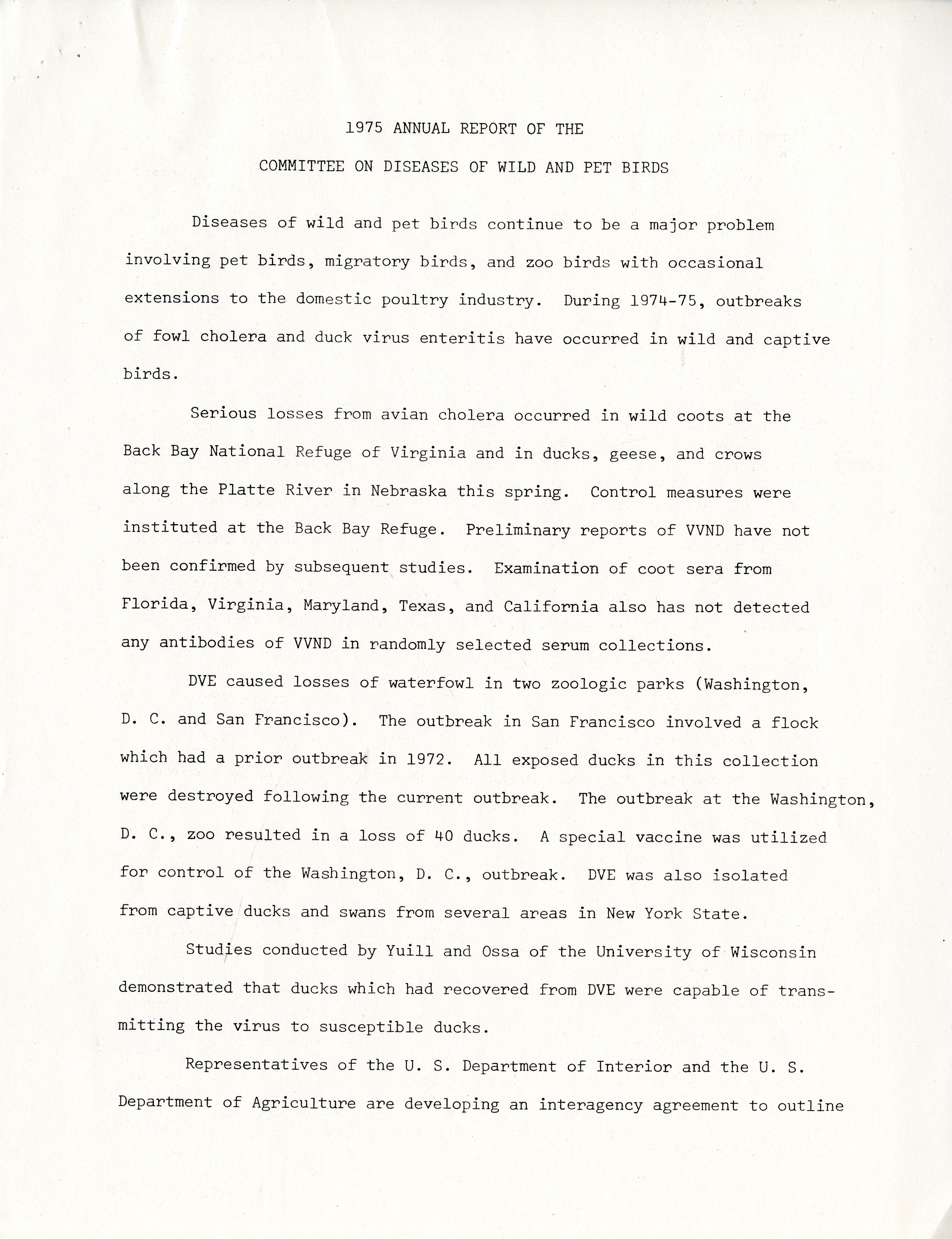 - Annual report of the diseases of wild and pet birds committee, 1975