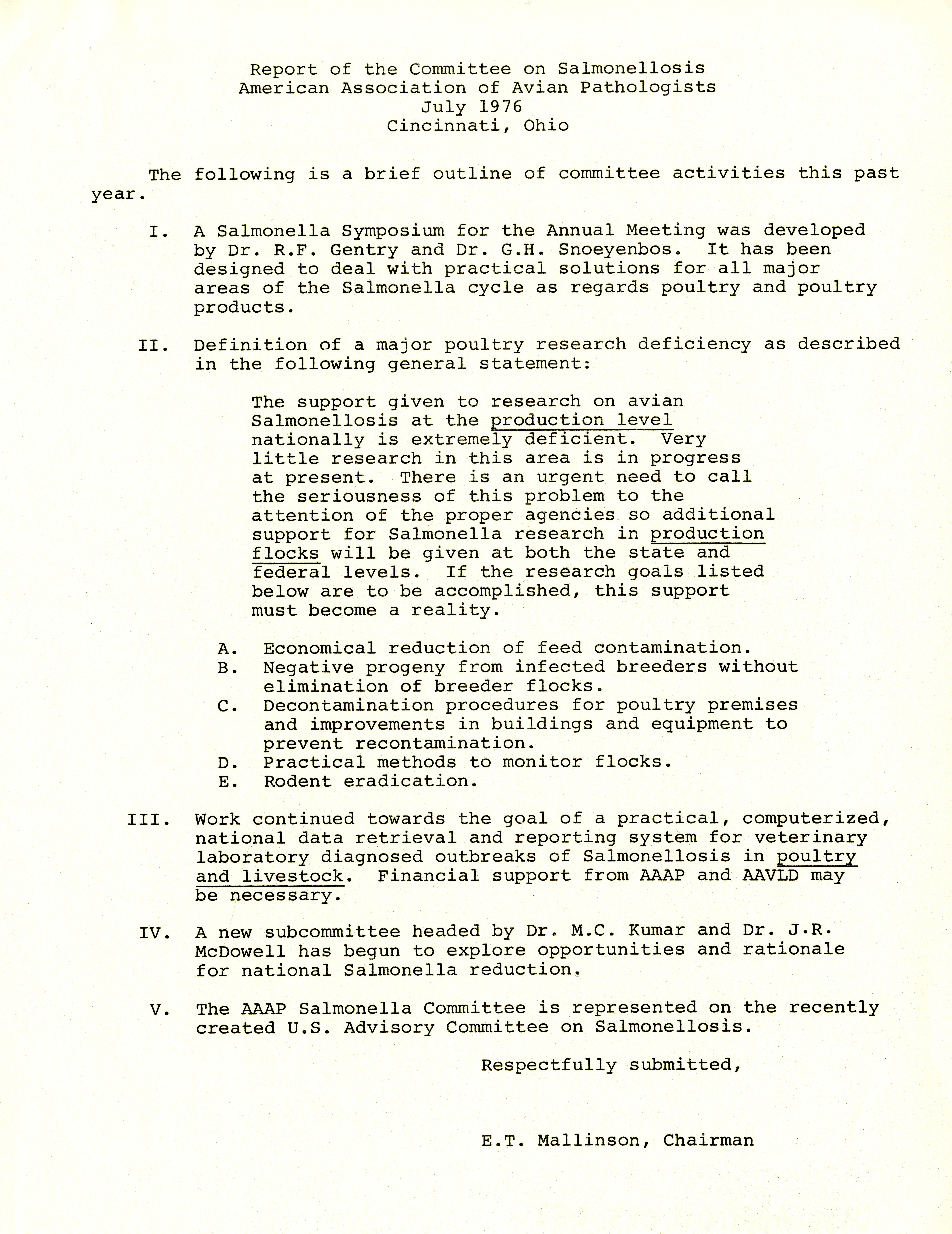 - "AAAP report of the salmonellosis committee, July 1976", American Association of Avian Pathologists Collection, Iowa State University Library Digital Collections