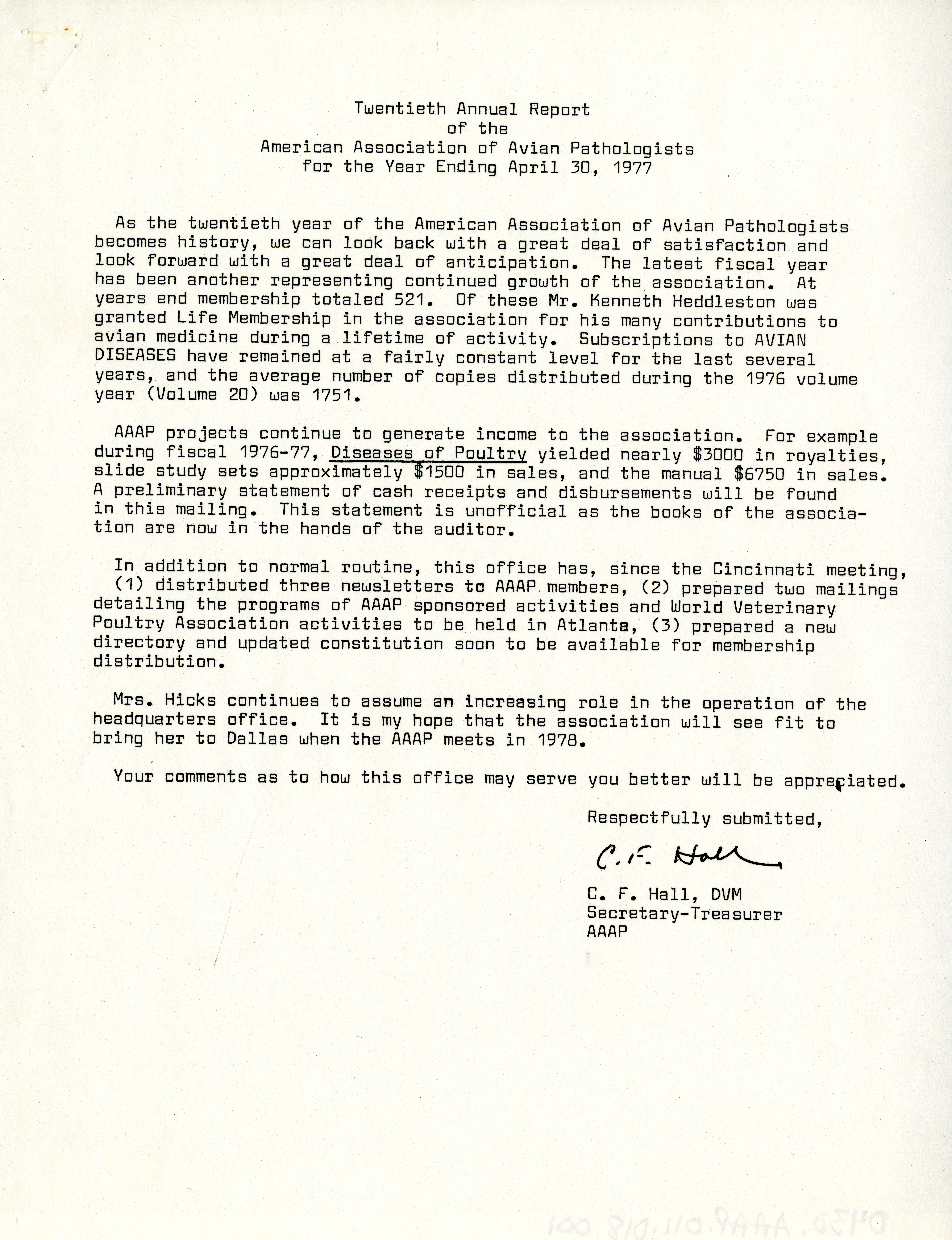 - "AAAP twentieth annual report year ending April 30, 1977", American Association of Avian Pathologists Collection, Iowa State University Library Digital Collections