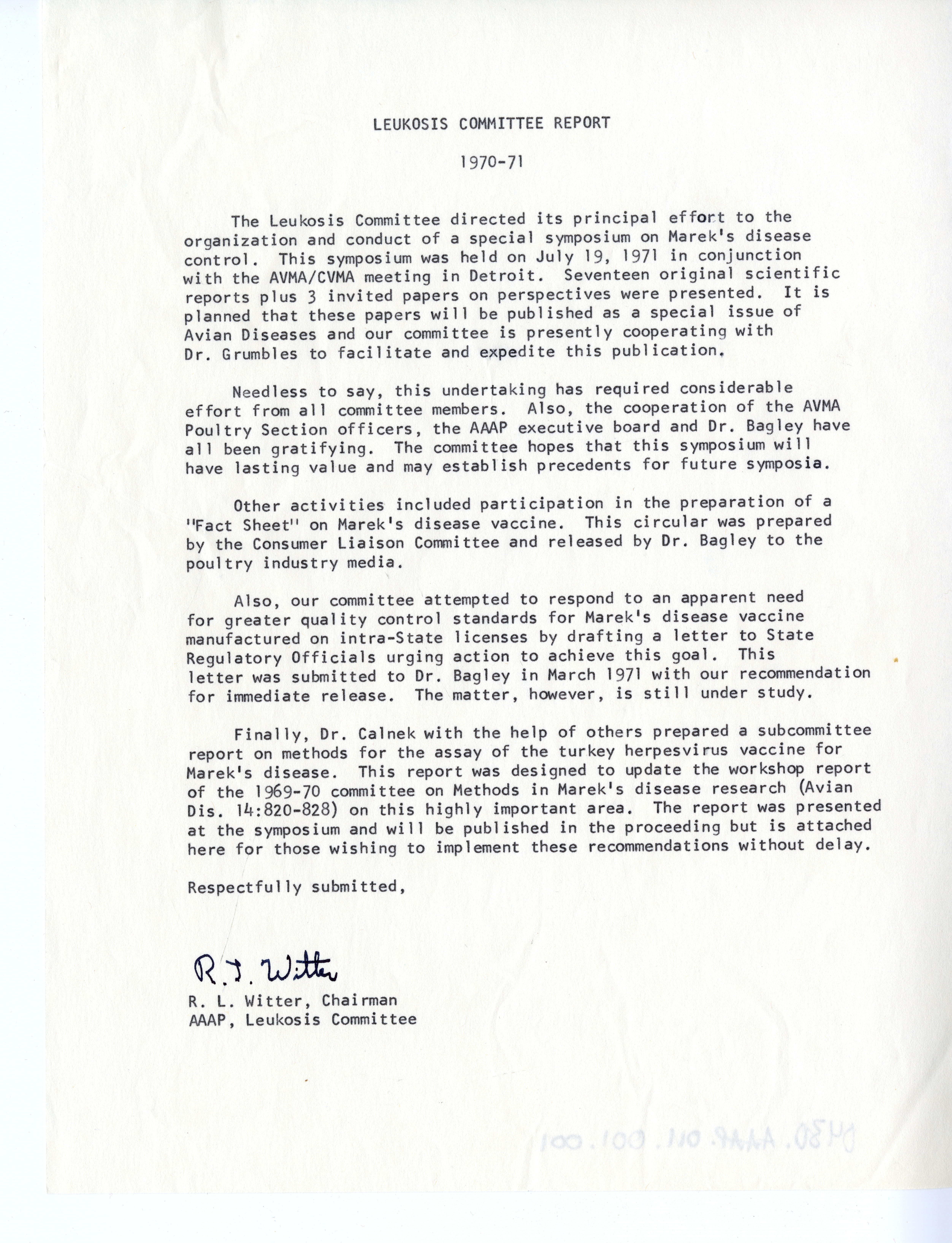 - "Leukosis committee report 1970-1971", American Association of Avian Pathologists Collection, Iowa State University Library Digital Collections