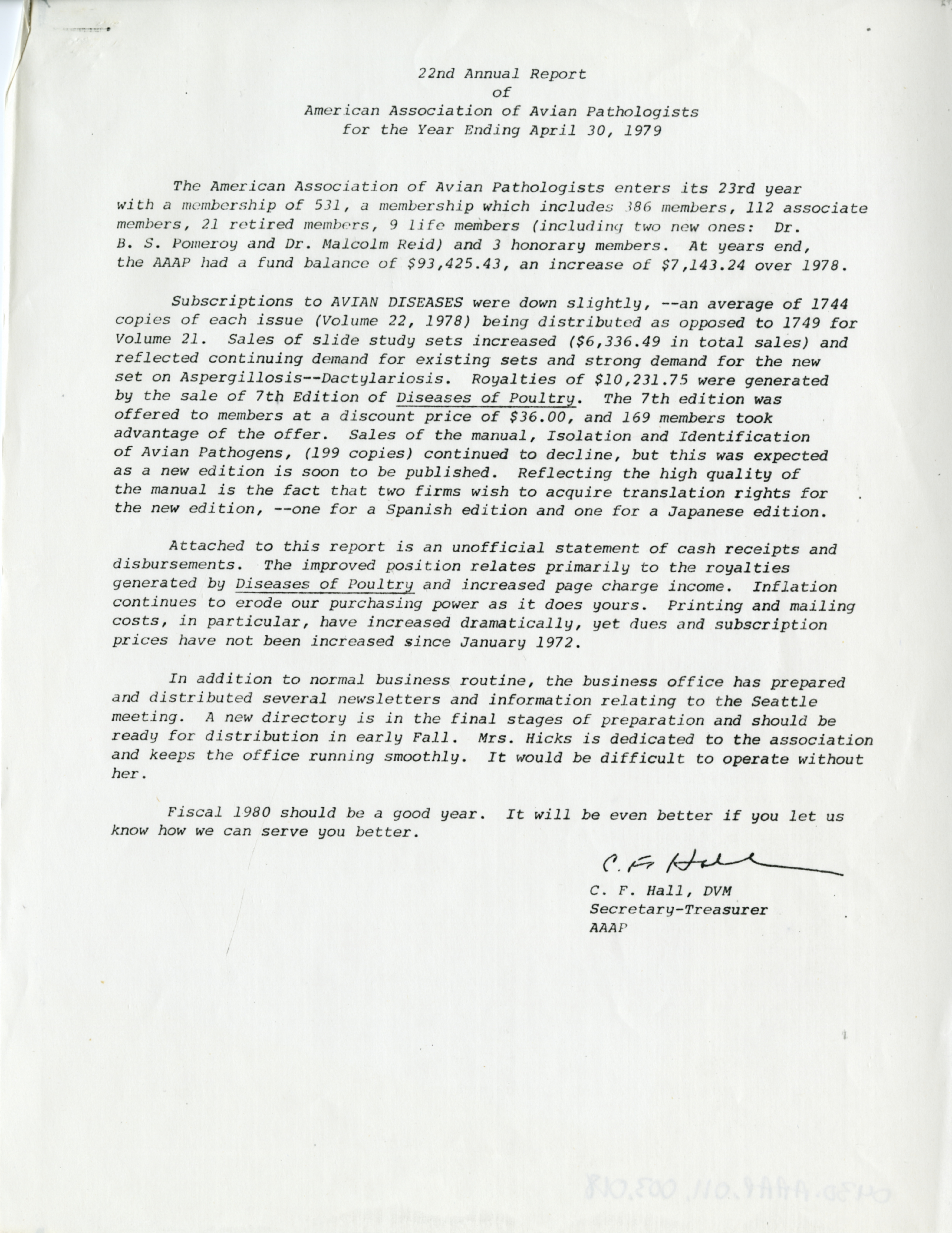 - "AAAP 22nd annual report, April 30, 1979", American Association of Avian Pathologists Collection, Iowa State University Library Digital Collections