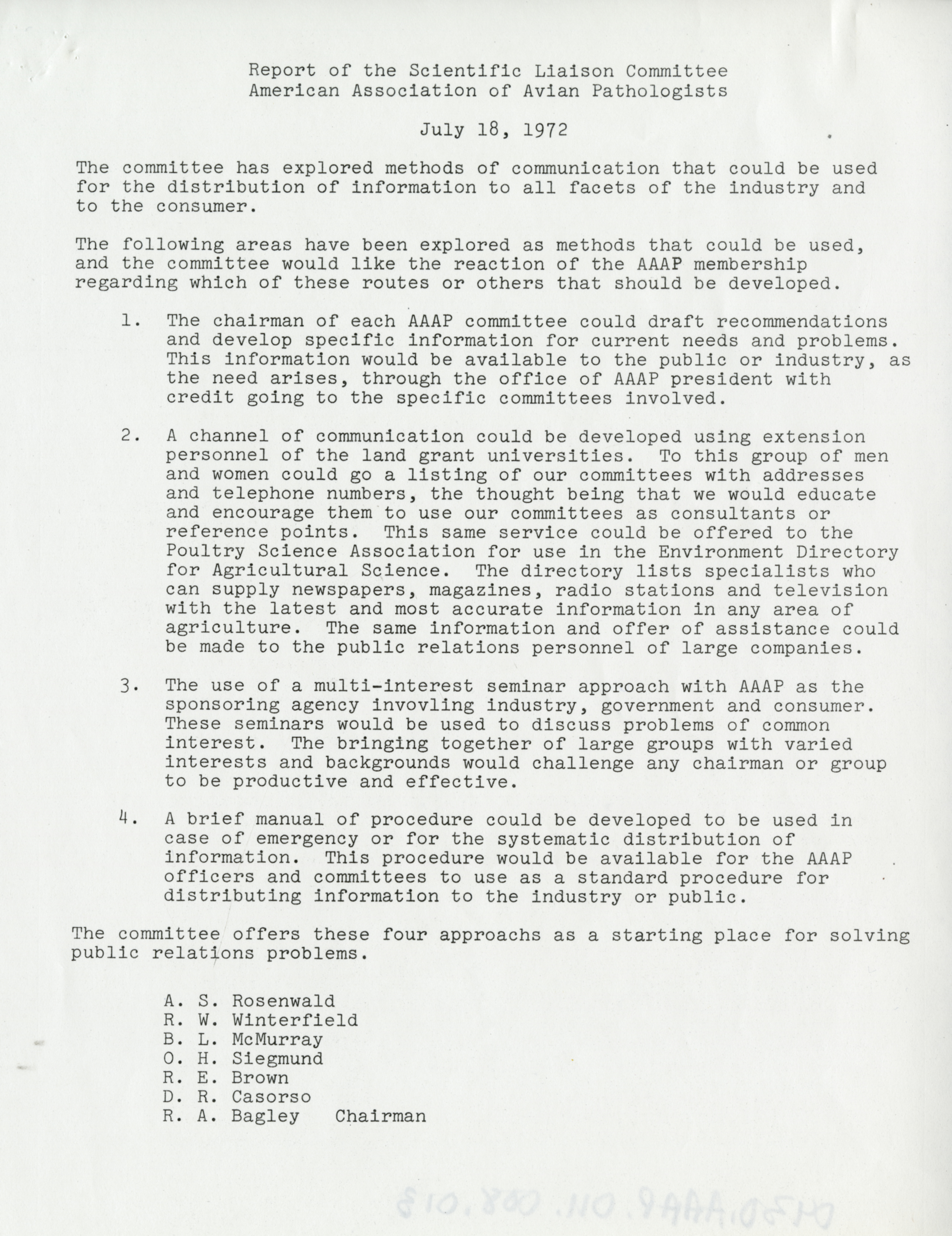- "AAAP report of the scientific liaison committee, July 18, 1972", American Association of Avian Pathologists Collection, Iowa State University Library Digital Collections