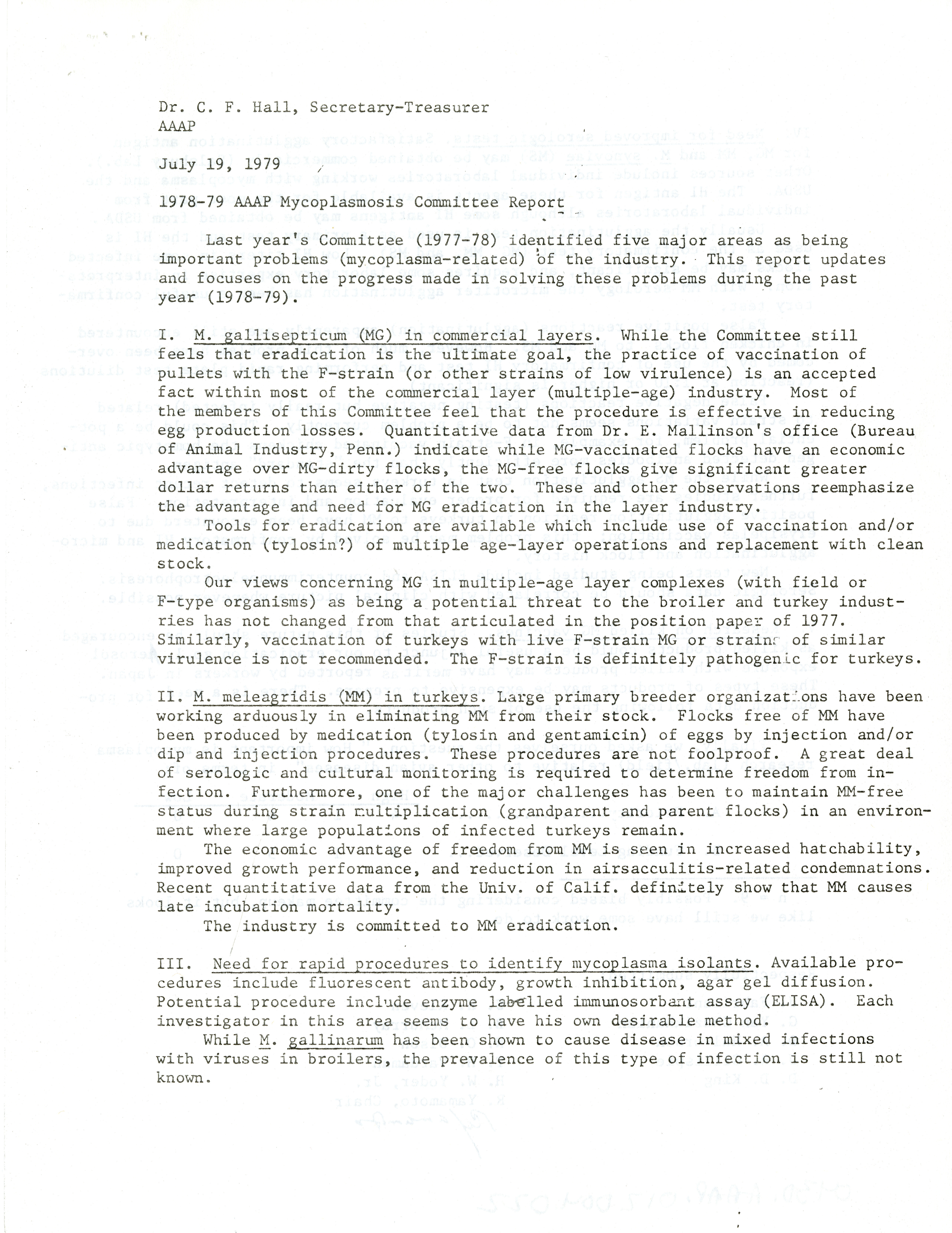 - "AAAP mycoplasmosis committee report, July 19, 1979", American Association of Avian Pathologists Collection, Iowa State University Library Digital Collections