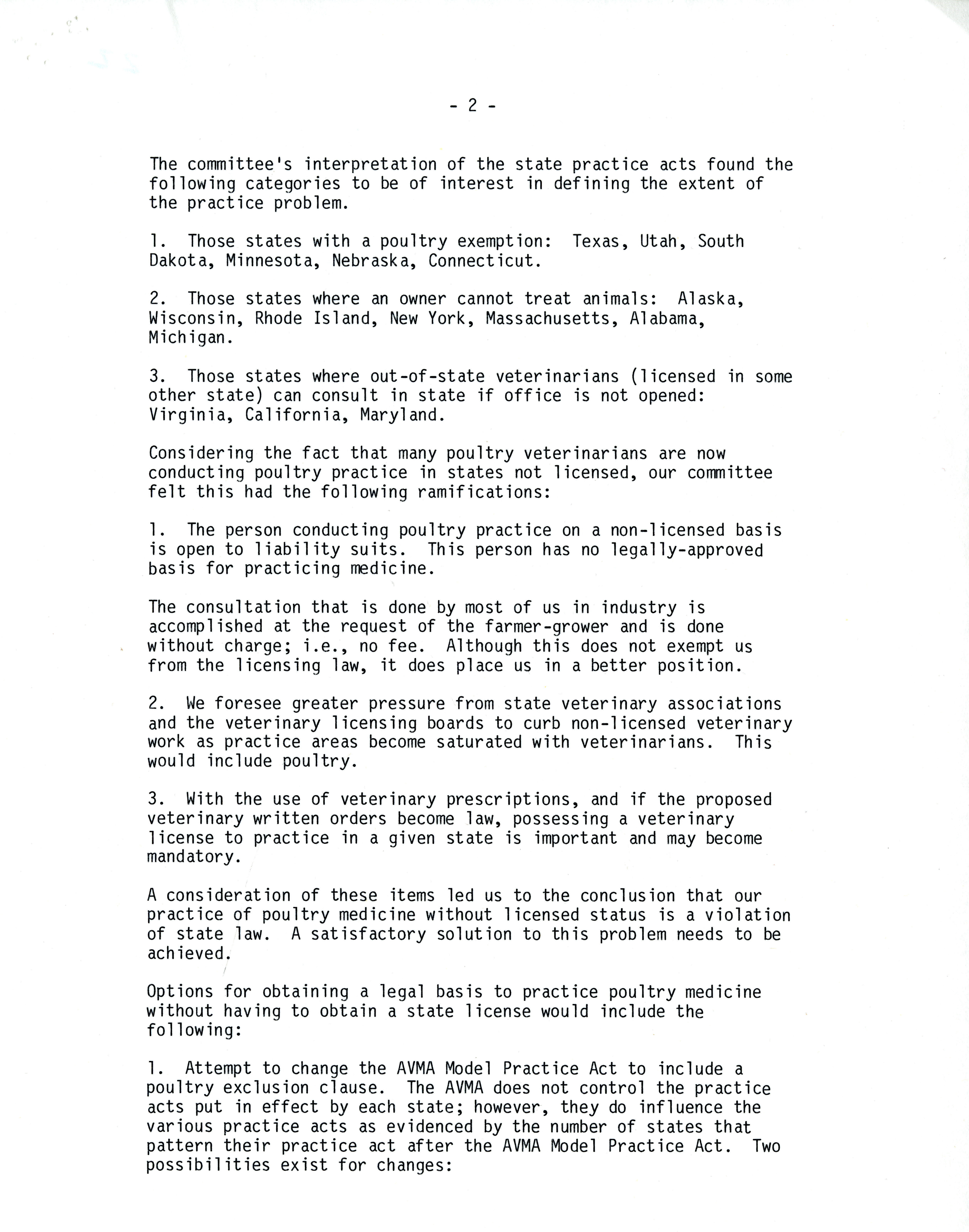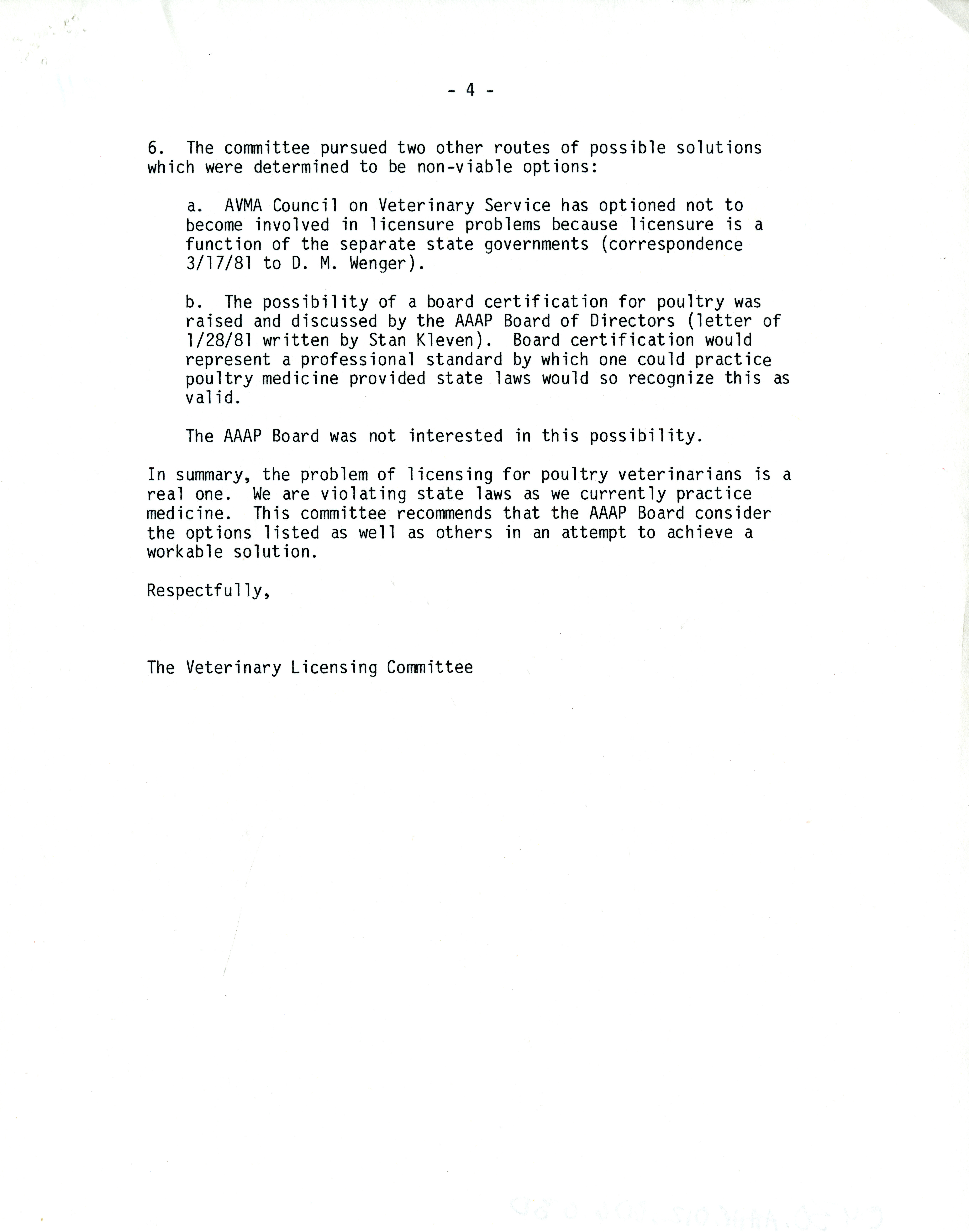 - "AAAP veterinary licensing committee report, May 22, 1981", American Association of Avian Pathologists Collection, Iowa State University Library Digital Collections