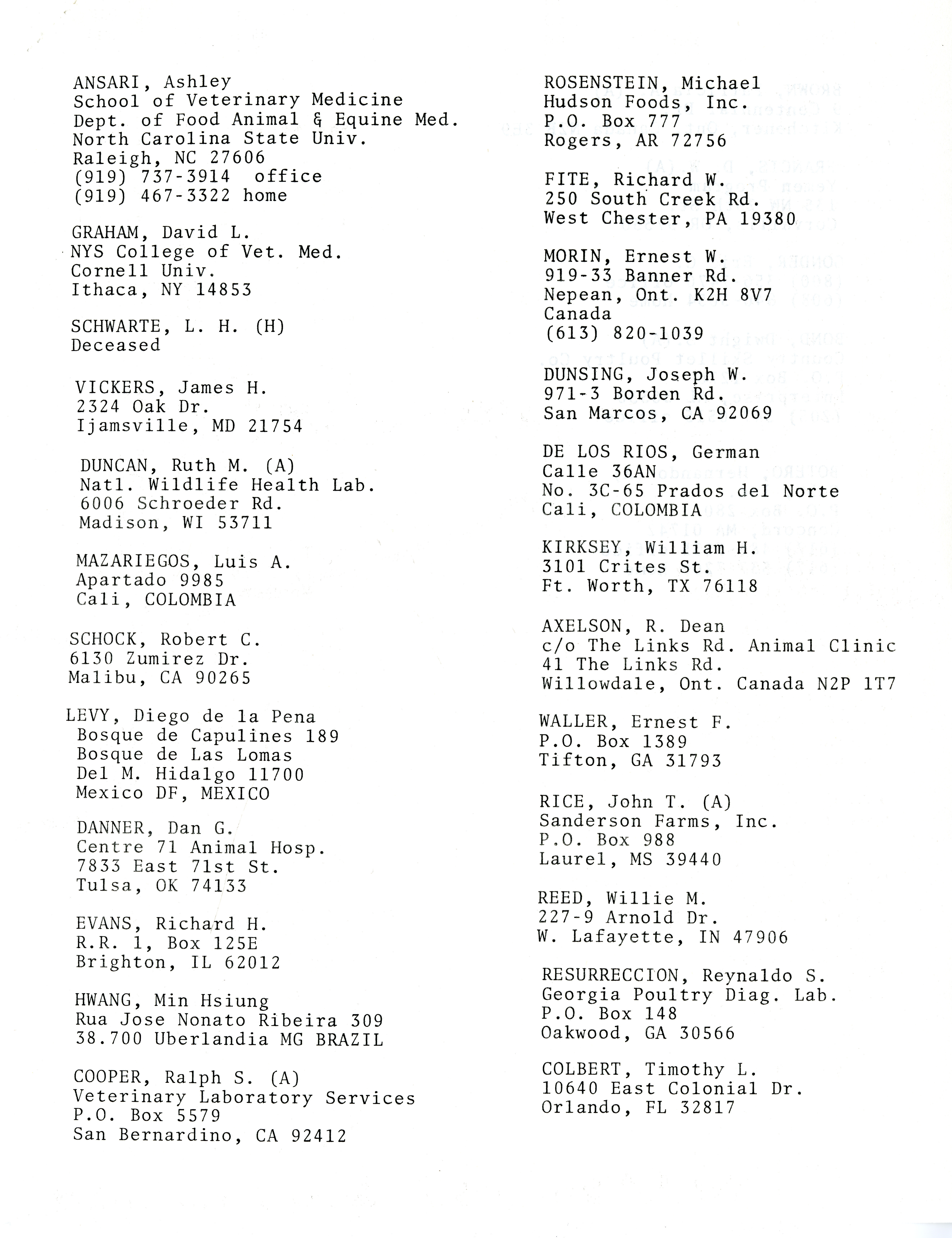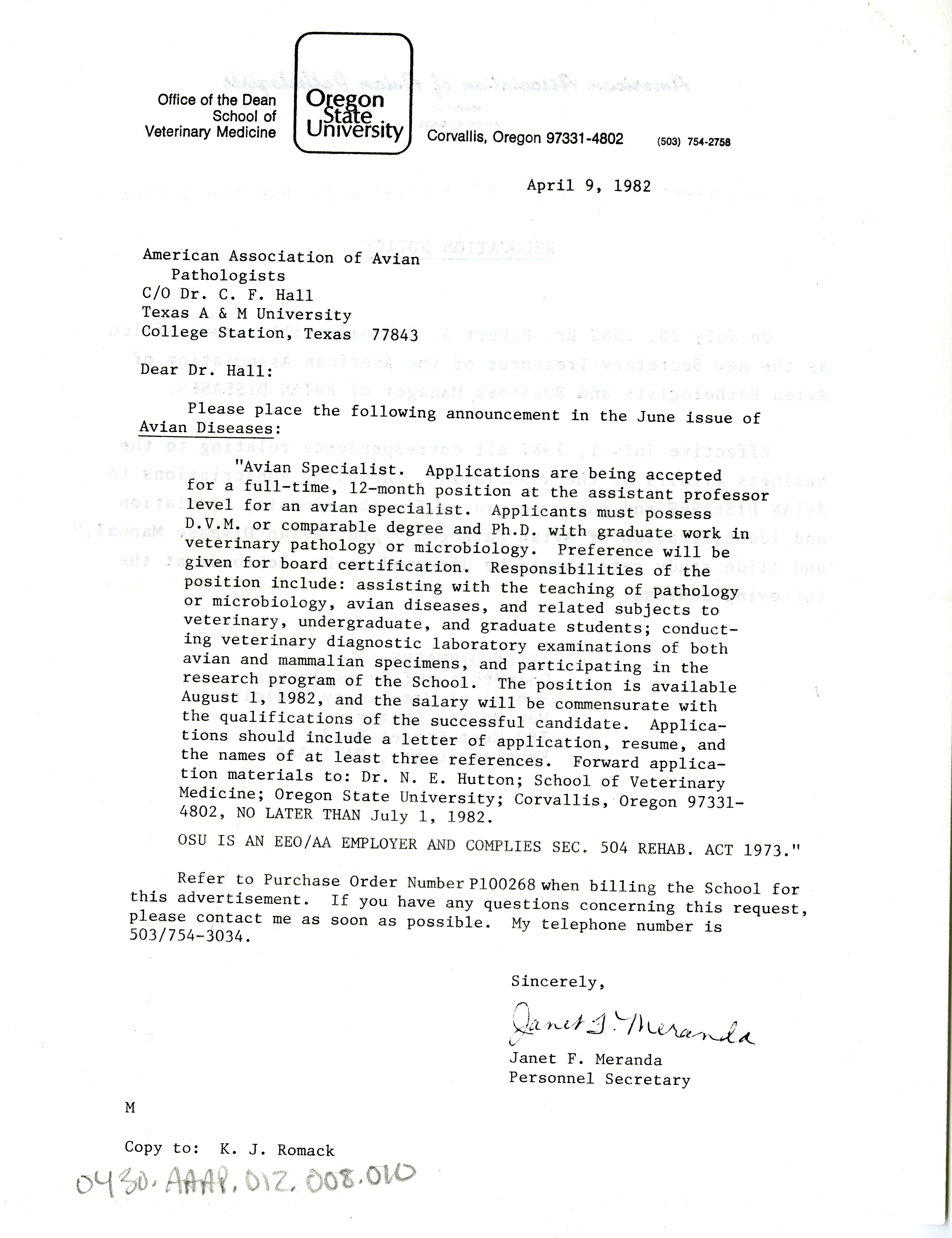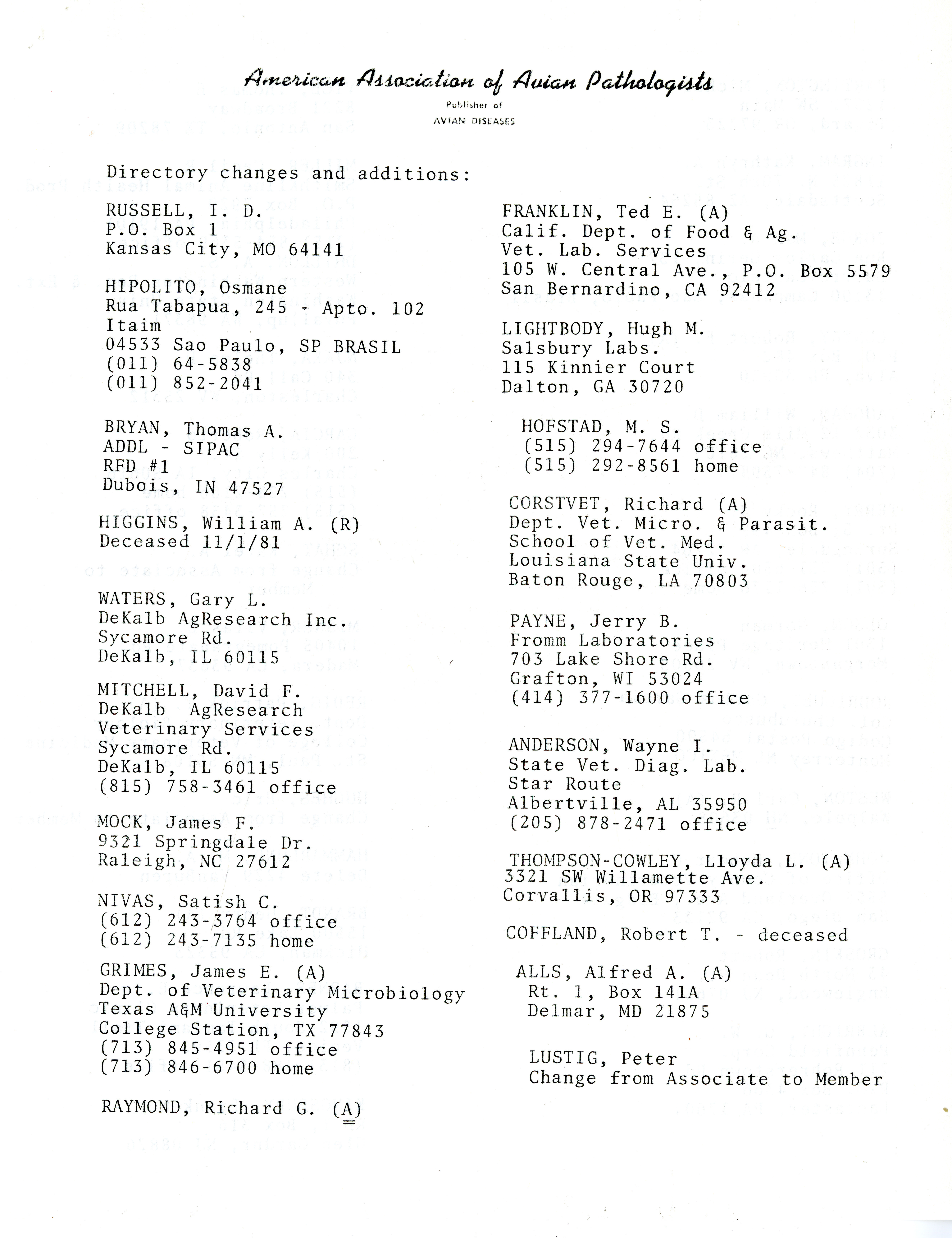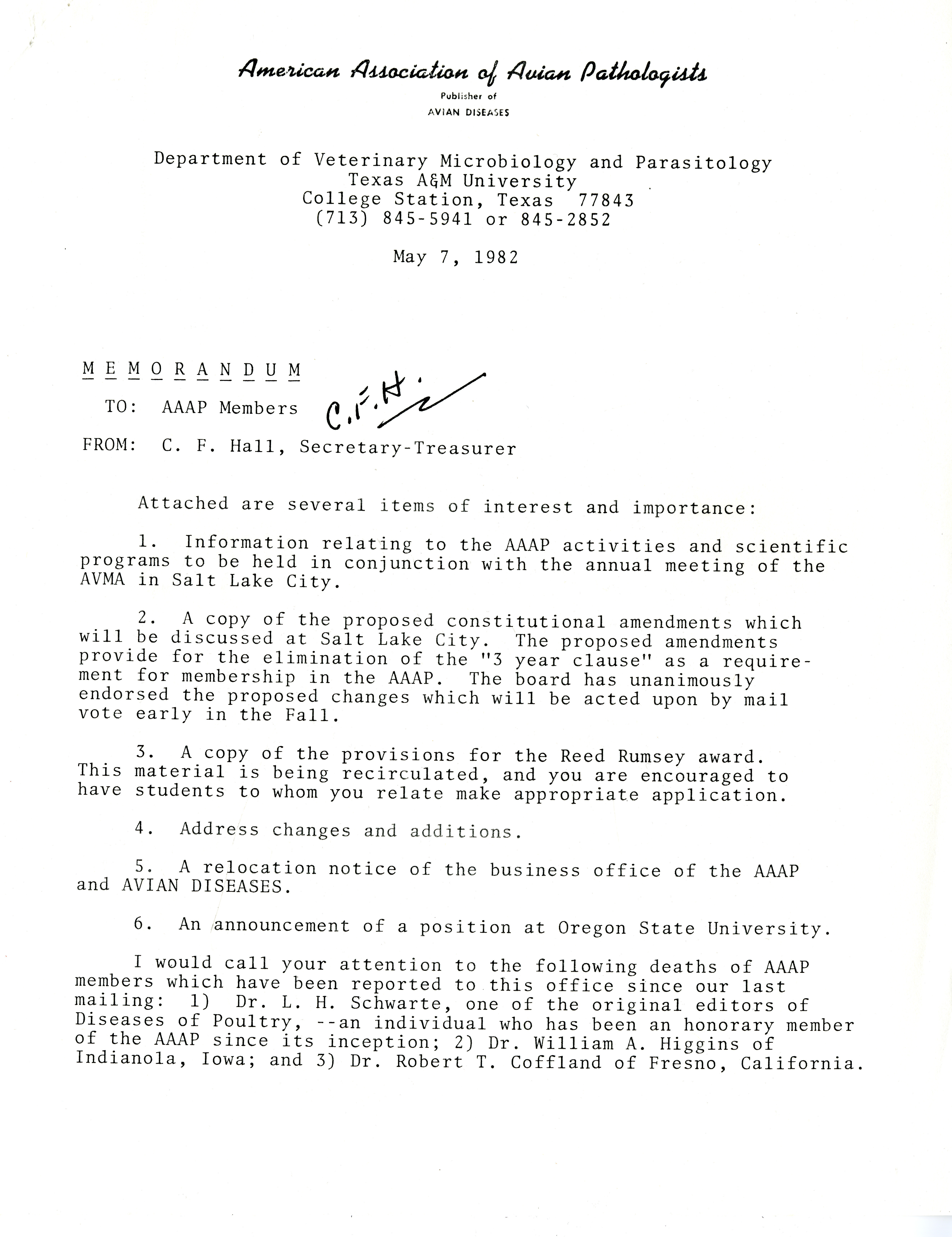 - "C. F. Hall memorandum to AAAP members, May 7, 1982", American Association of Avian Pathologists Collection, Iowa State University Library Digital Collections