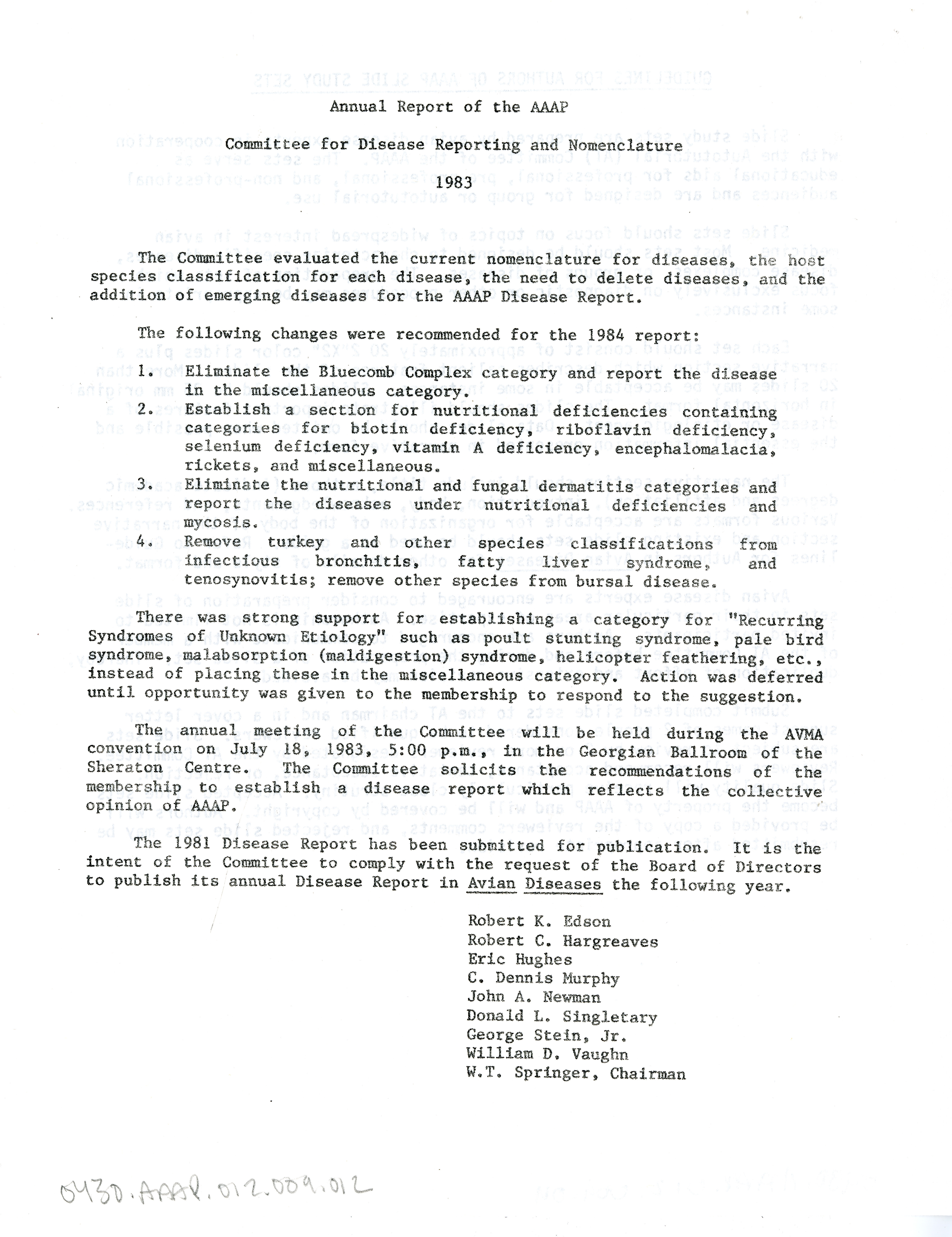 - "AAAP committee for disease reporting and nomenclature annual report, 1983", American Association of Avian Pathologists Collection, Iowa State University Library Digital Collections