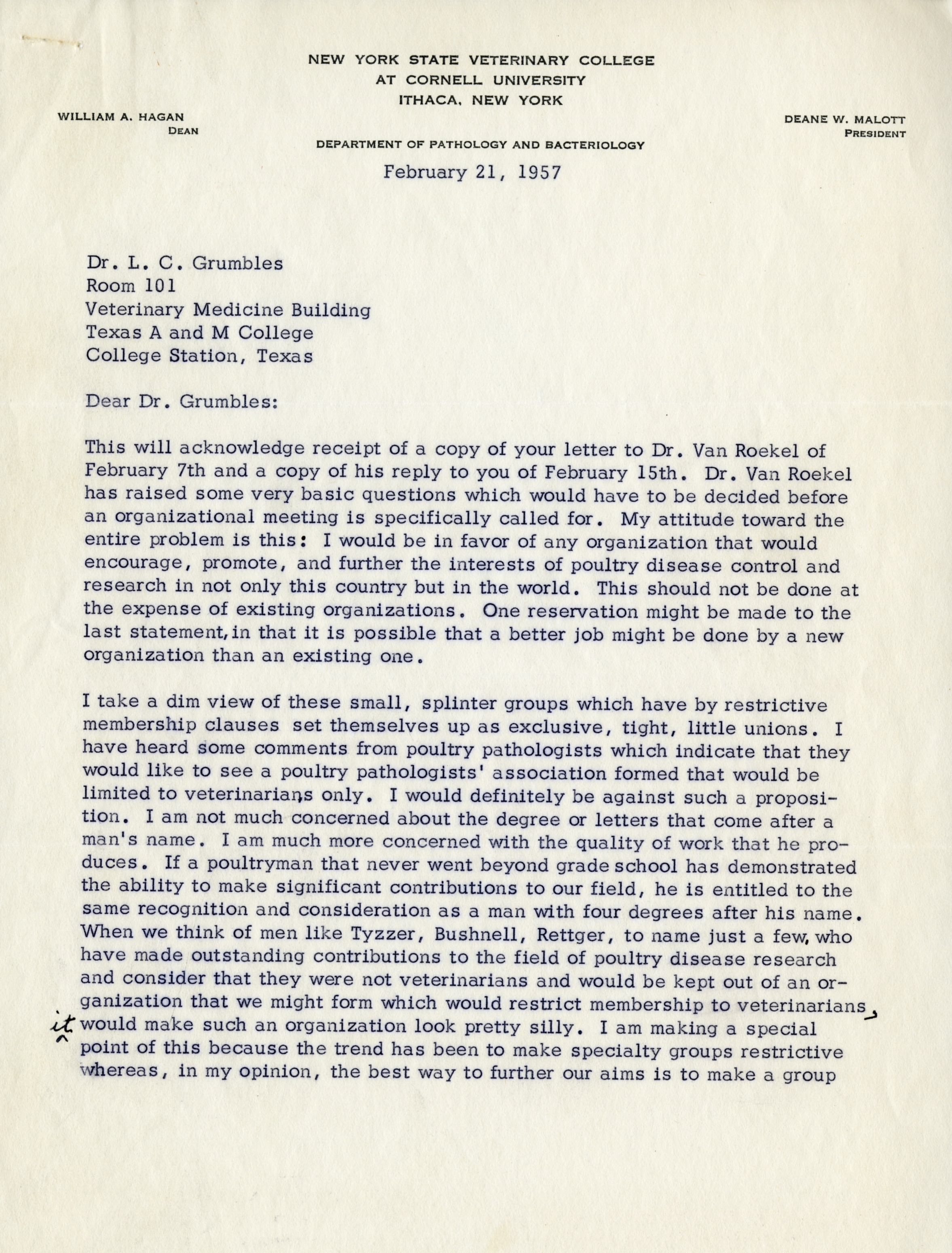 - "P. P. Levine letter to L. C. Grumbles, February 21, 1957", American Association of Avian Pathologists Collection, Iowa State University Library Digital Collections