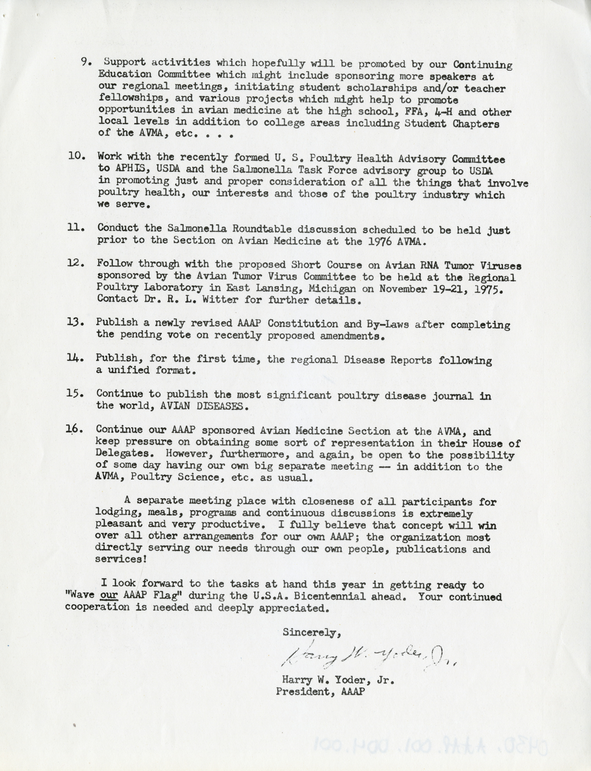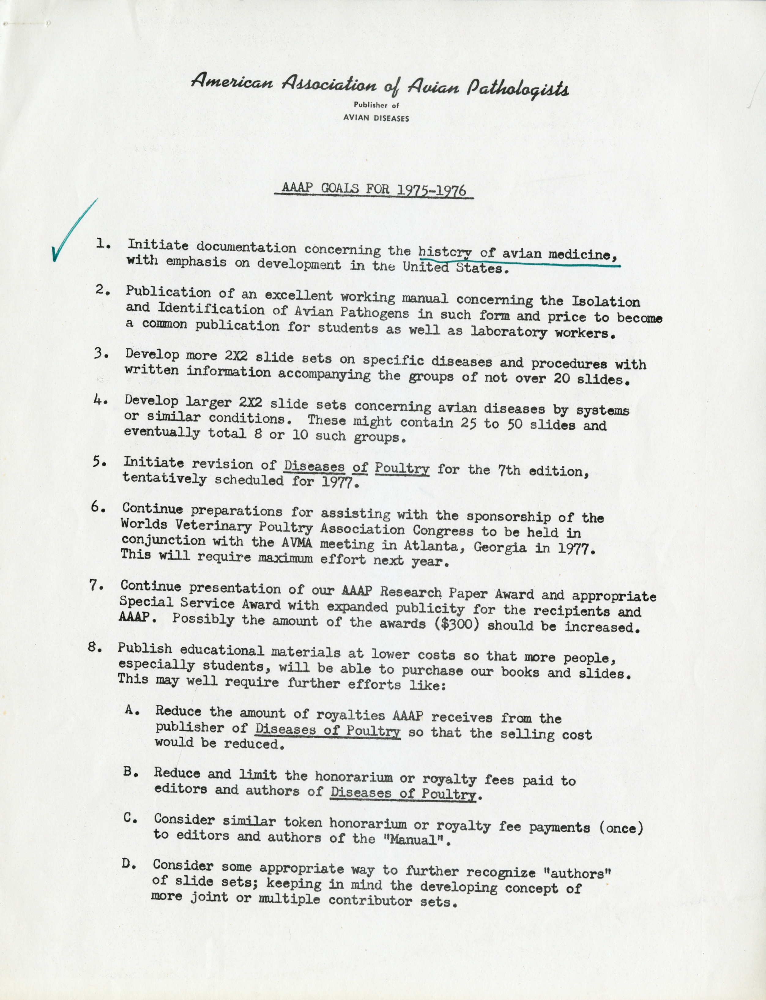 - "AAAP goals for 1975-1976", American Association of Avian Pathologists Collection, Iowa State University Library Digital Collections