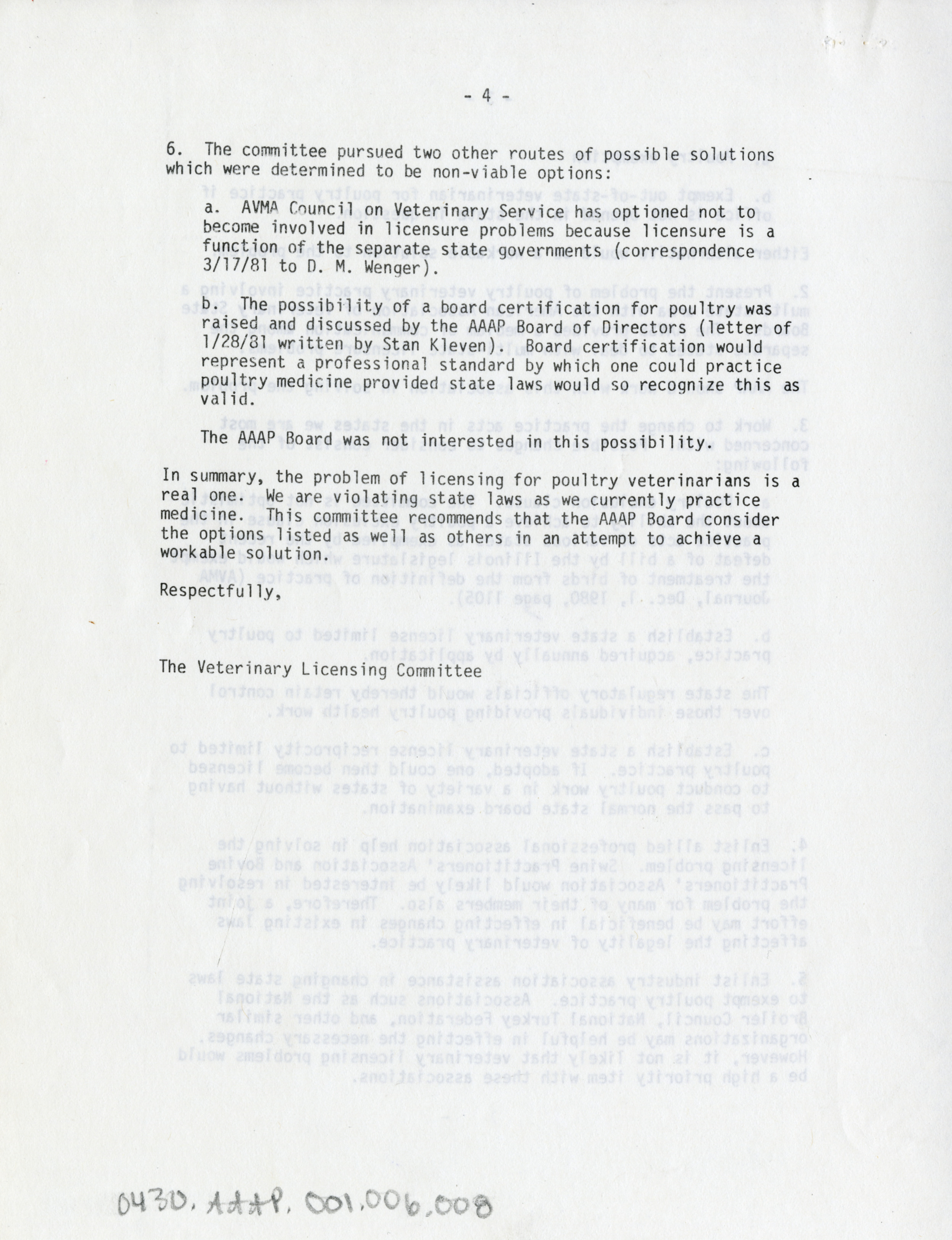 - "AAAP veterinary licensing committee report, May 22, 1981", American Association of Avian Pathologists Collection, Iowa State University Library Digital Collections