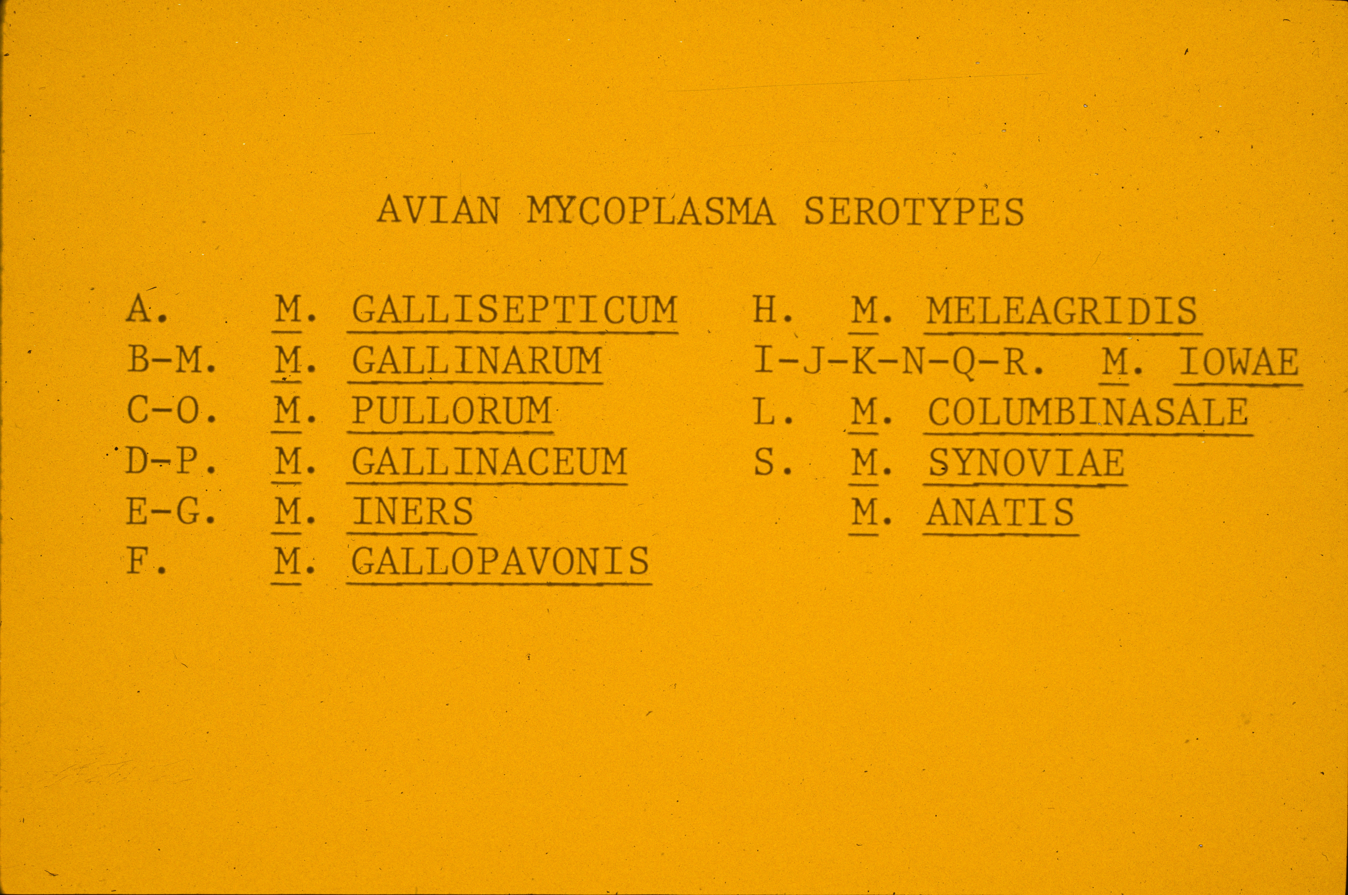 - "Mycoplasma gallisepticum infection (slide study set no. 11)", American Association of Avian Pathologists Collection, Iowa State University Library Digital Collections