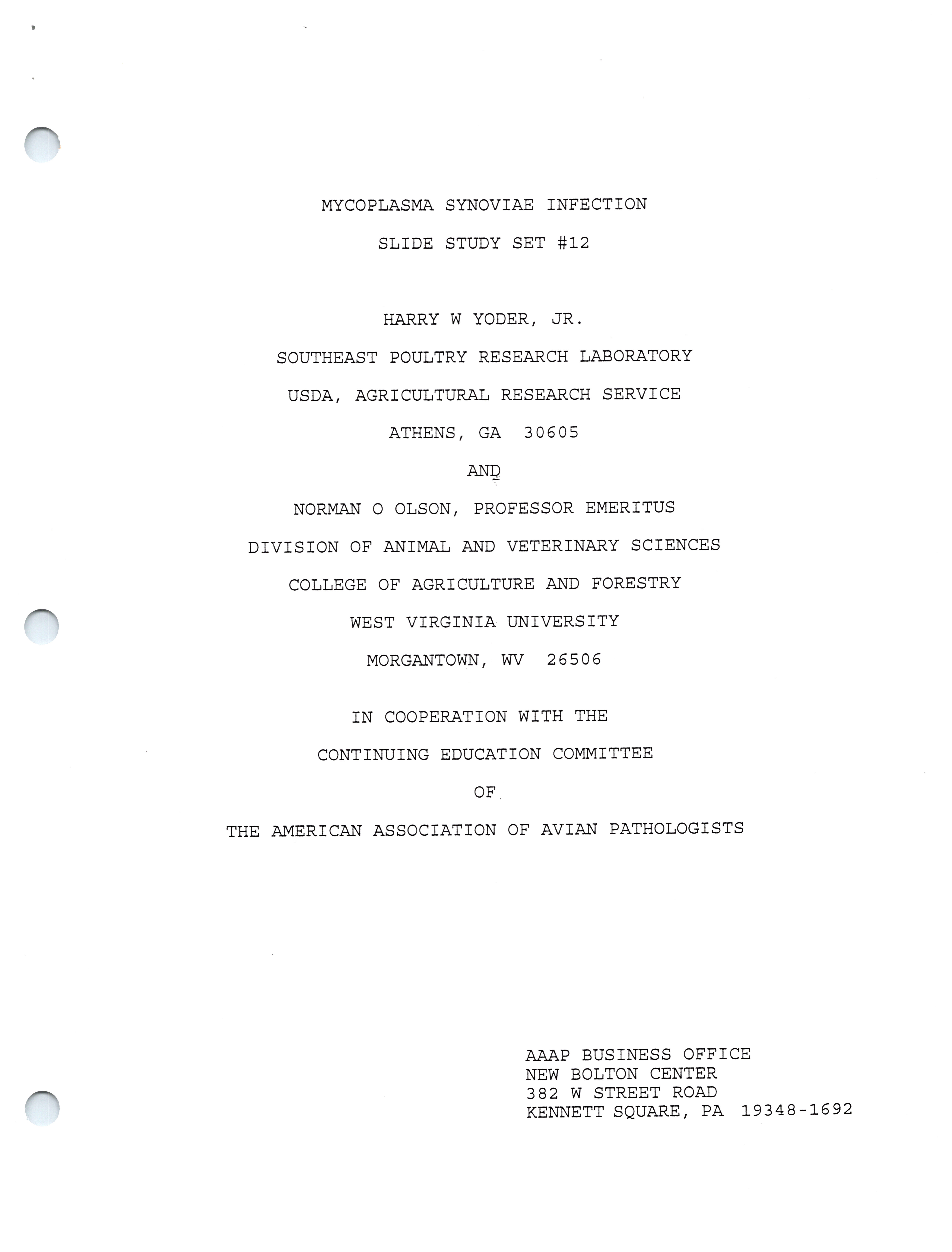 - Slide study set #12, mycoplasma synoviae infection, 2 sets (includes 40 color slides), 1983