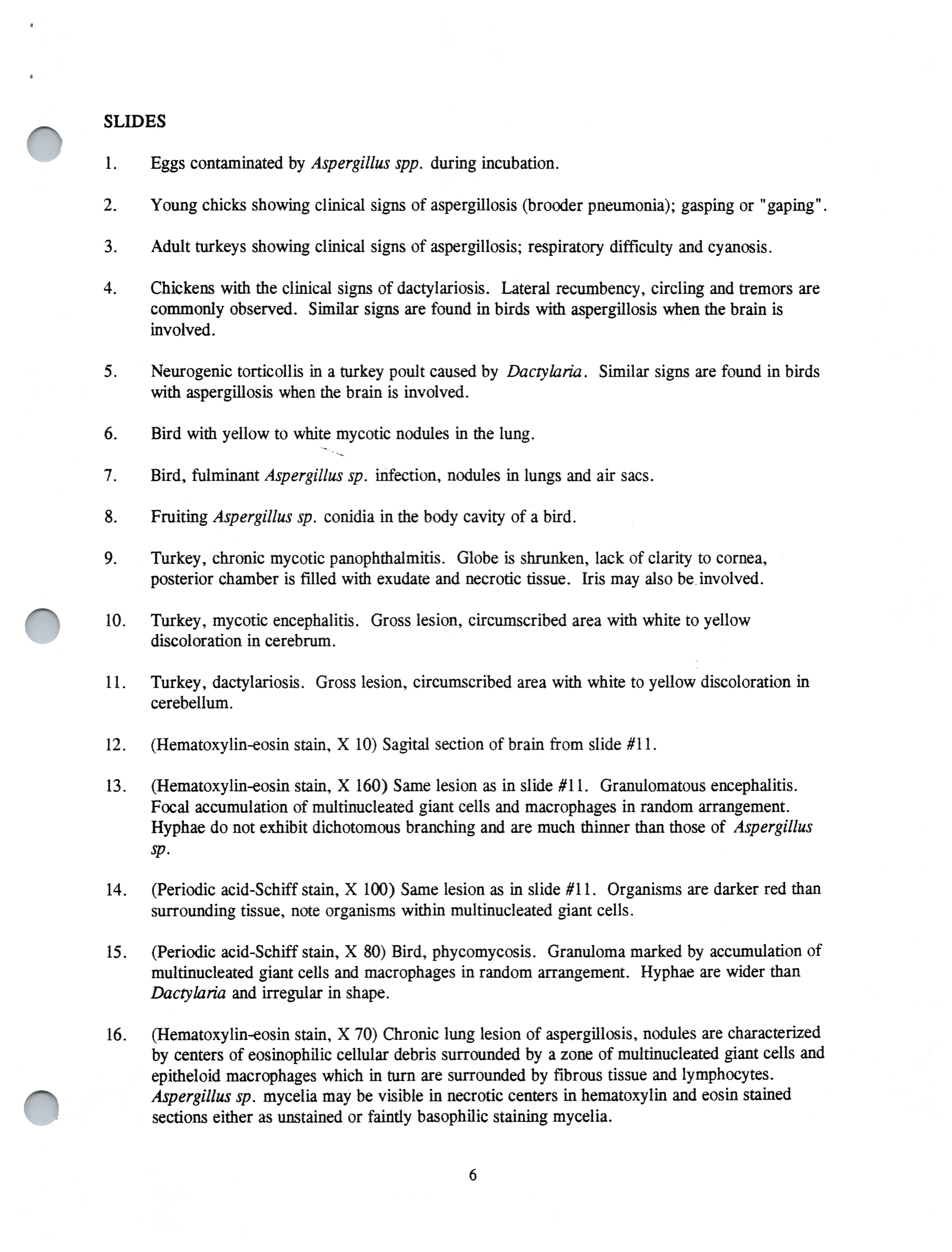 - Item from a series of AAAP records containing slide study sets which consist of slides and their accompanying texts. The slide study sets mainly cover poultry diseases and their diagnosis, but also include other topics such as biotechnology in avian medicine and careers in avian medicine. Annotation: Originally prepared as aspergillosis-dactylariosis in 1978