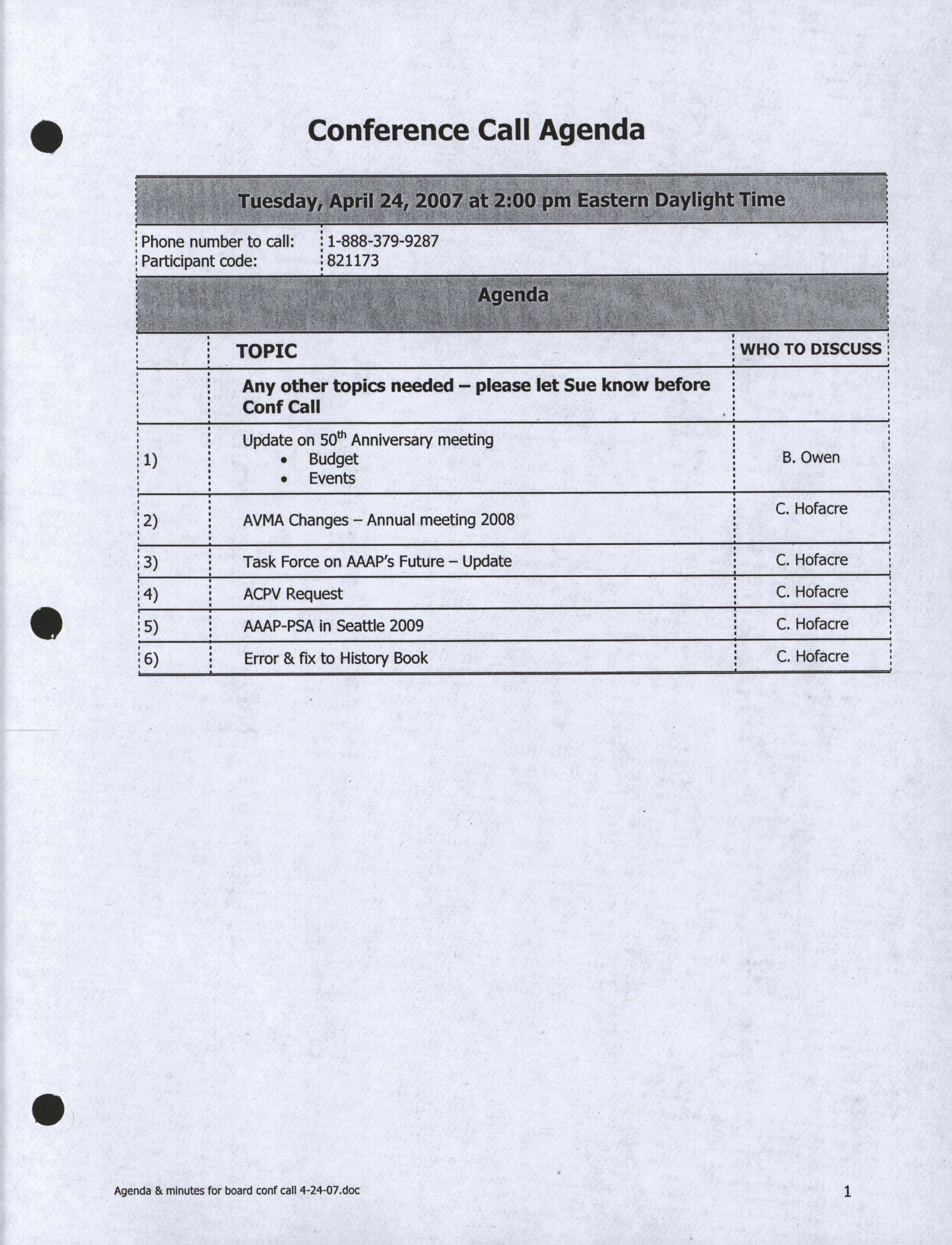 - Conference call agenda, April 24, 2007