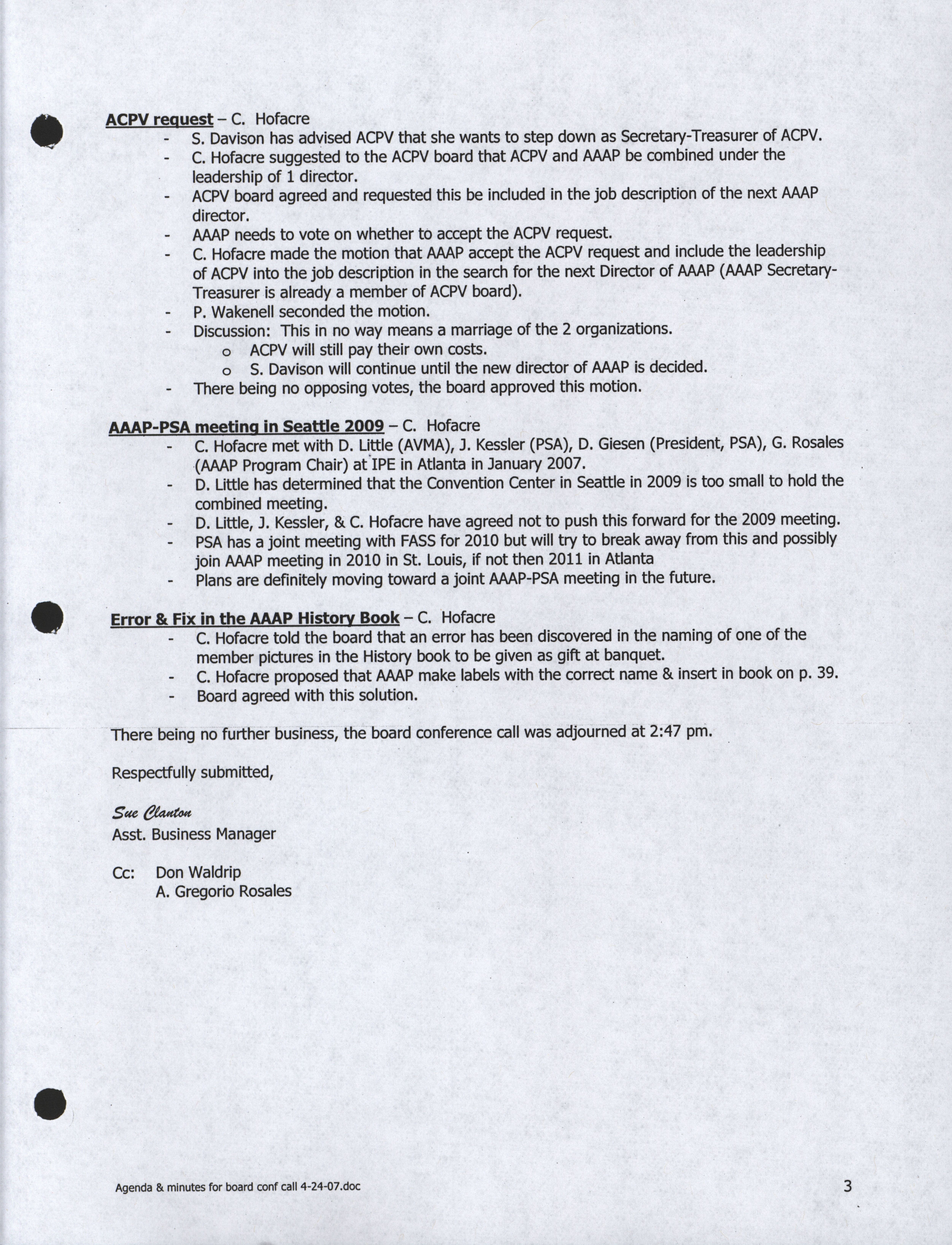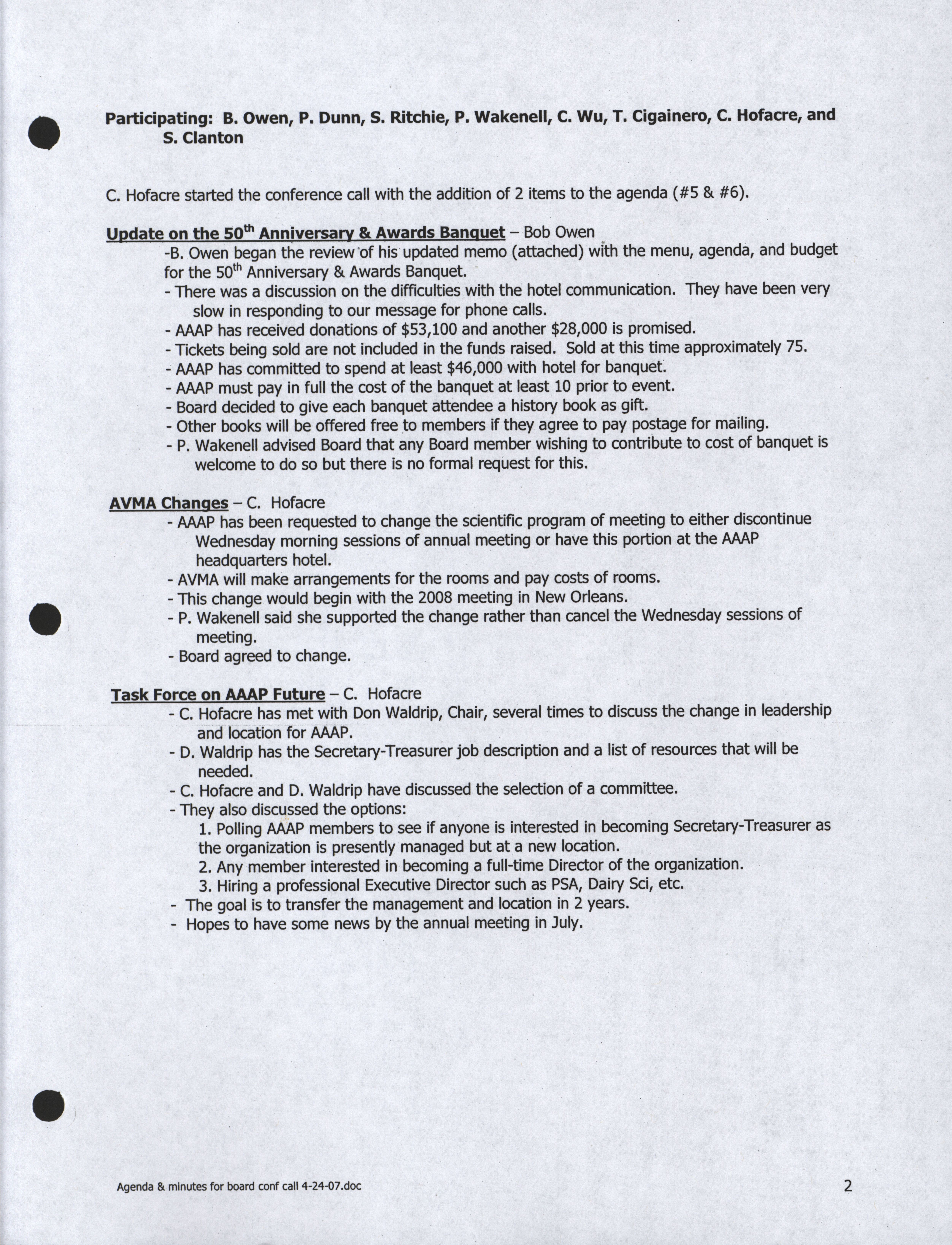 - "Conference call agenda, April 24, 2007", American Association of Avian Pathologists Collection, Iowa State University Library Digital Collections