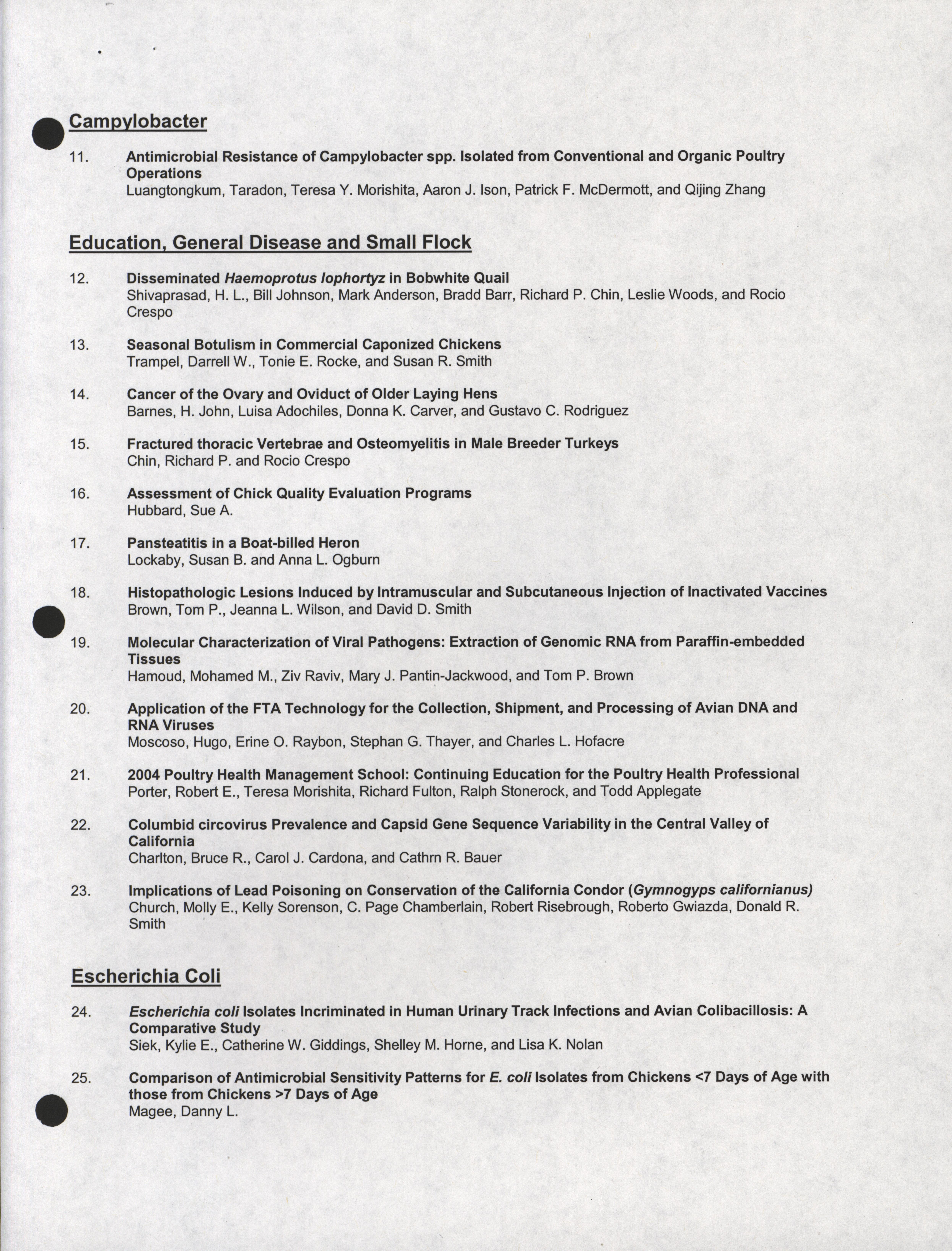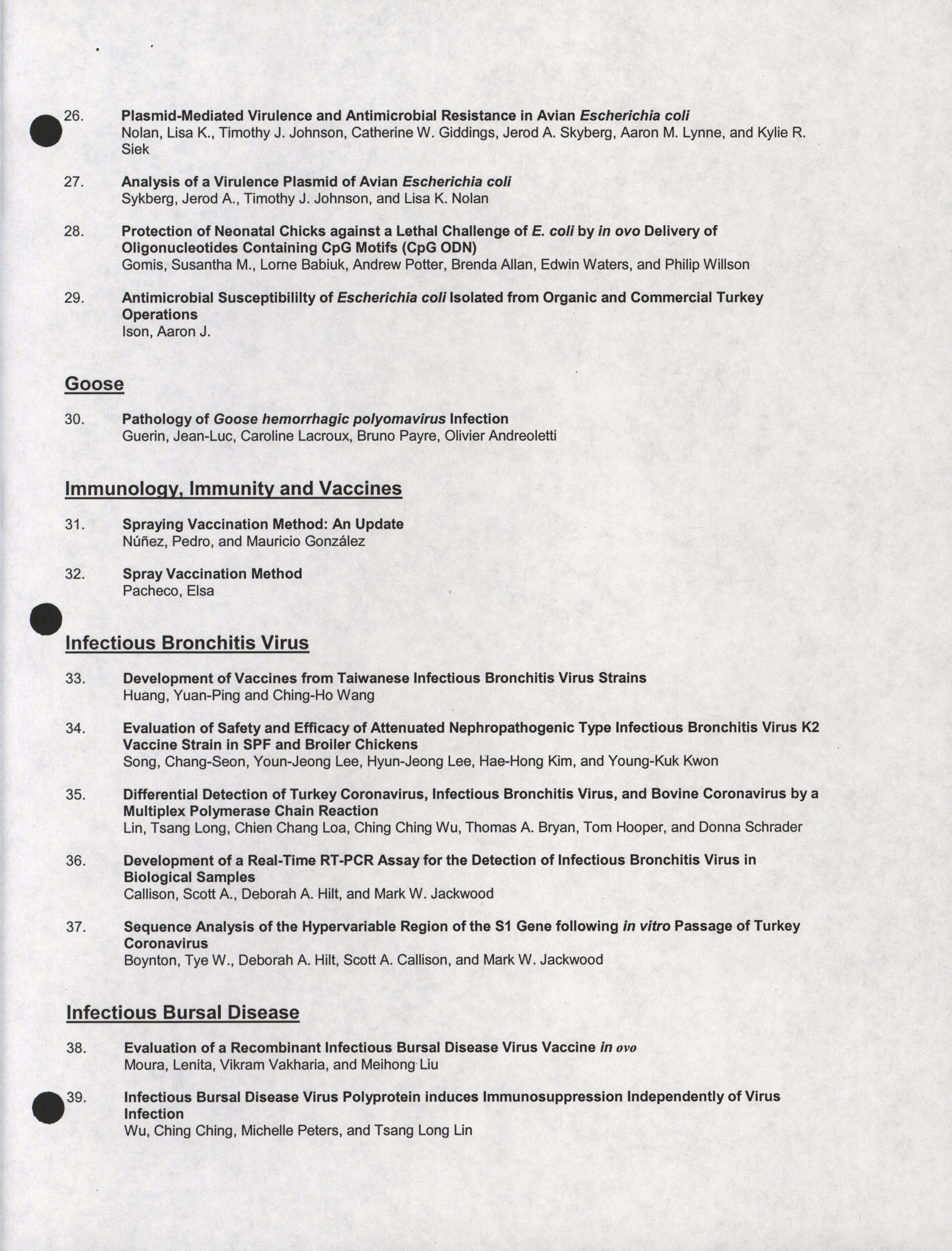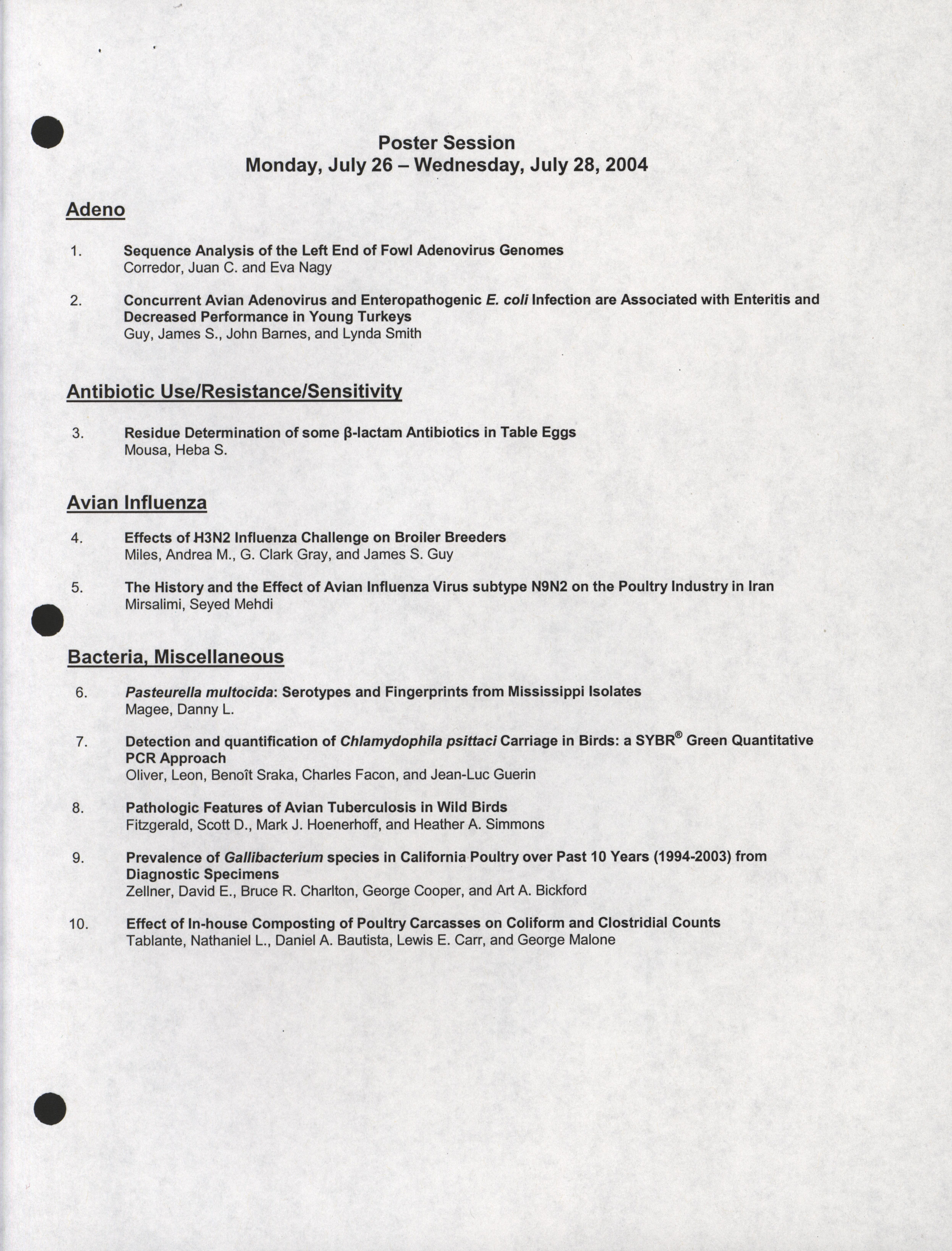 - "Poster session list, July 26-28, 2004", American Association of Avian Pathologists Collection, Iowa State University Library Digital Collections