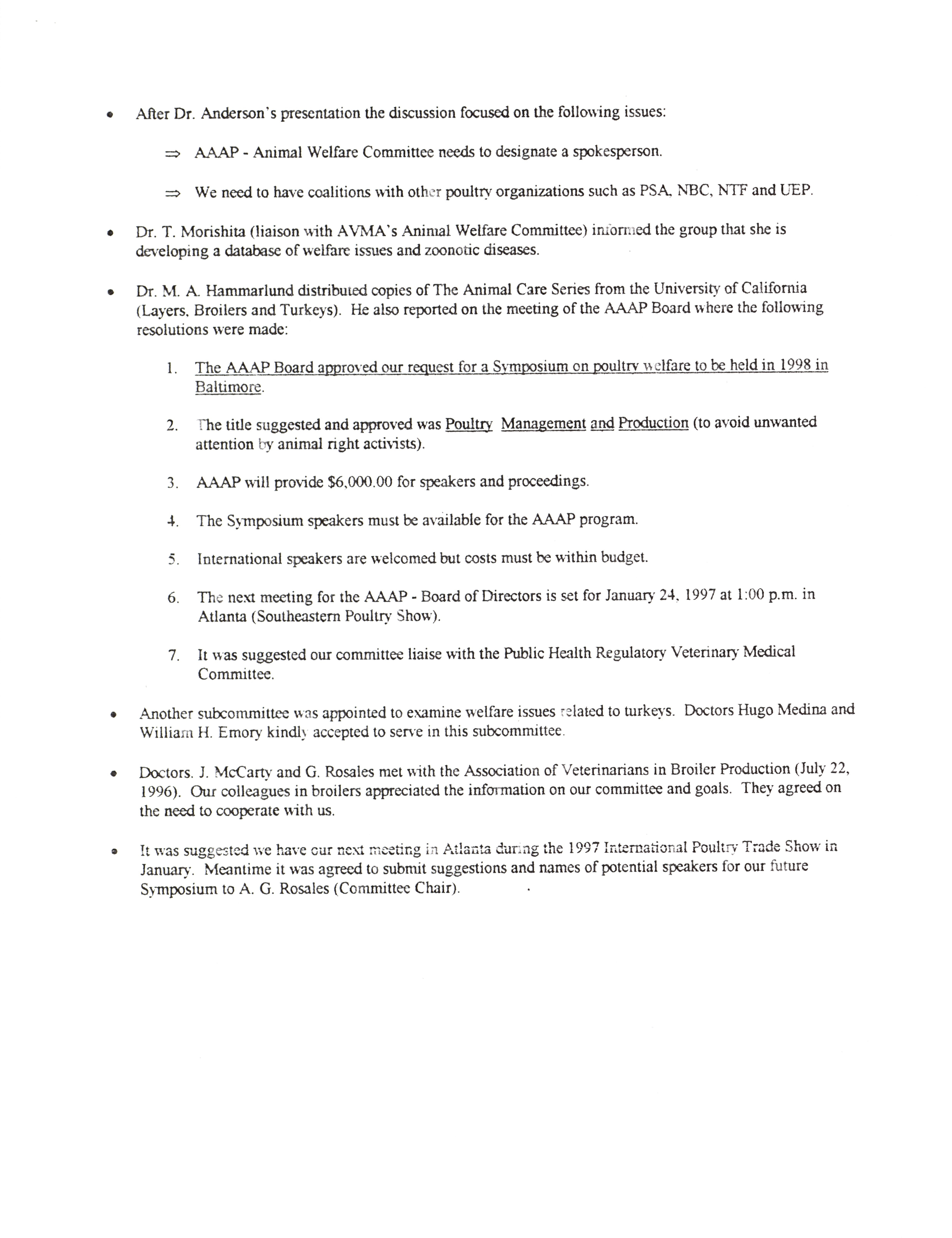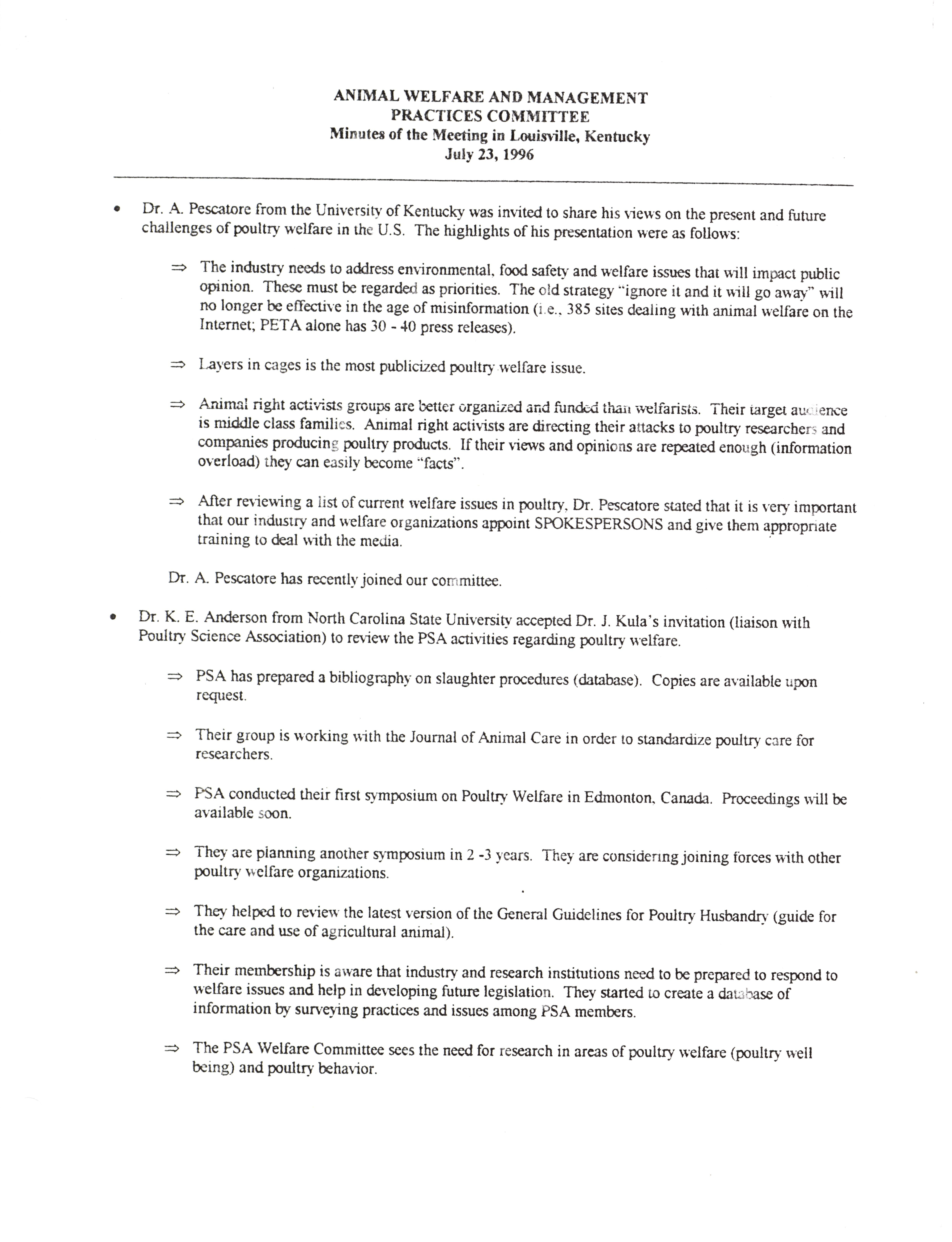 - "Animal welfare and management practices committee: minutes of the meeting, July 23, 1996", American Association of Avian Pathologists Collection, Iowa State University Library Digital Collections