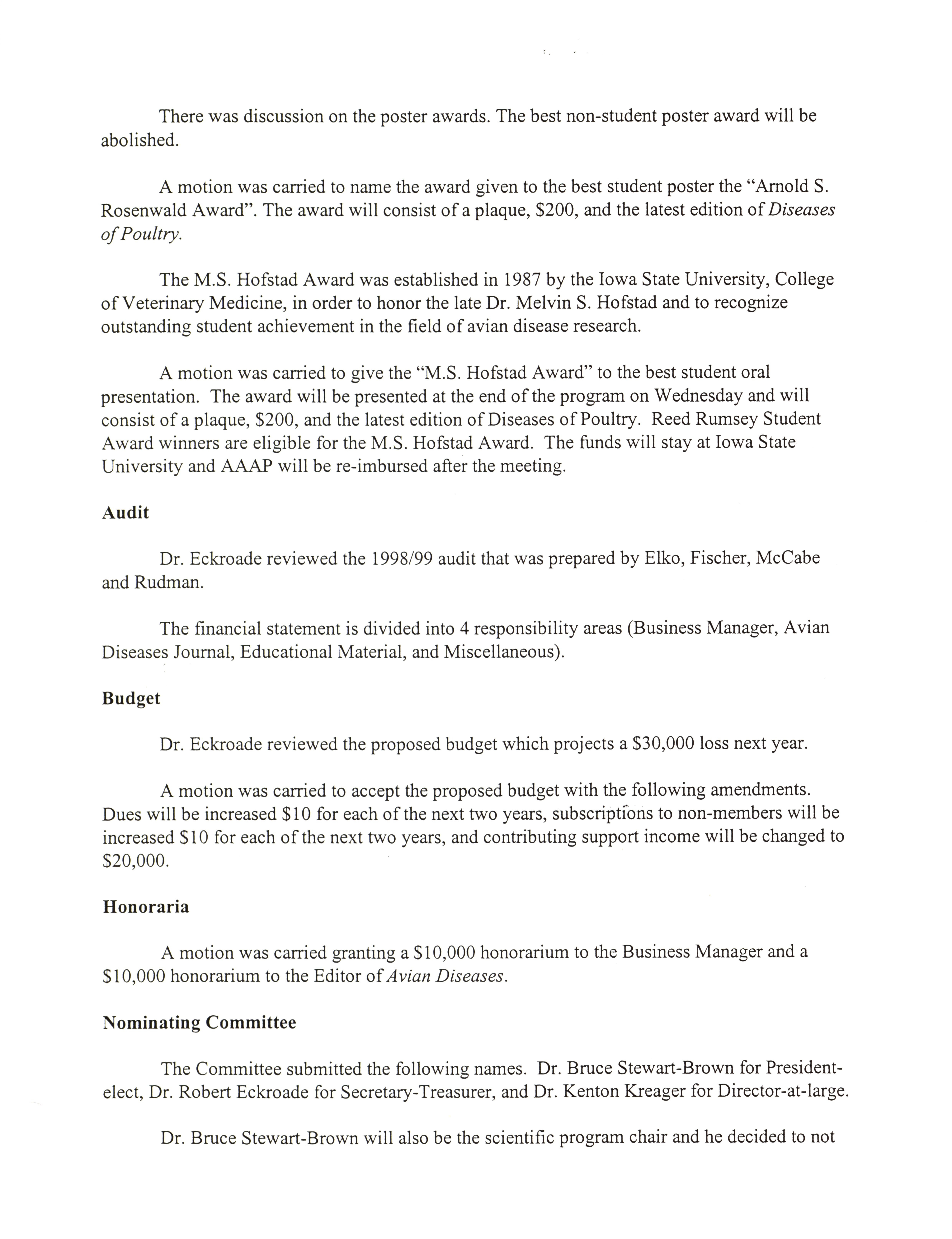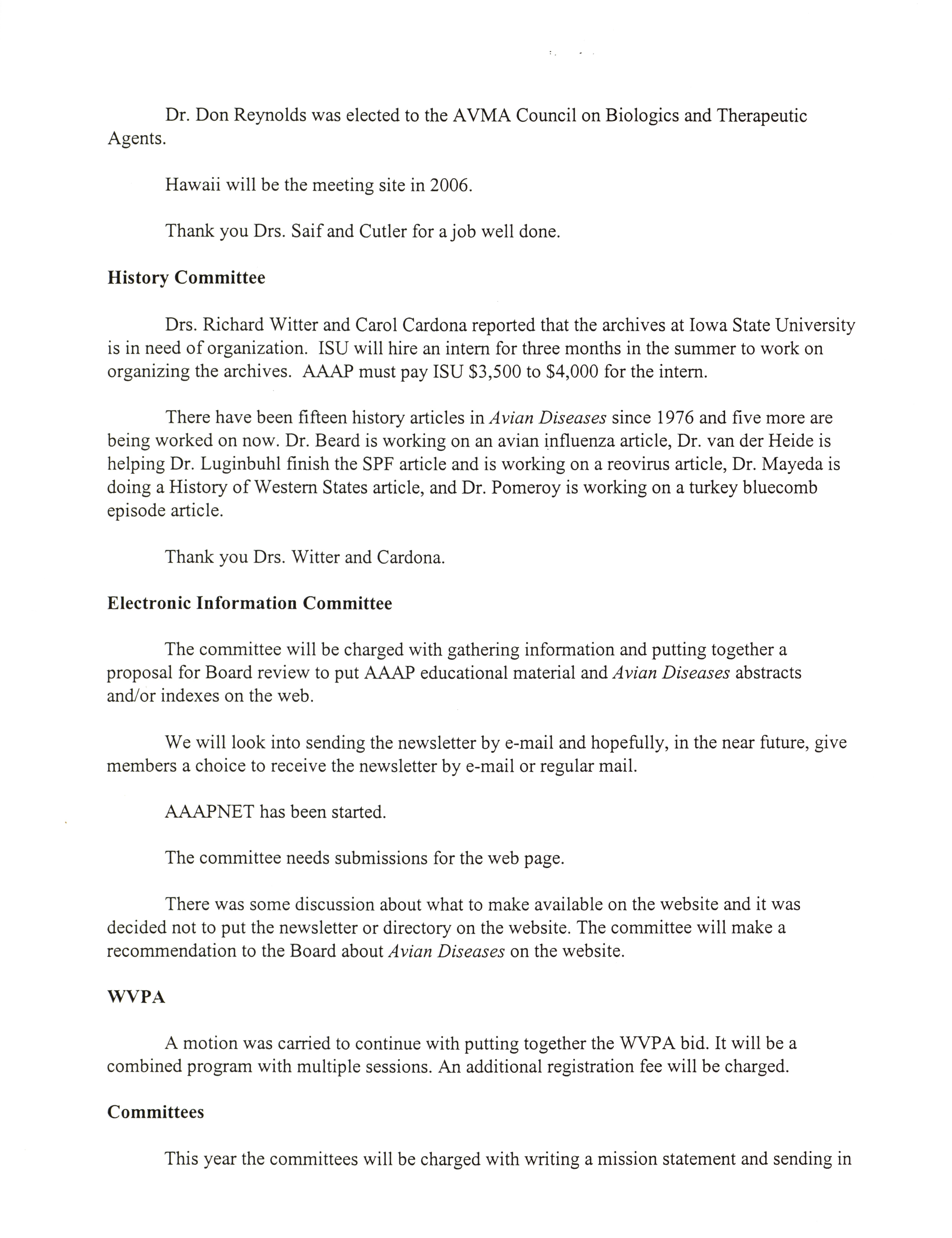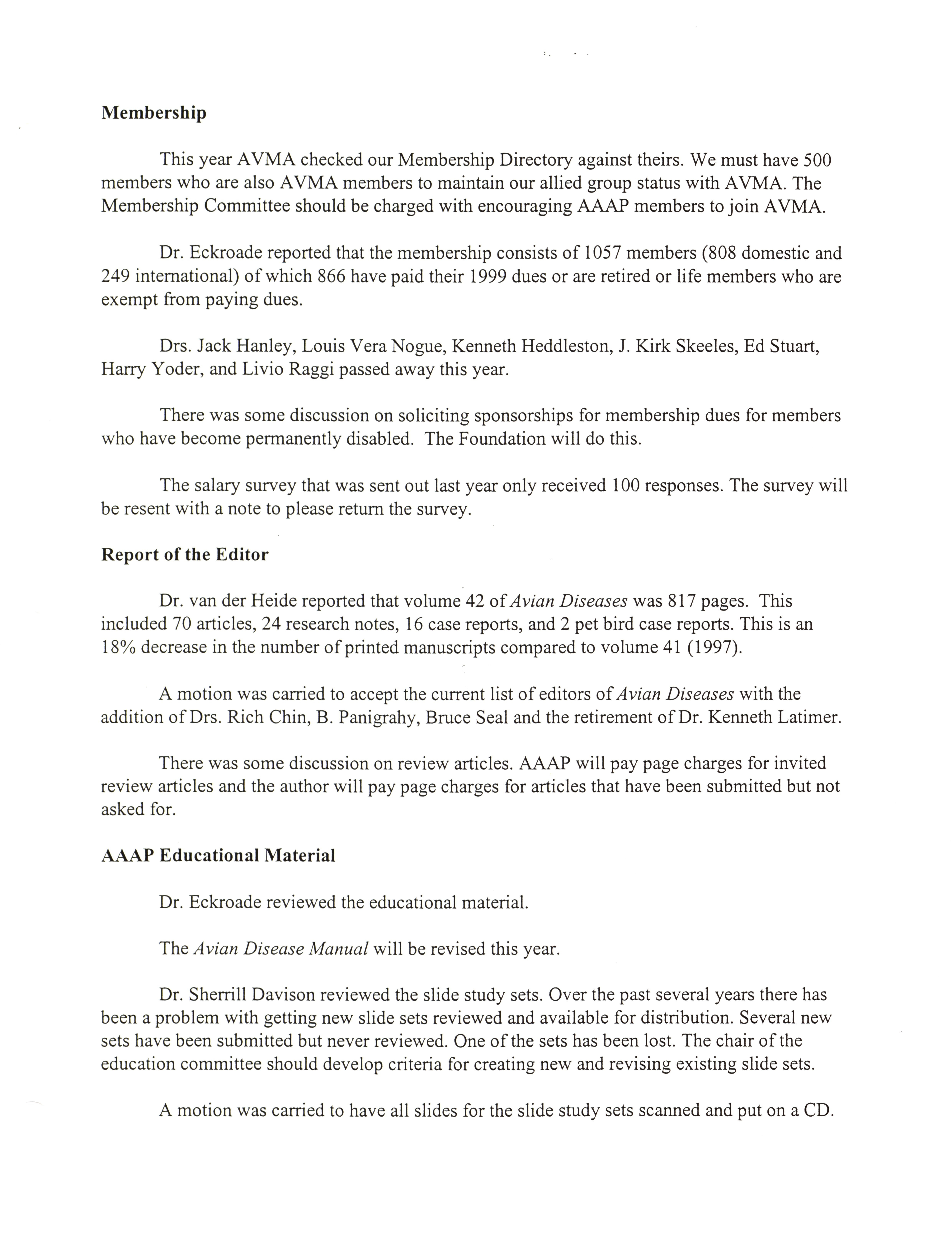 - "AAAP board meeting, July 9, 10, and 14, 1999", American Association of Avian Pathologists Collection, Iowa State University Library Digital Collections