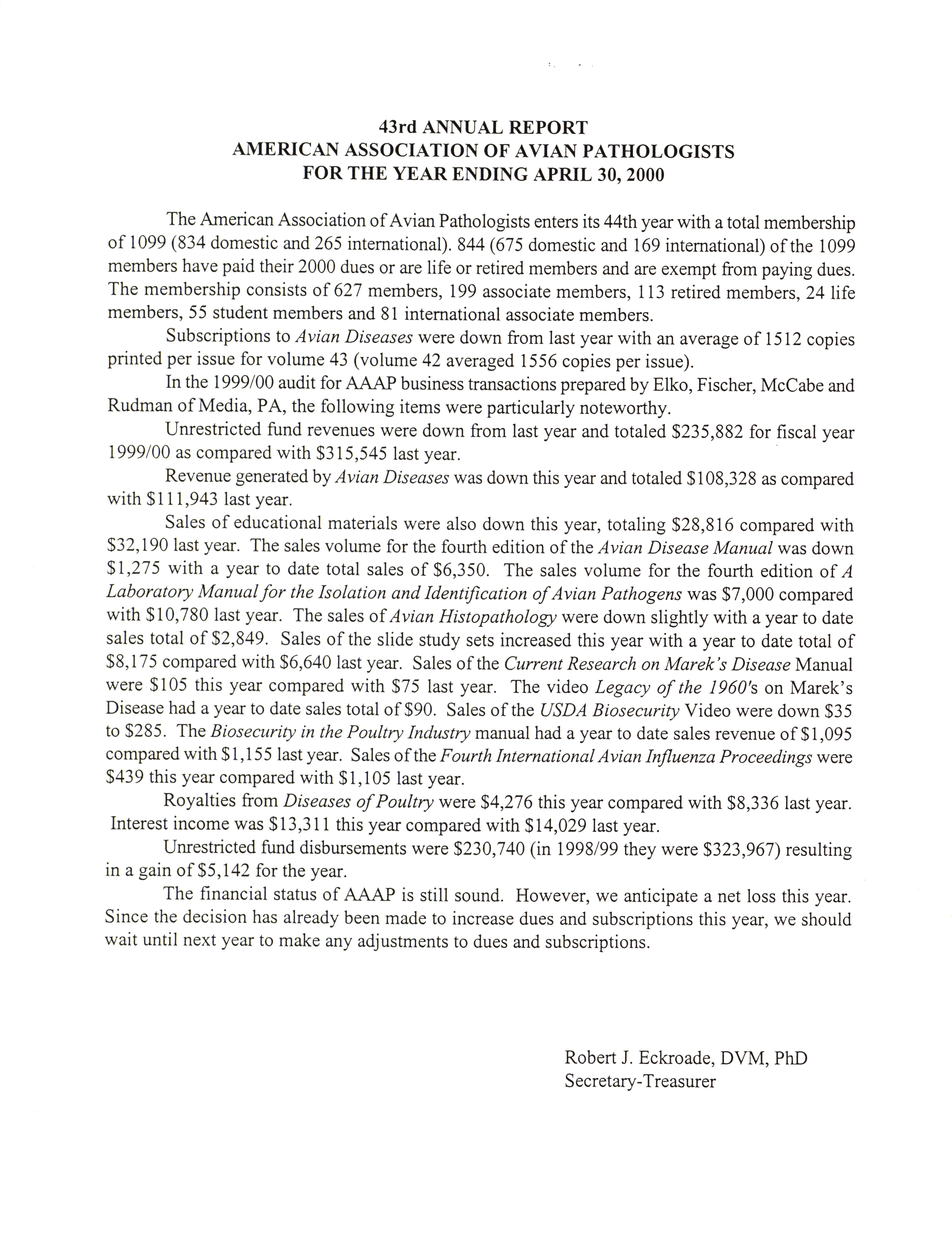 - "AAAP 43rd annual report, April 30, 2000", American Association of Avian Pathologists Collection, Iowa State University Library Digital Collections