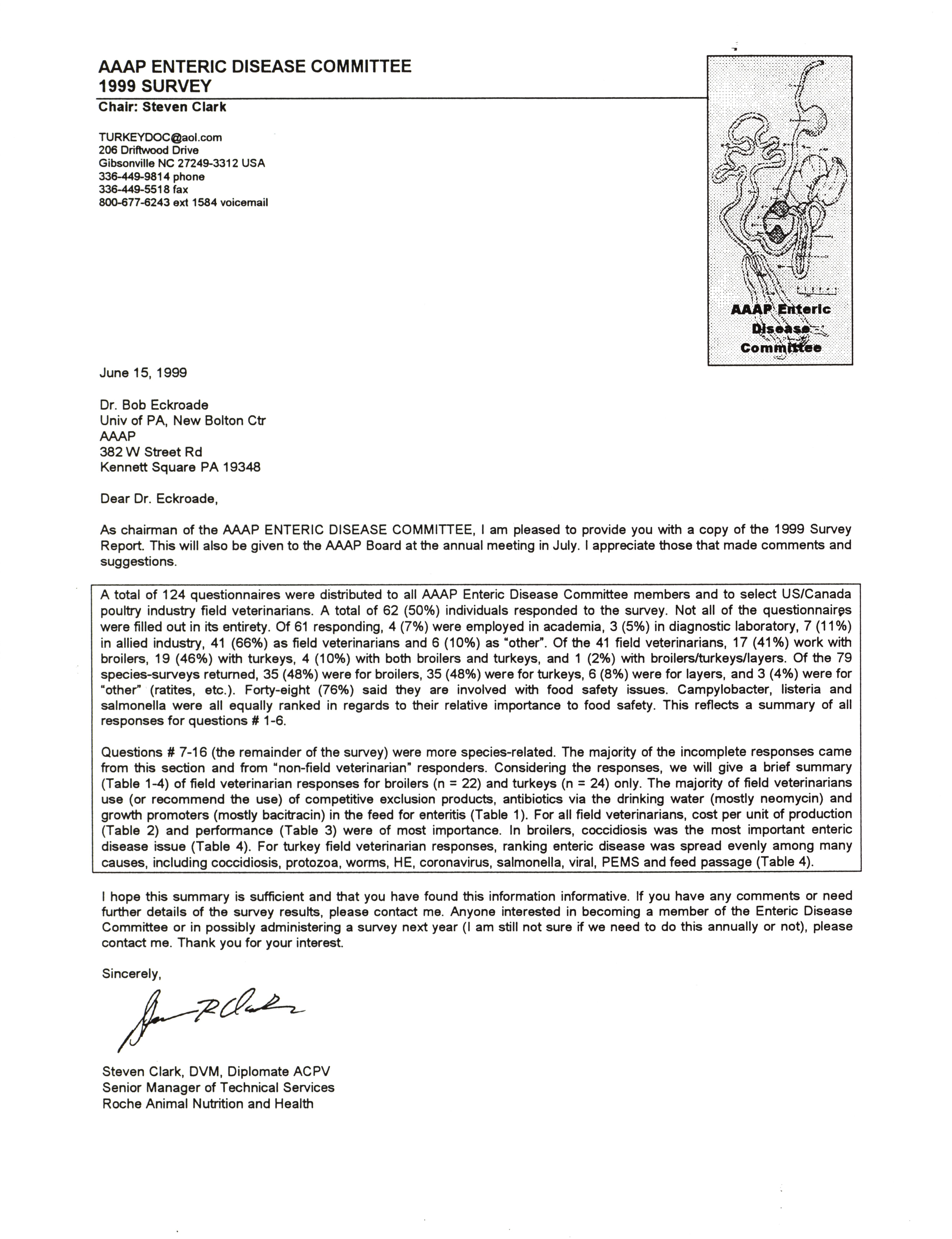 - "Steven Clark letter to Bob Eckroade, June 15, 1999", American Association of Avian Pathologists Collection, Iowa State University Library Digital Collections