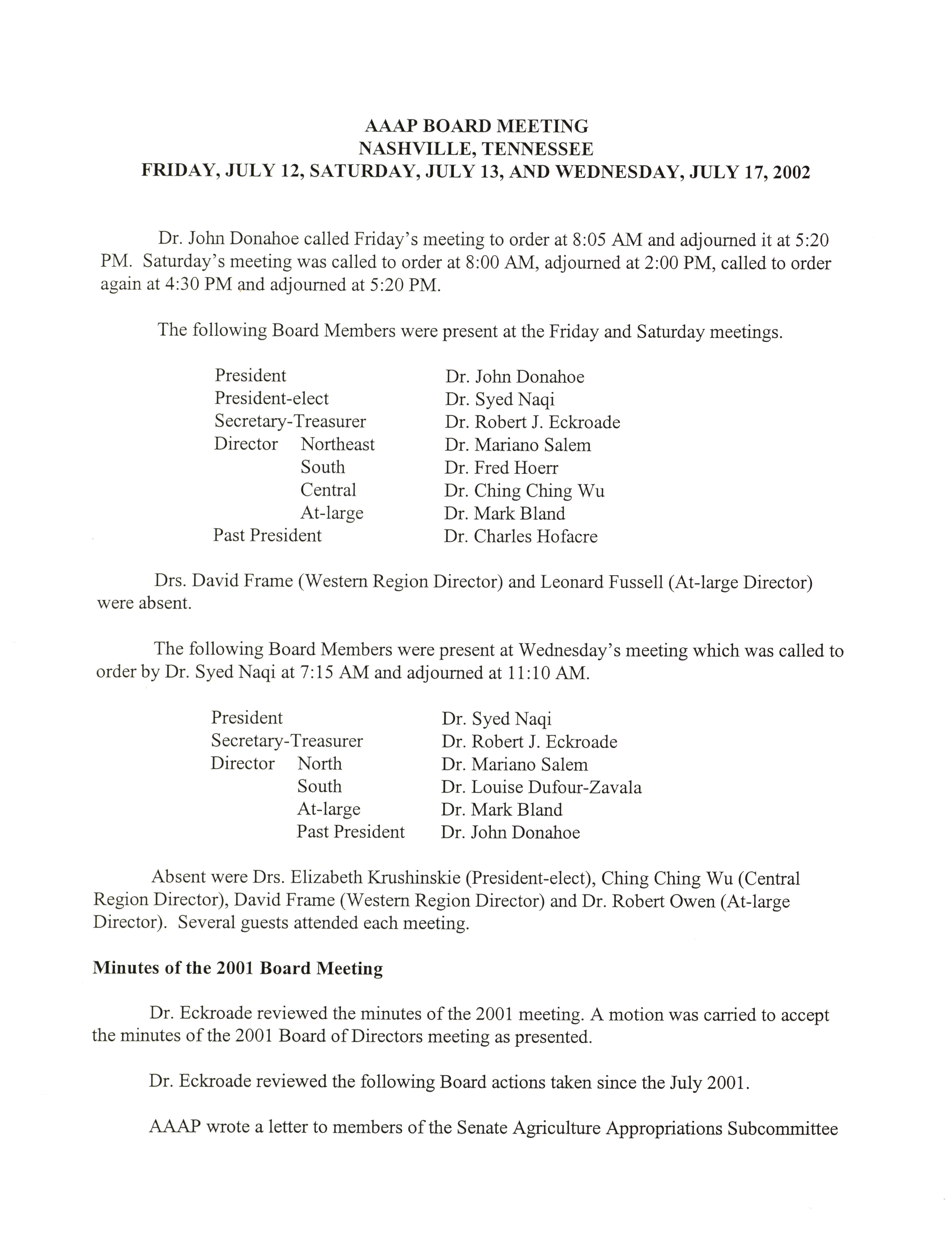 - AAAP board meeting, July 12, 13, and 17, 2002