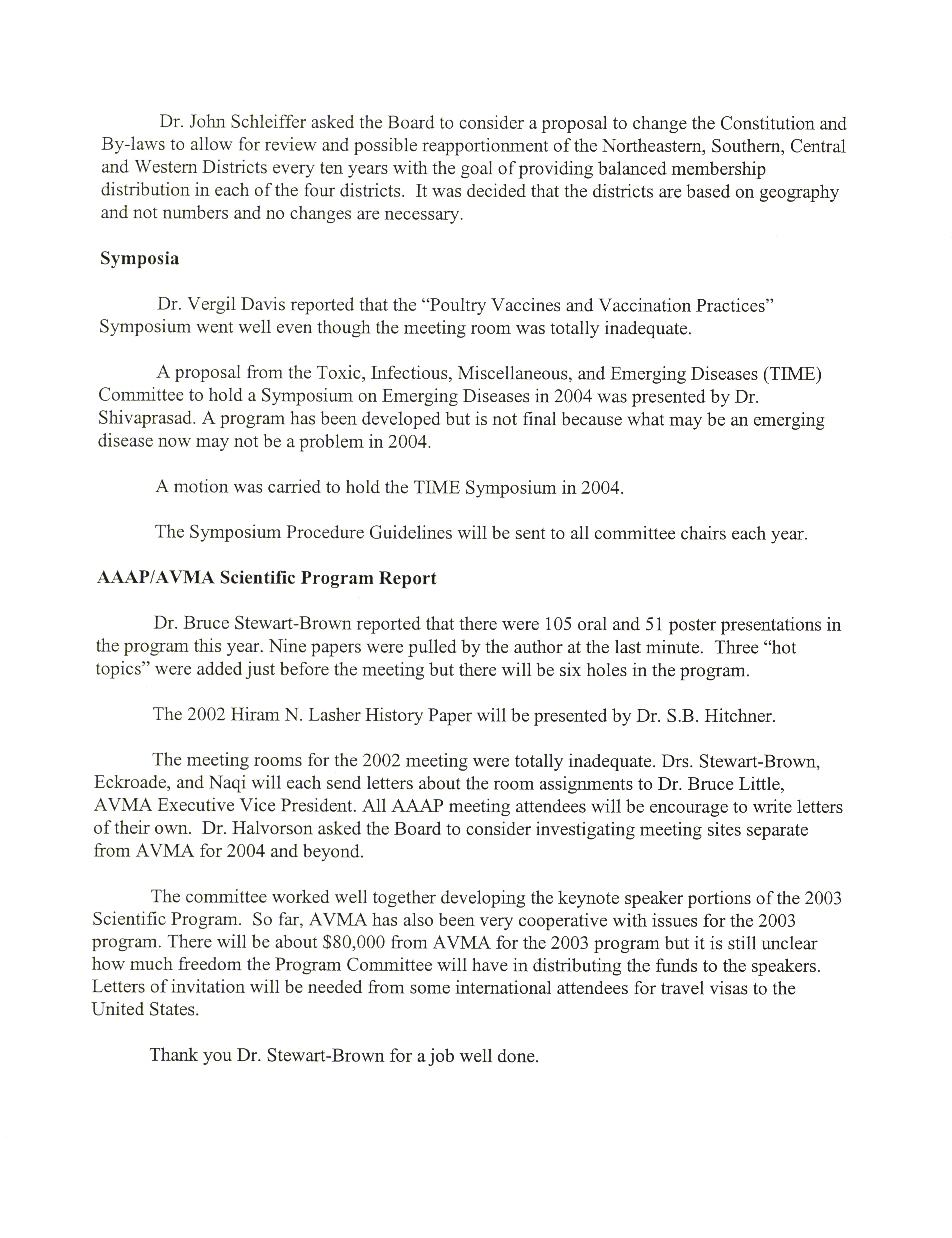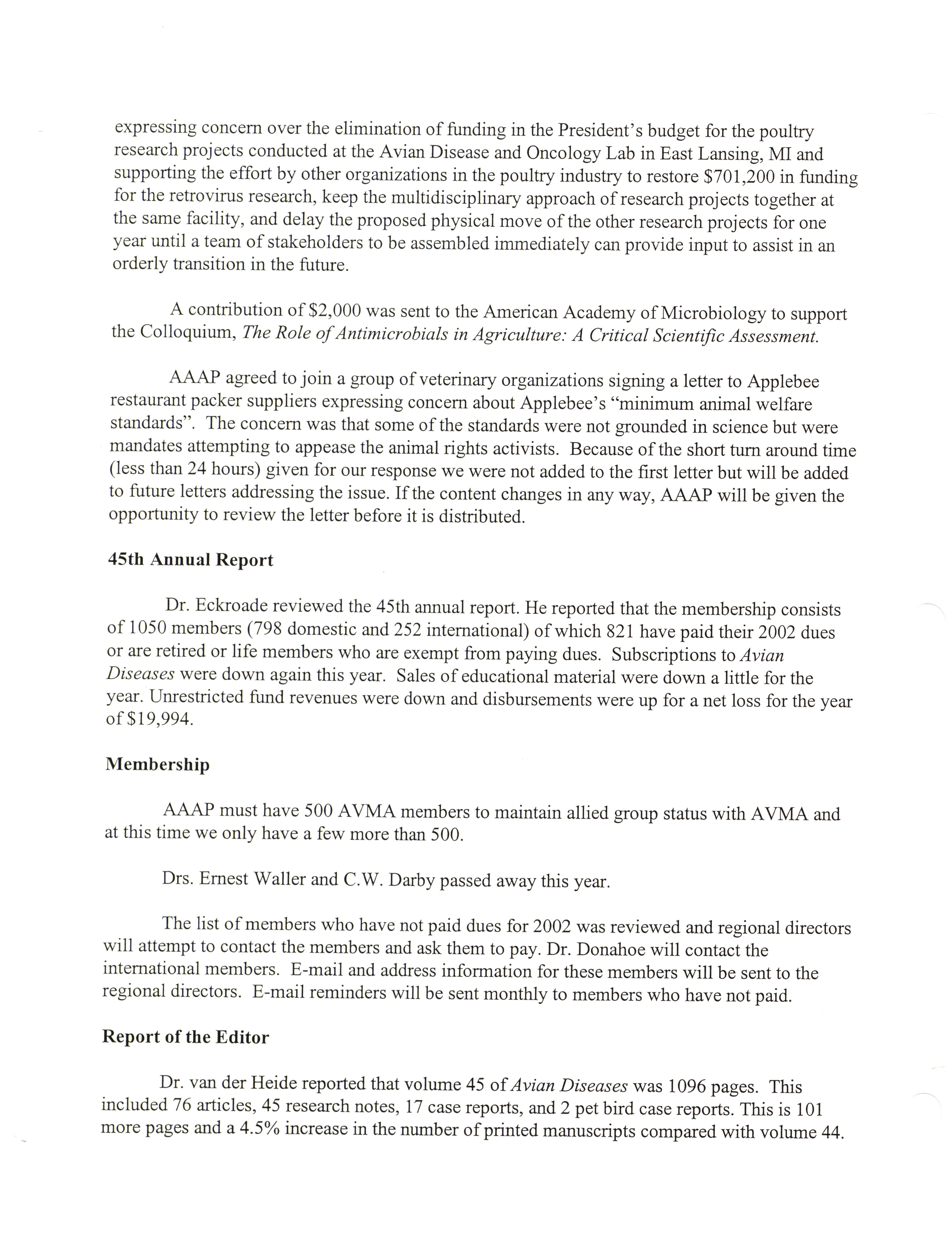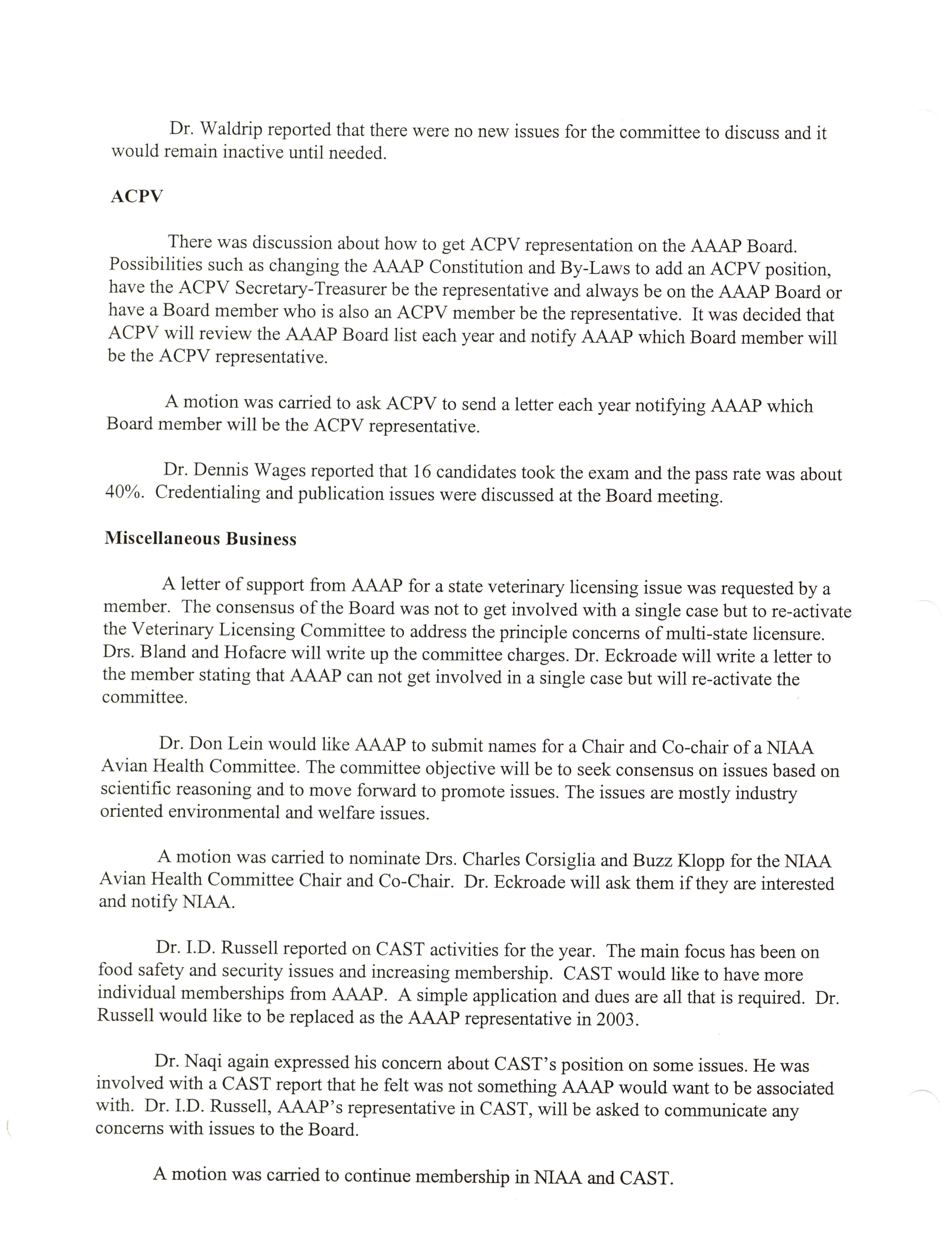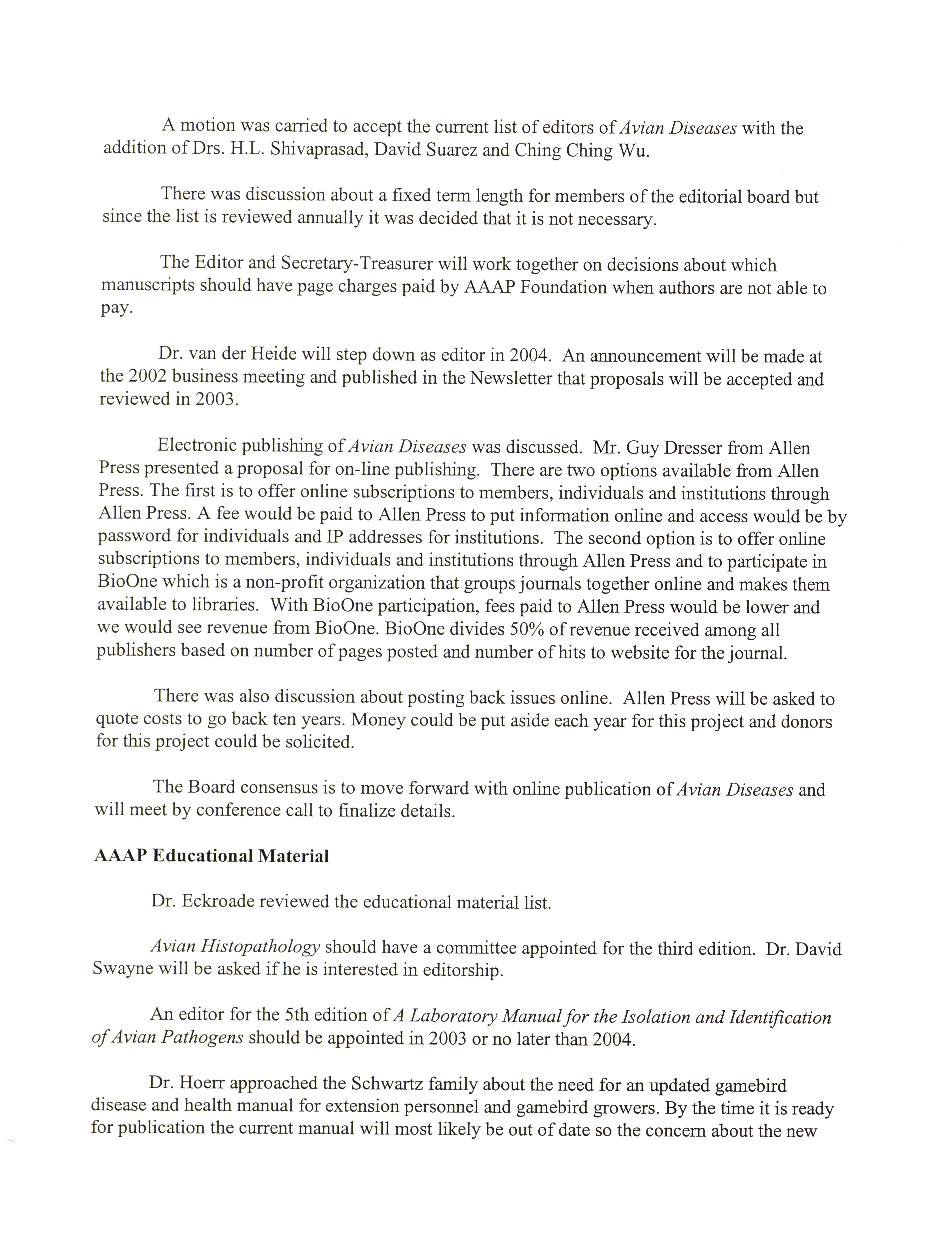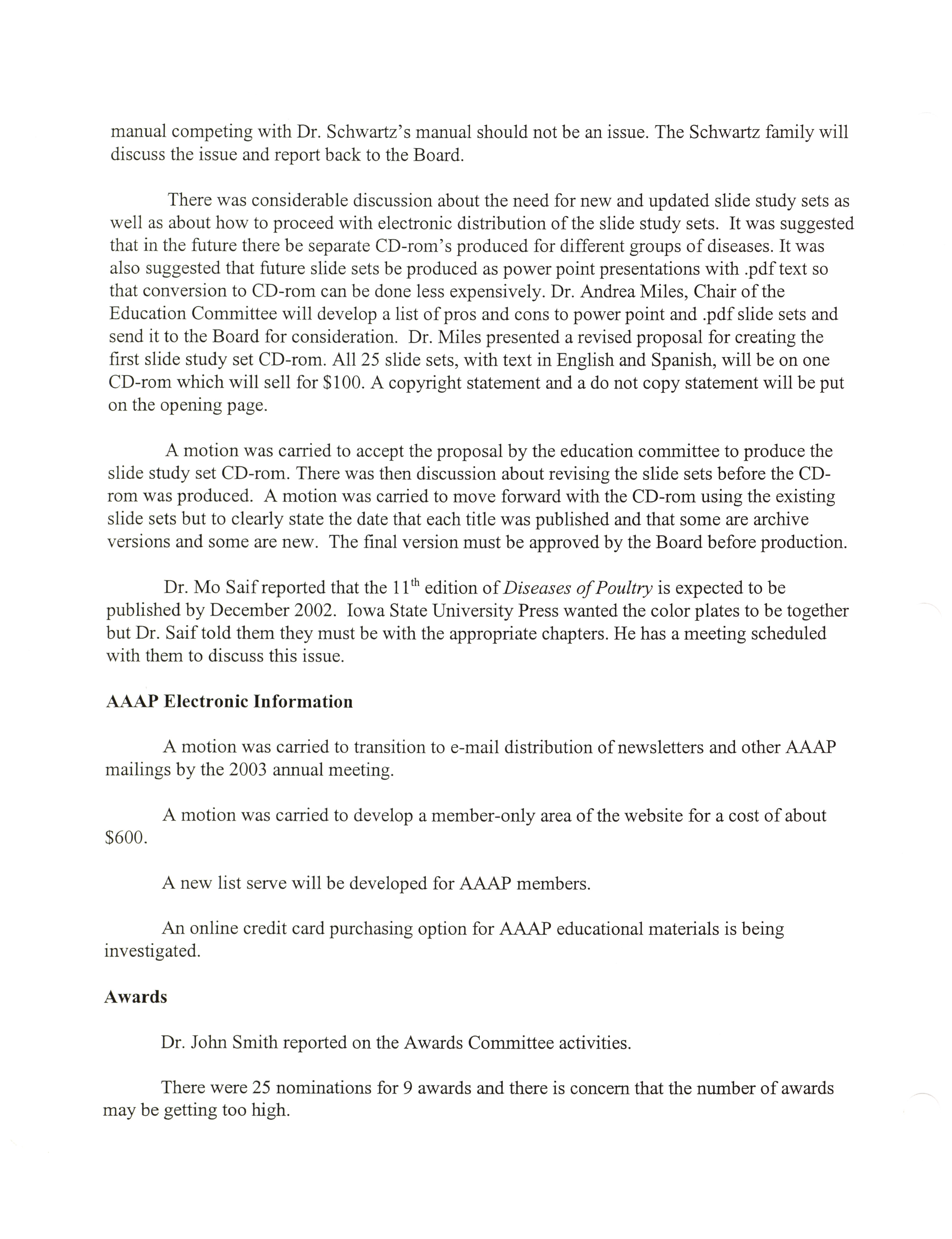 - "AAAP board meeting, July 12, 13, and 17, 2002", American Association of Avian Pathologists Collection, Iowa State University Library Digital Collections