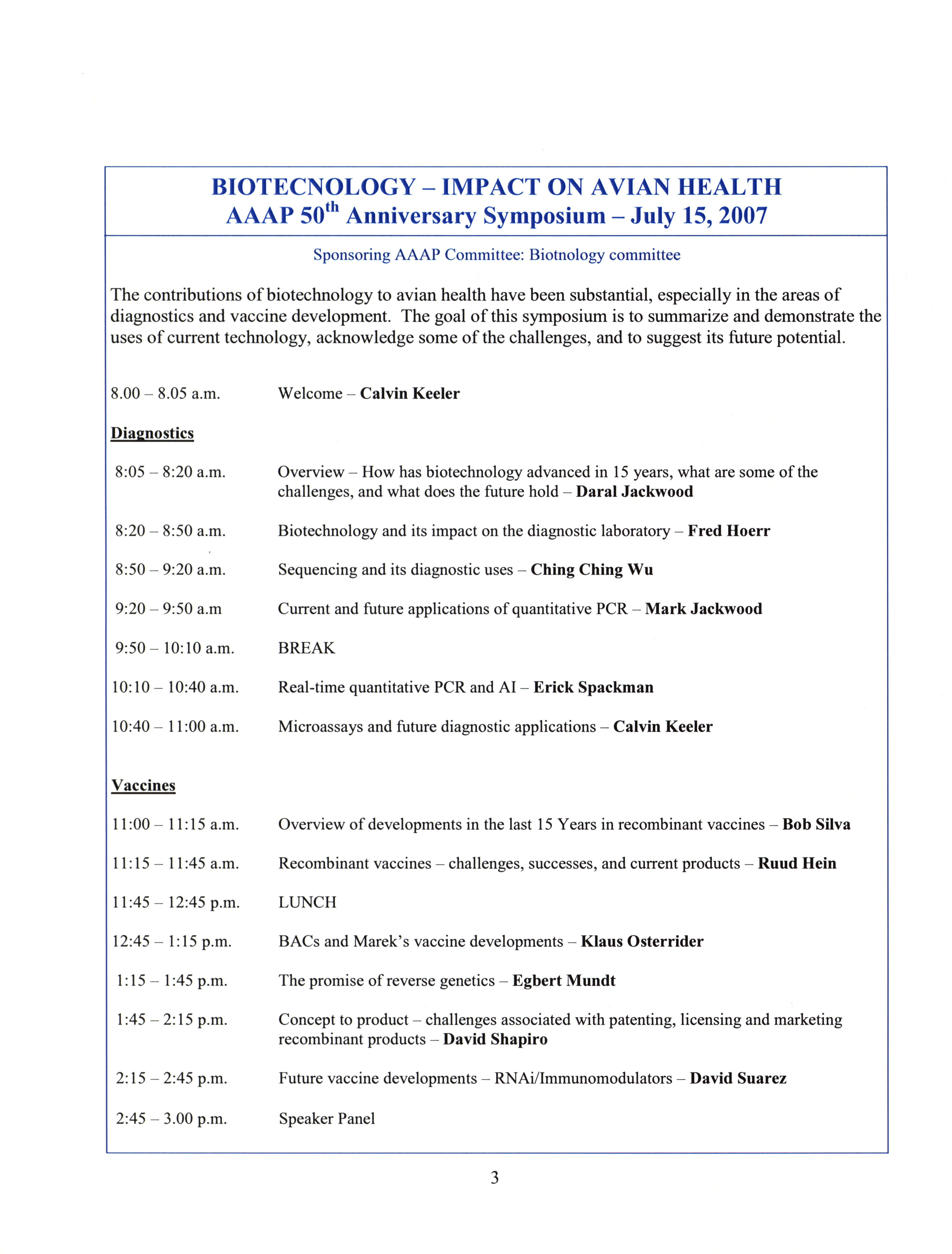 - AAAP symposium program: biotechnology: impact on avian health, July 15, 2007