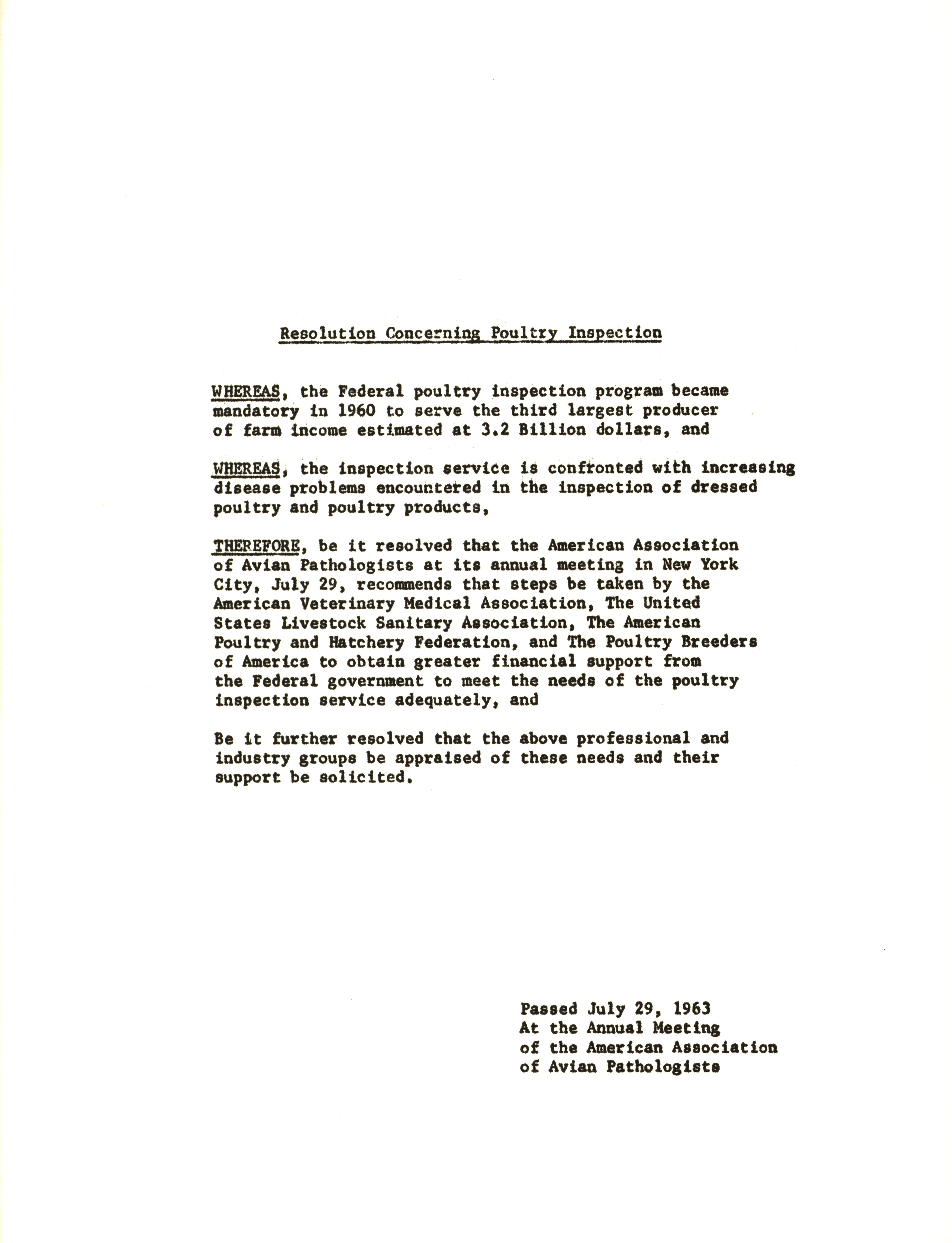 - "Resolution concerning poultry inspection, July 29, 1963", American Association of Avian Pathologists Collection, Iowa State University Library Digital Collections