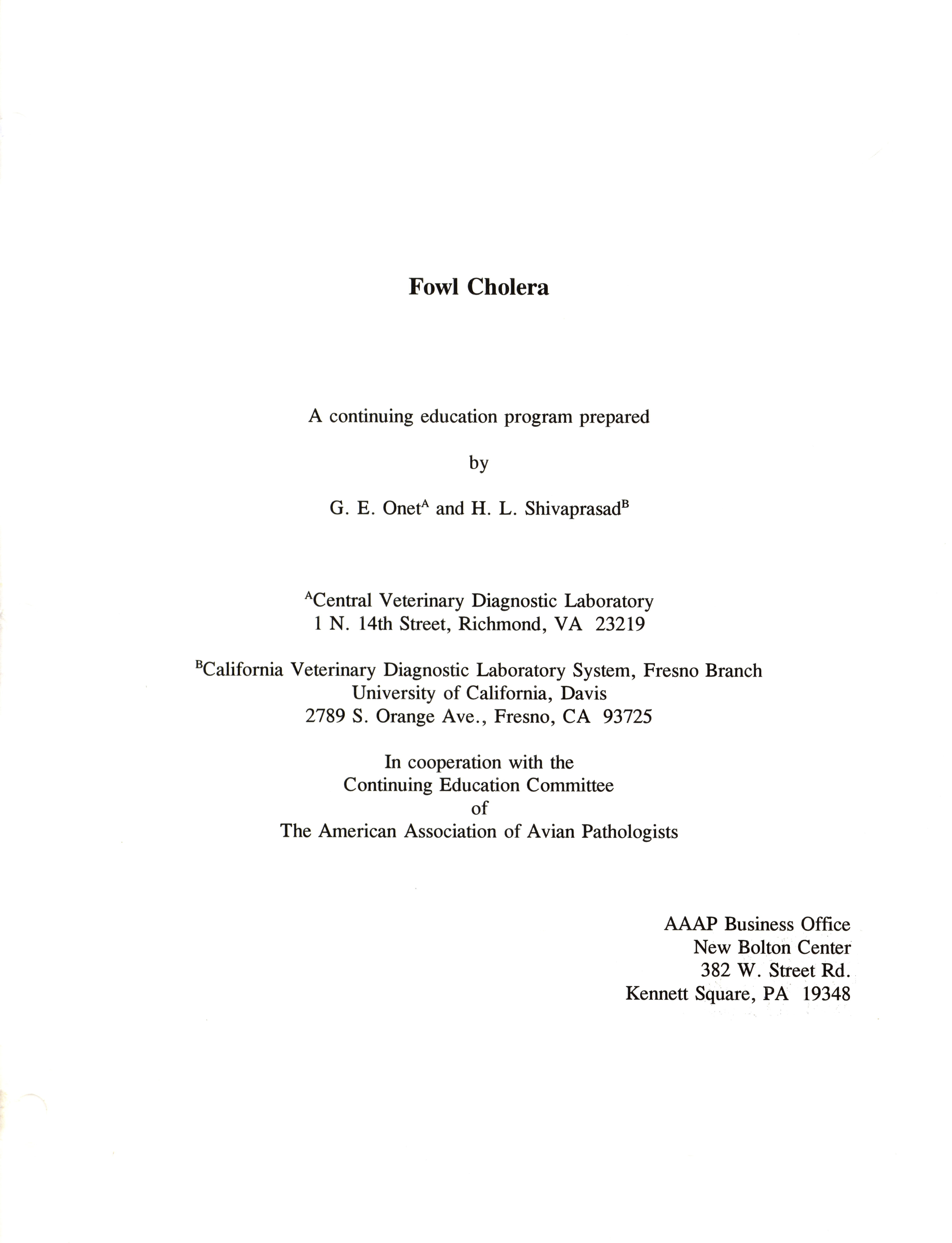 - "Fowl cholera", American Association of Avian Pathologists Collection, Iowa State University Library Digital Collections
