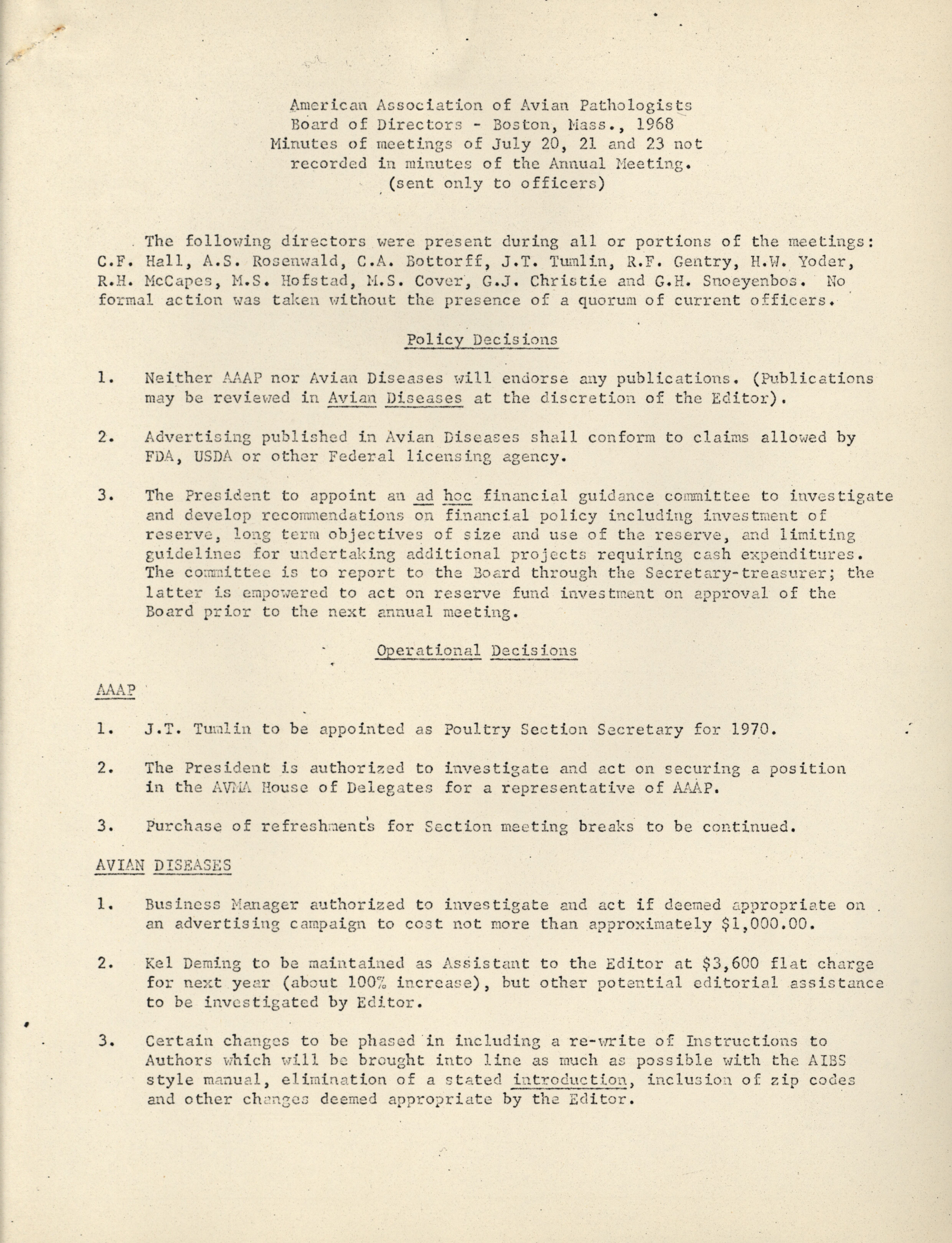 - "AAAP board of directors minutes of meetings, July 20, 21, and 23, 1968.", American Association of Avian Pathologists Collection, Iowa State University Library Digital Collections