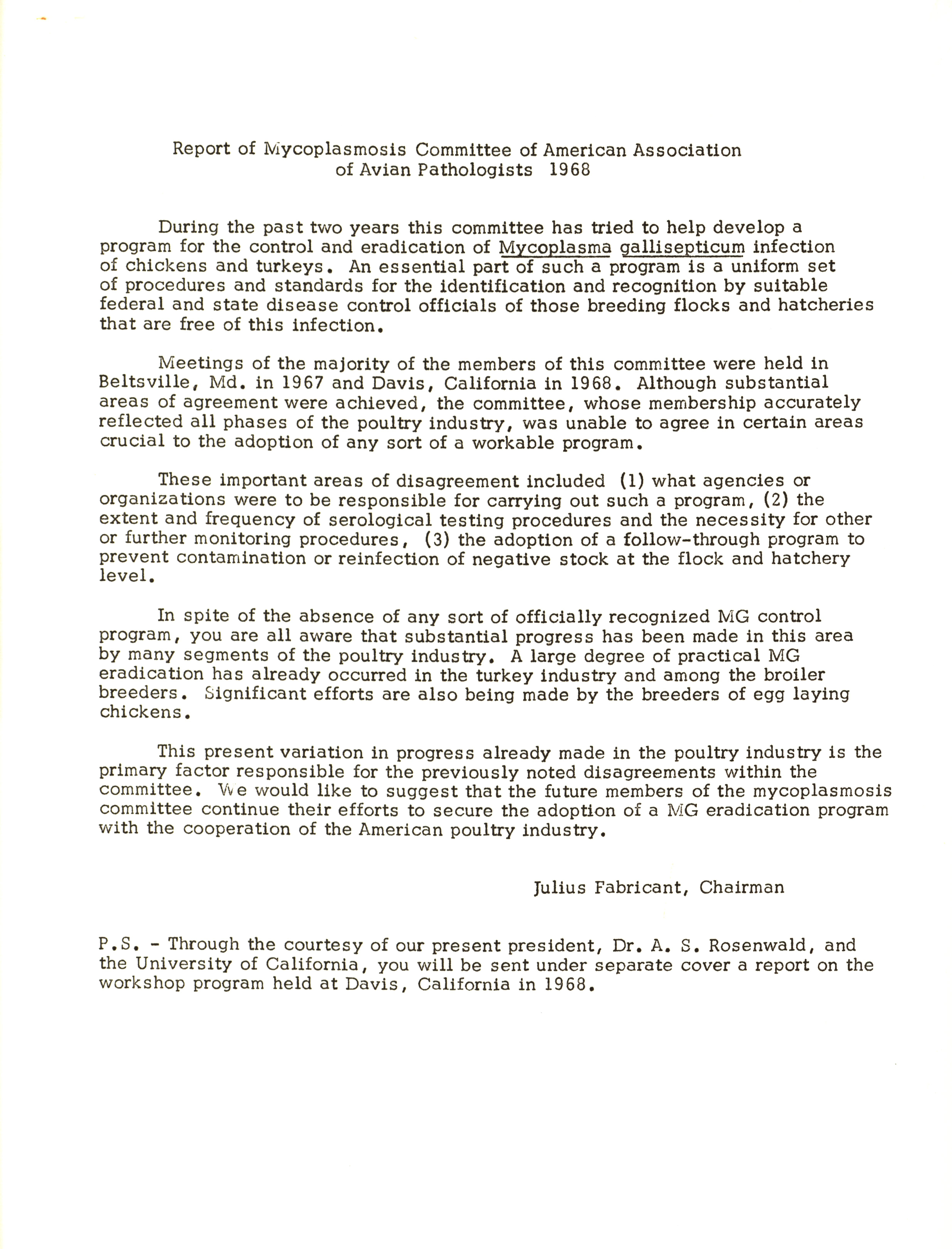 - "AAAP report of the committee on mycoplasmosis, 1968", American Association of Avian Pathologists Collection, Iowa State University Library Digital Collections