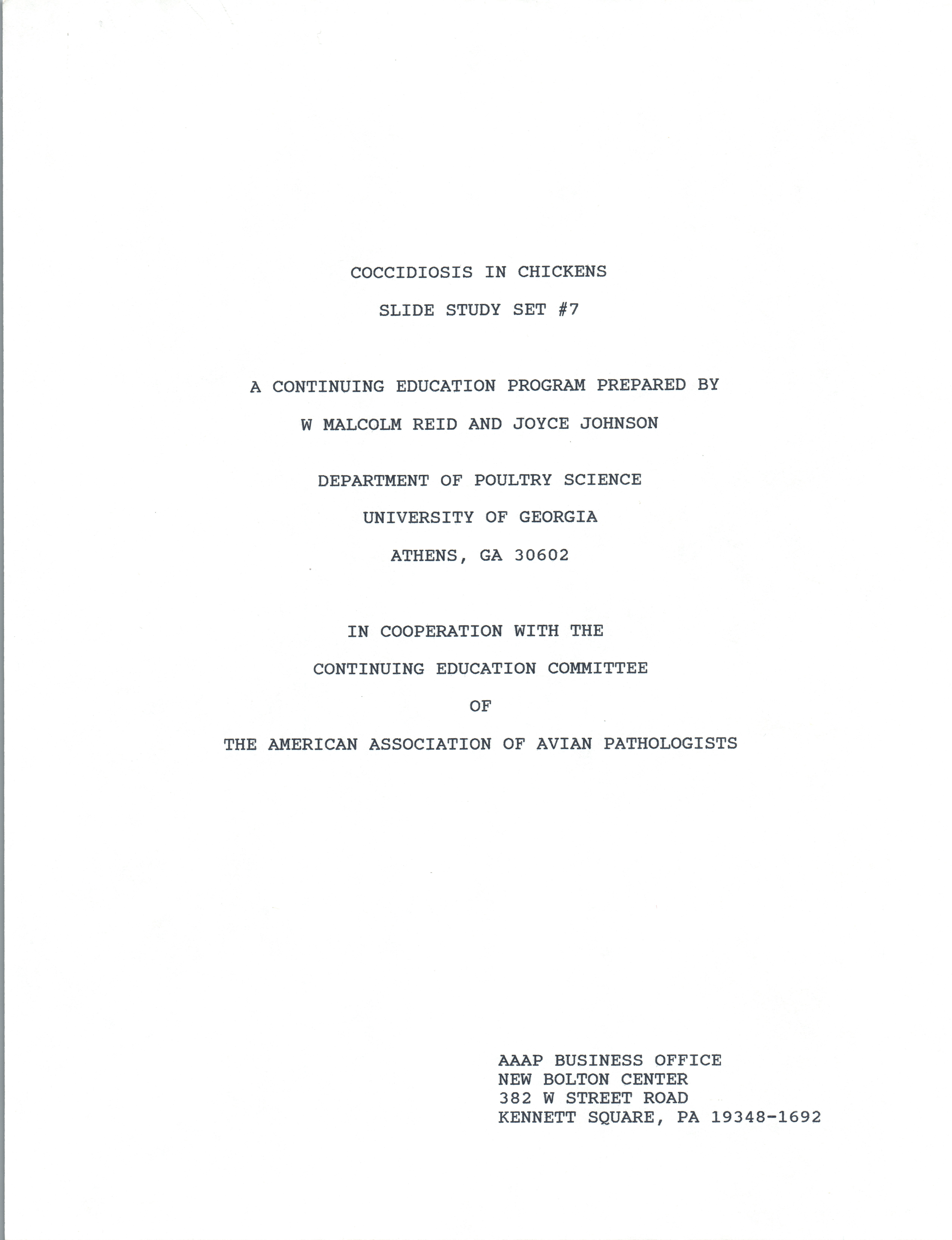 - Item from a series of AAAP records containing slide study sets which consist of slides and their accompanying texts. The slide study sets mainly cover poultry diseases and their diagnosis, but also include other topics such as biotechnology in avian medicine and careers in avian medicine. Annotation: Revised version available in box 41 folder 6.