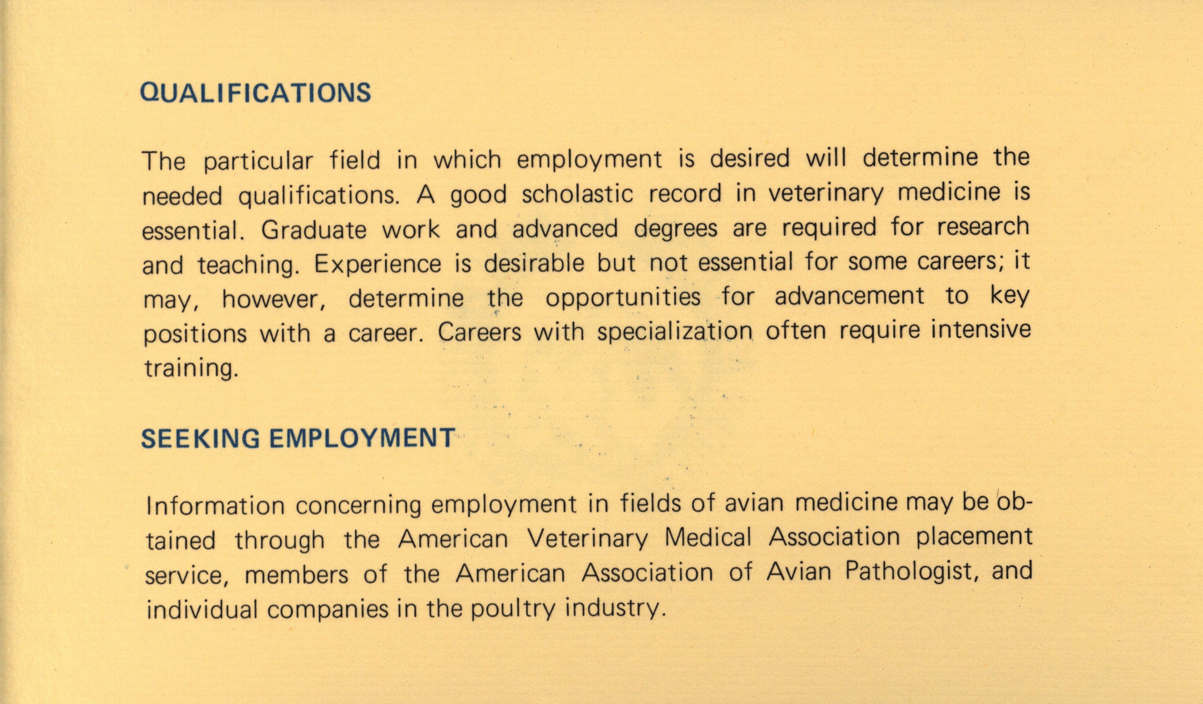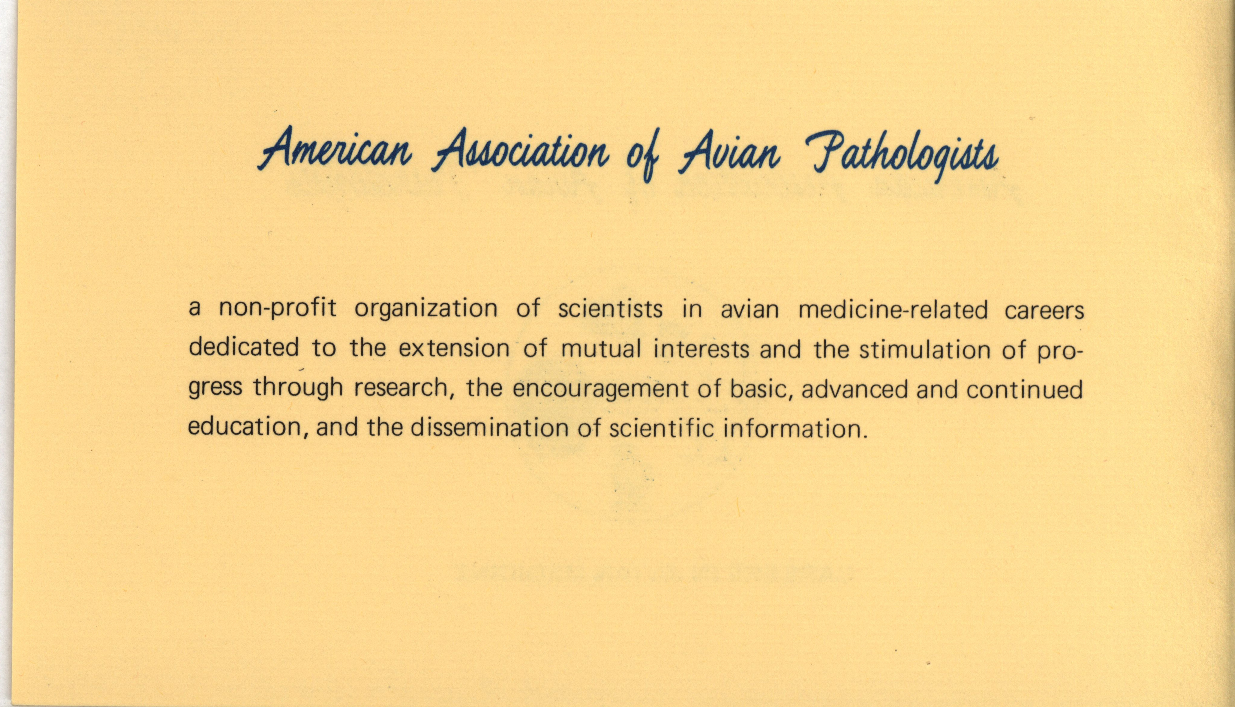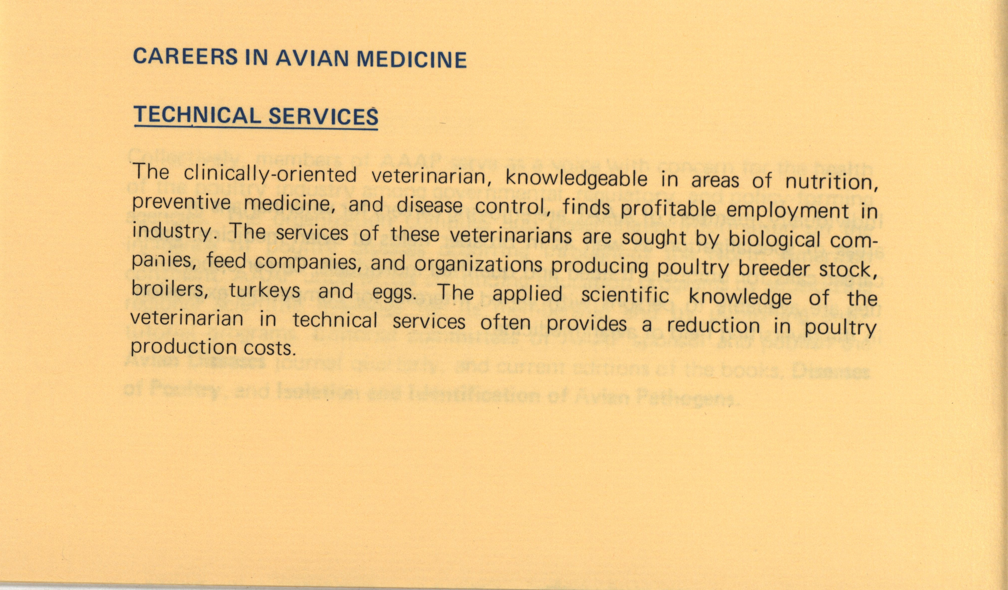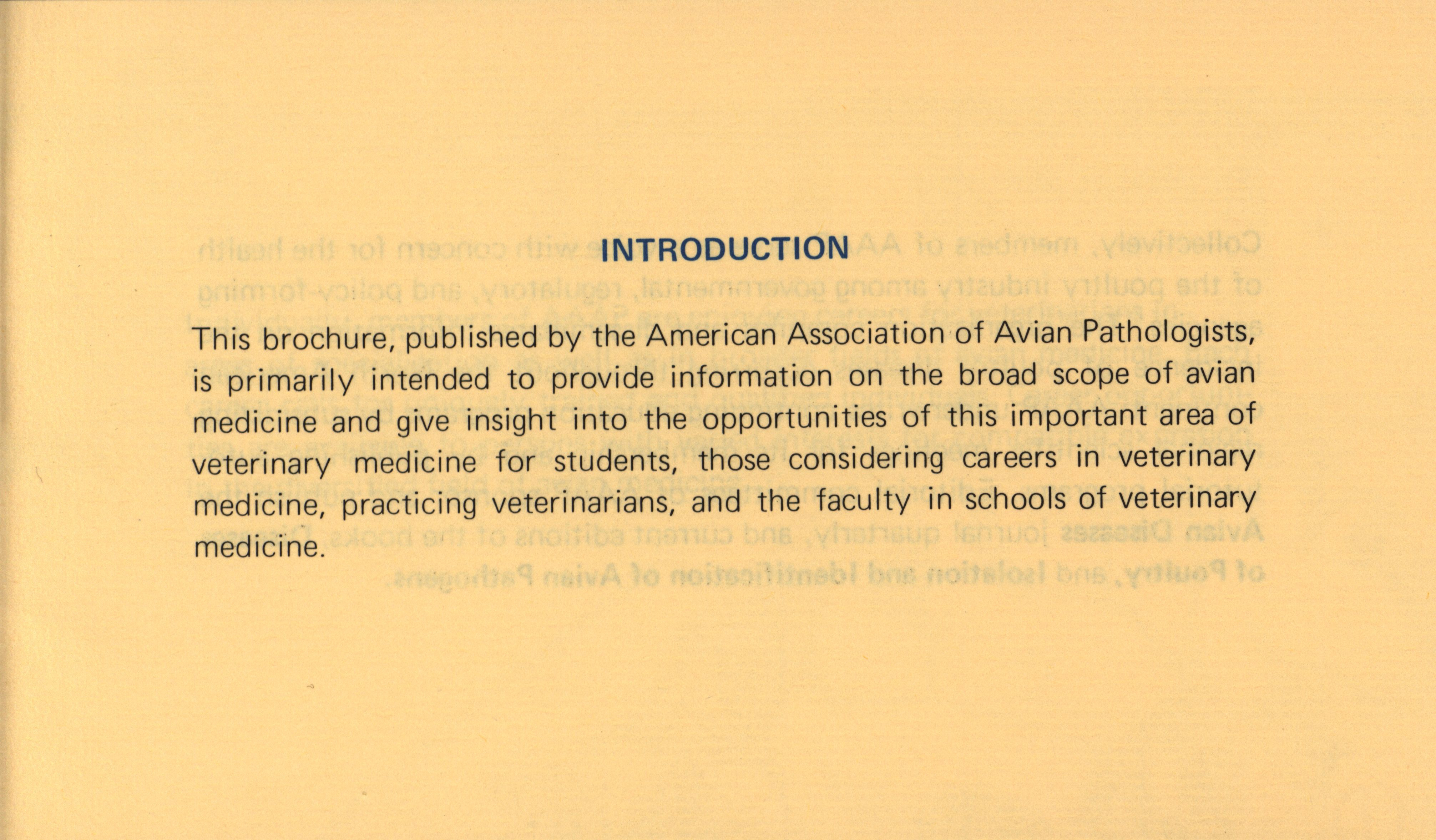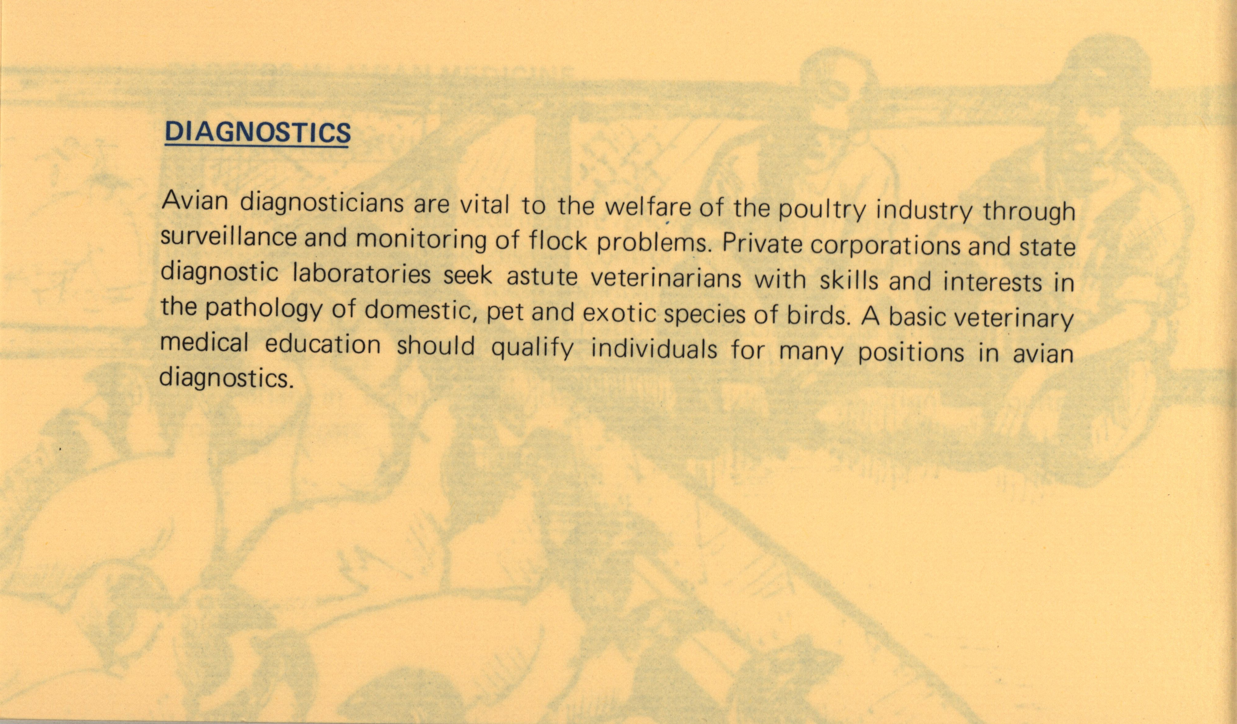 - "Booklet: American Association of Avian Pathologists, careers in avian medicine", American Association of Avian Pathologists Collection, Iowa State University Library Digital Collections