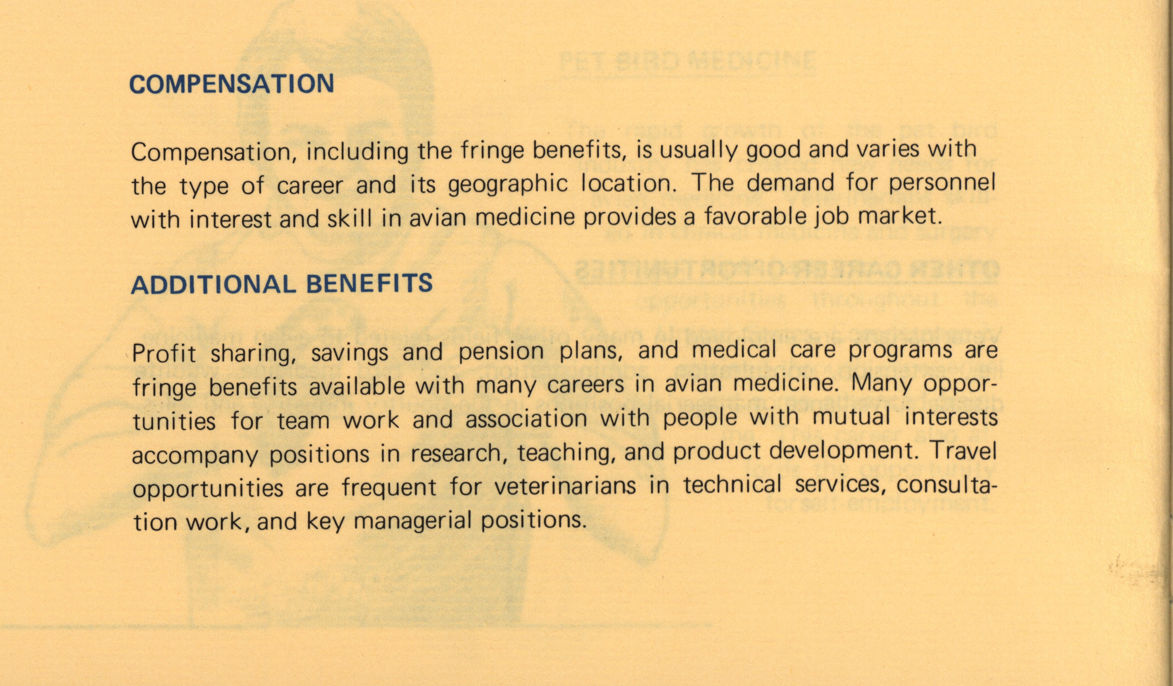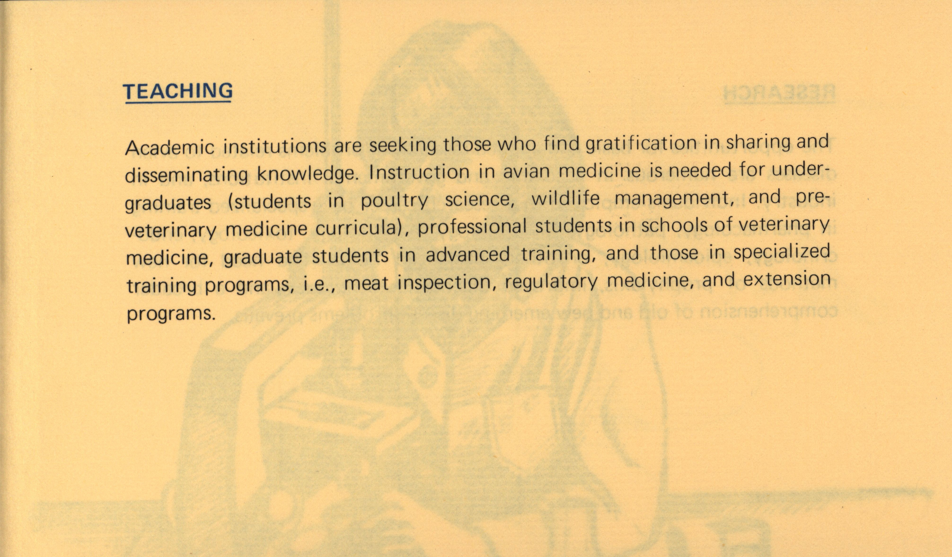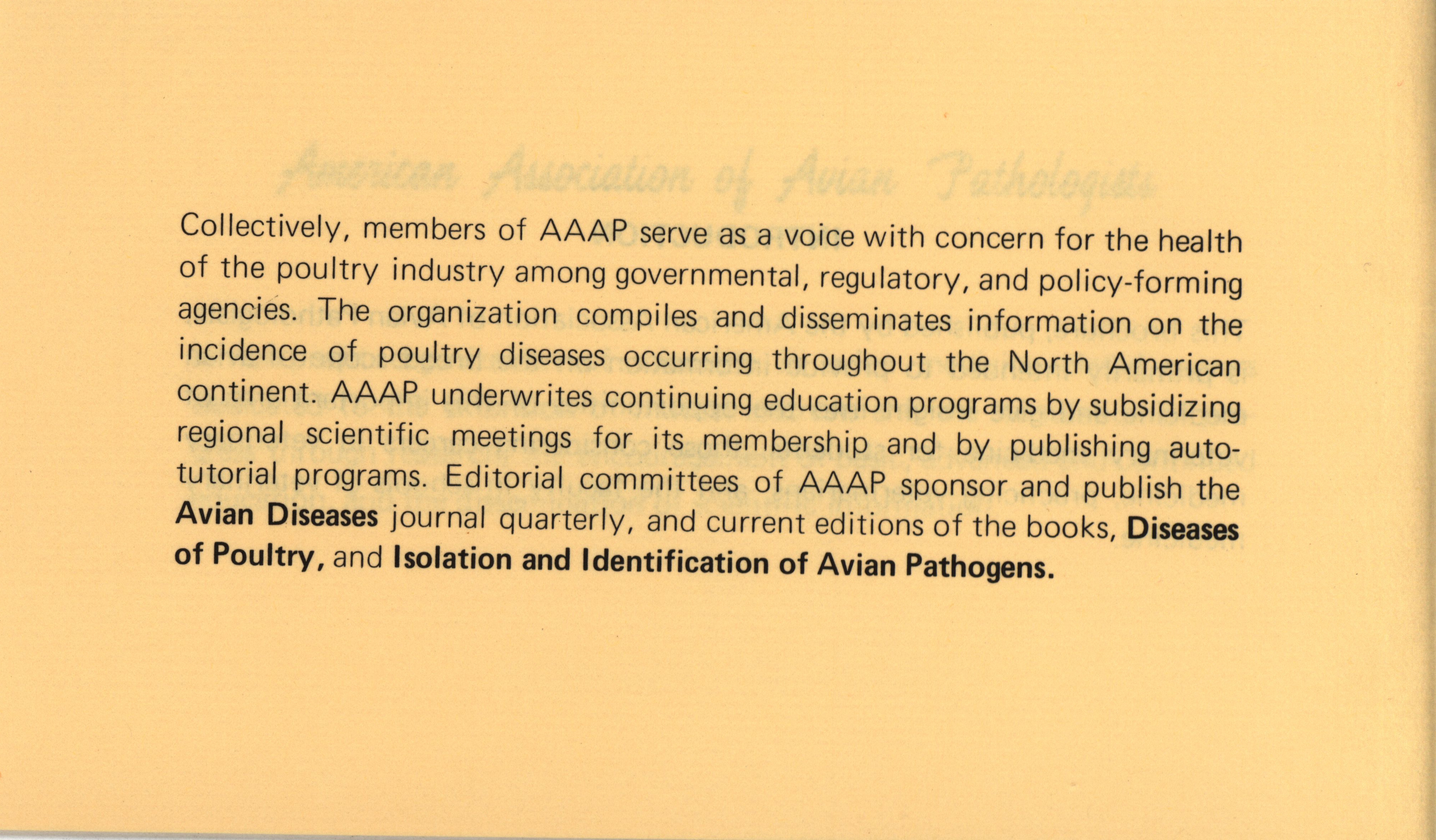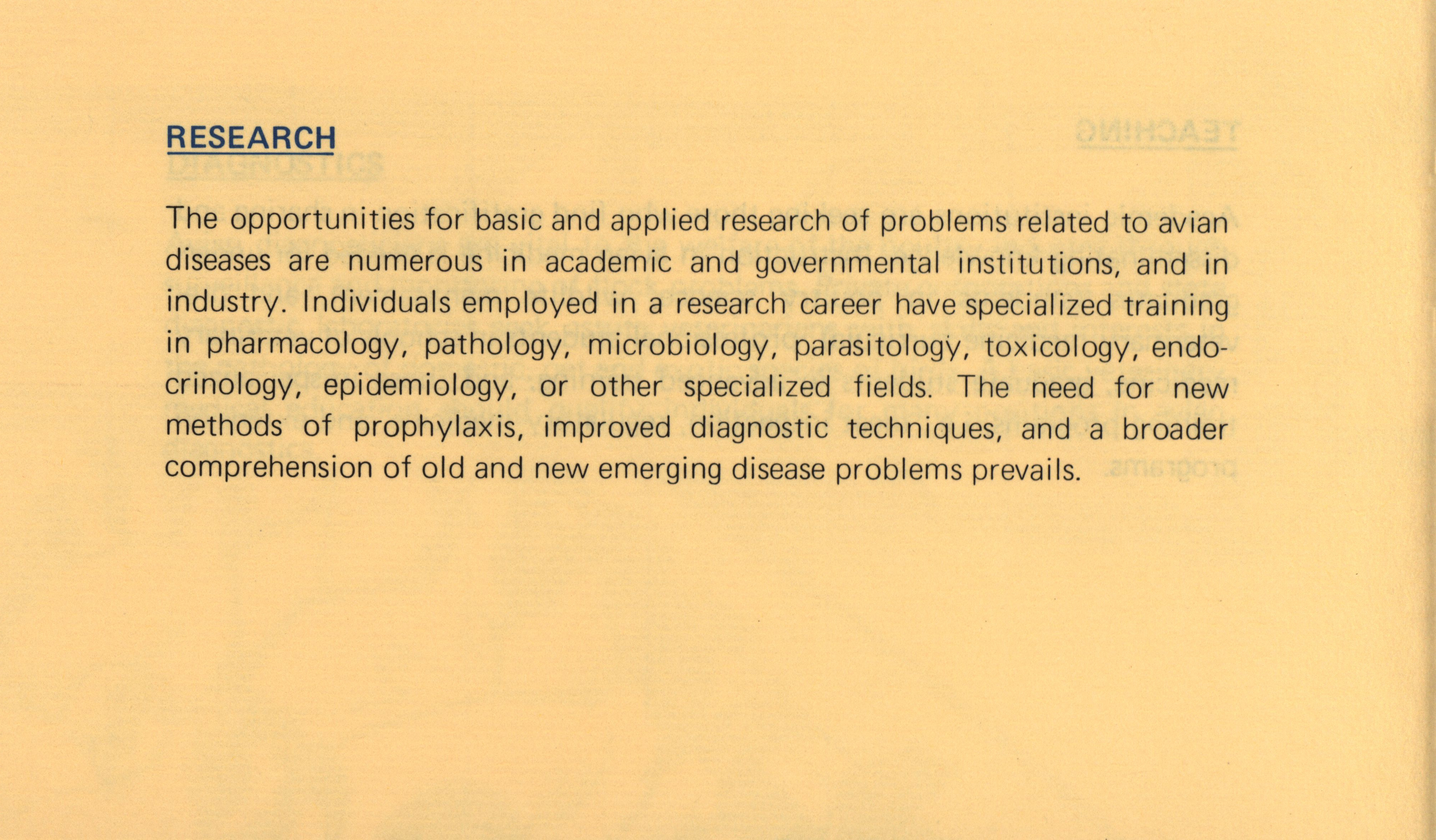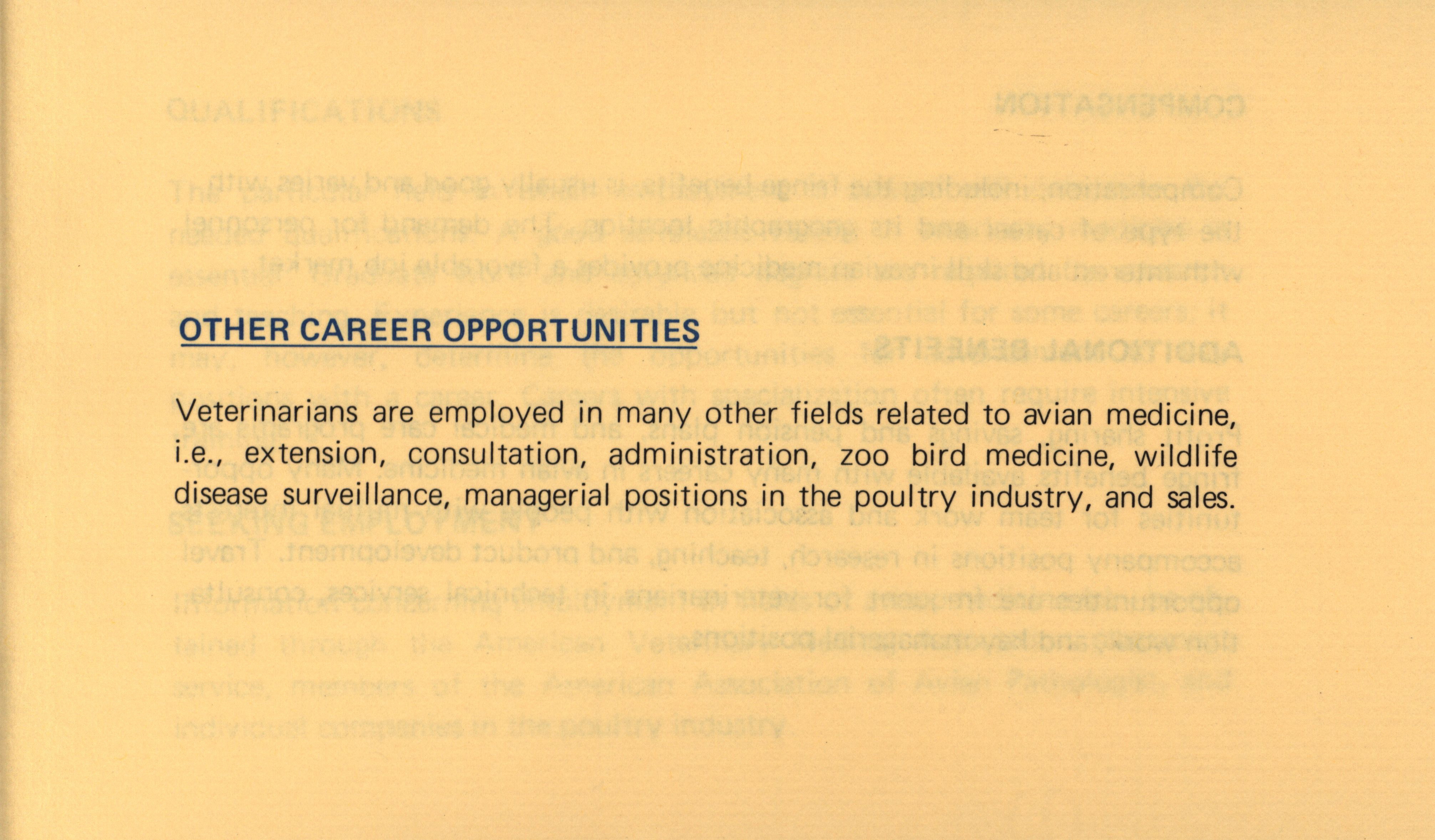 - "Booklet: American Association of Avian Pathologists, careers in avian medicine", American Association of Avian Pathologists Collection, Iowa State University Library Digital Collections