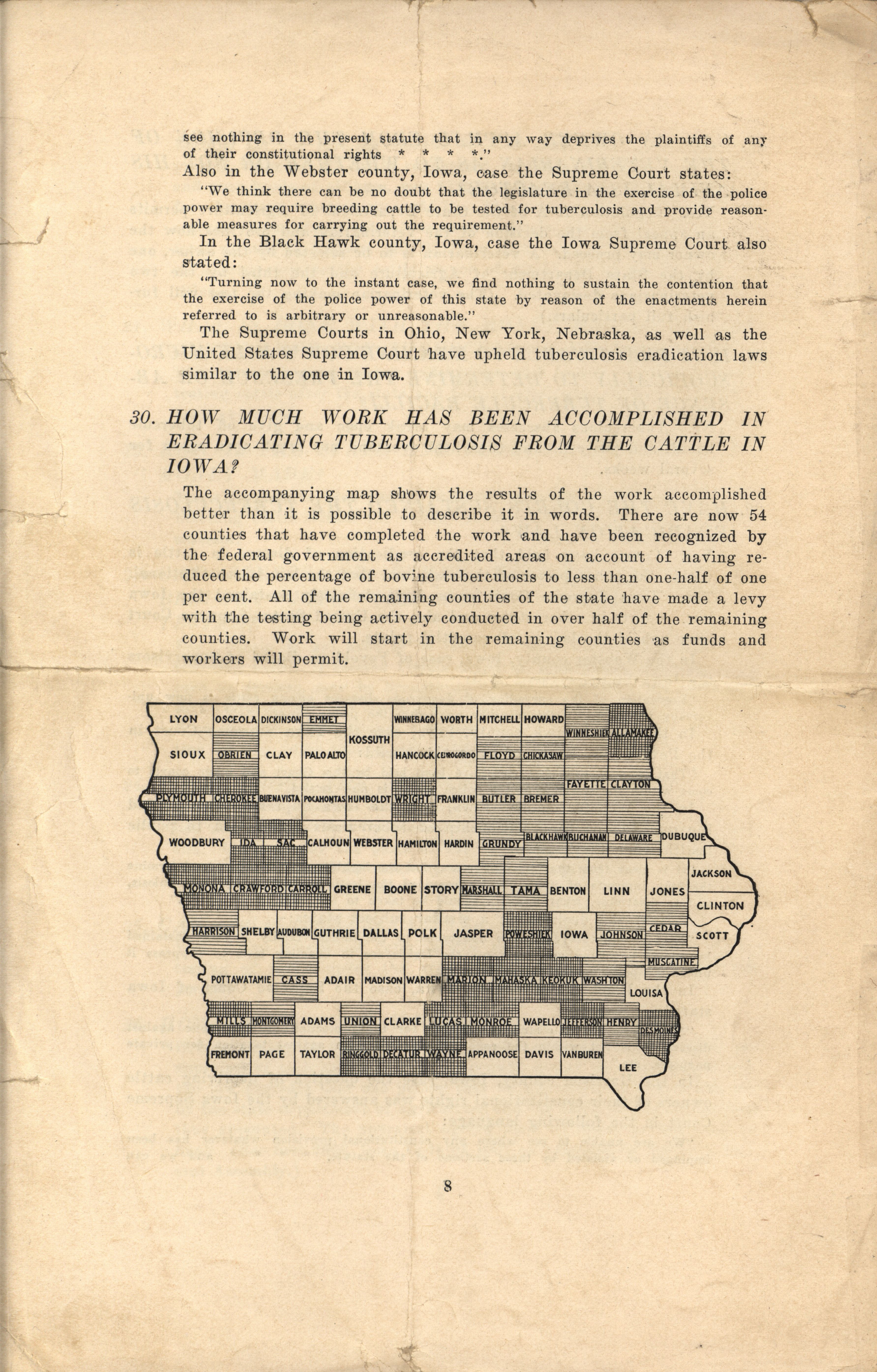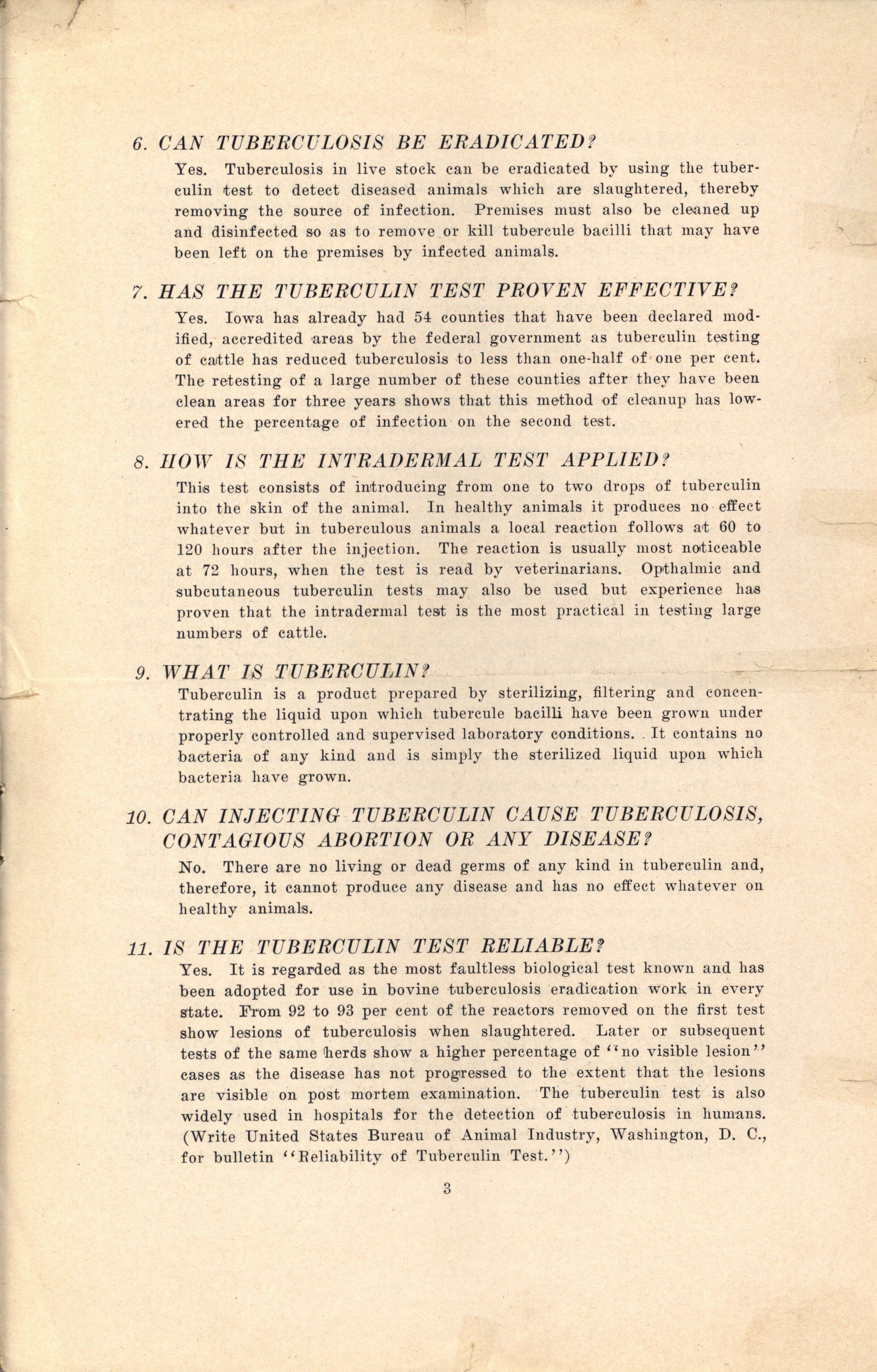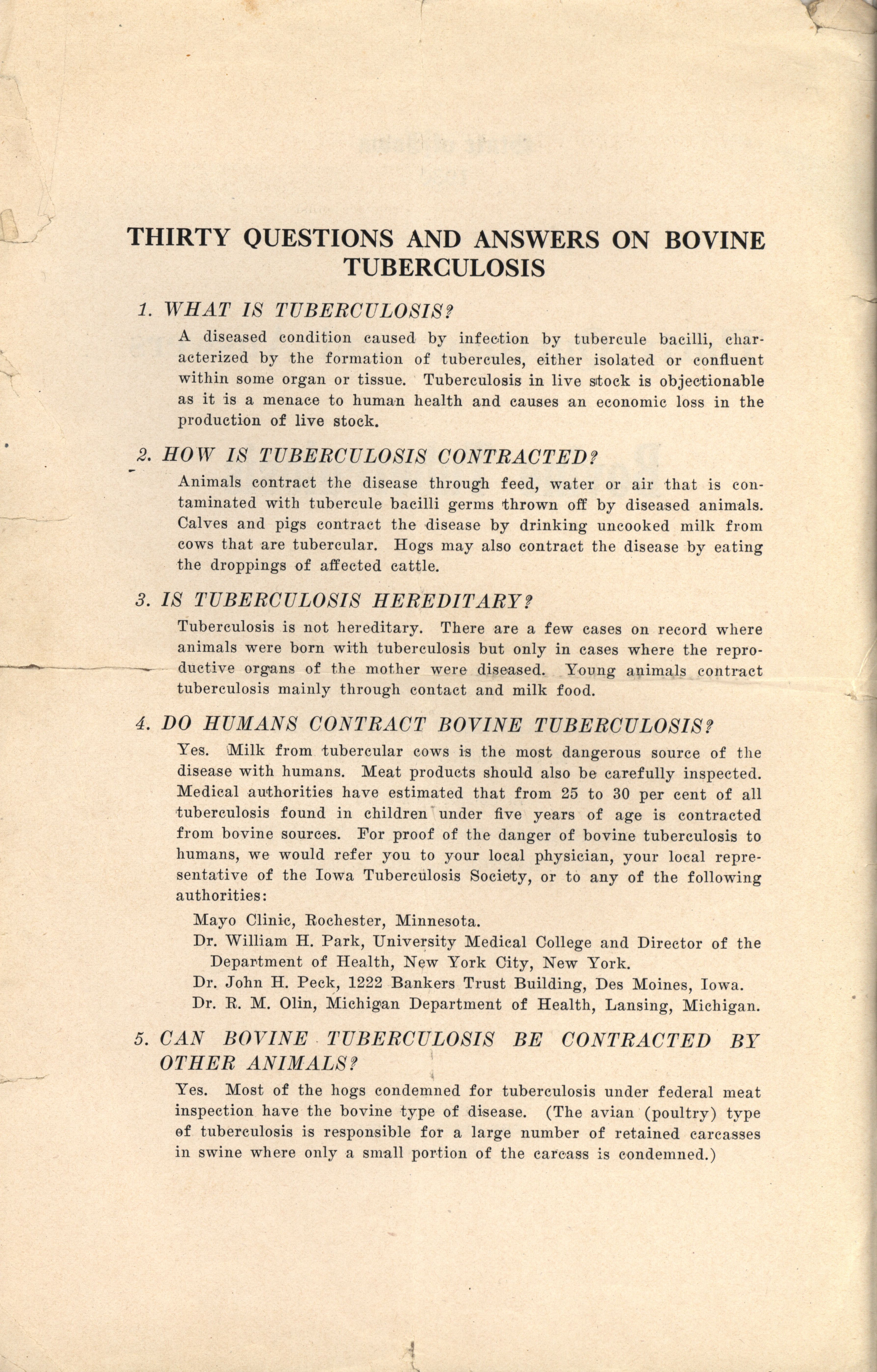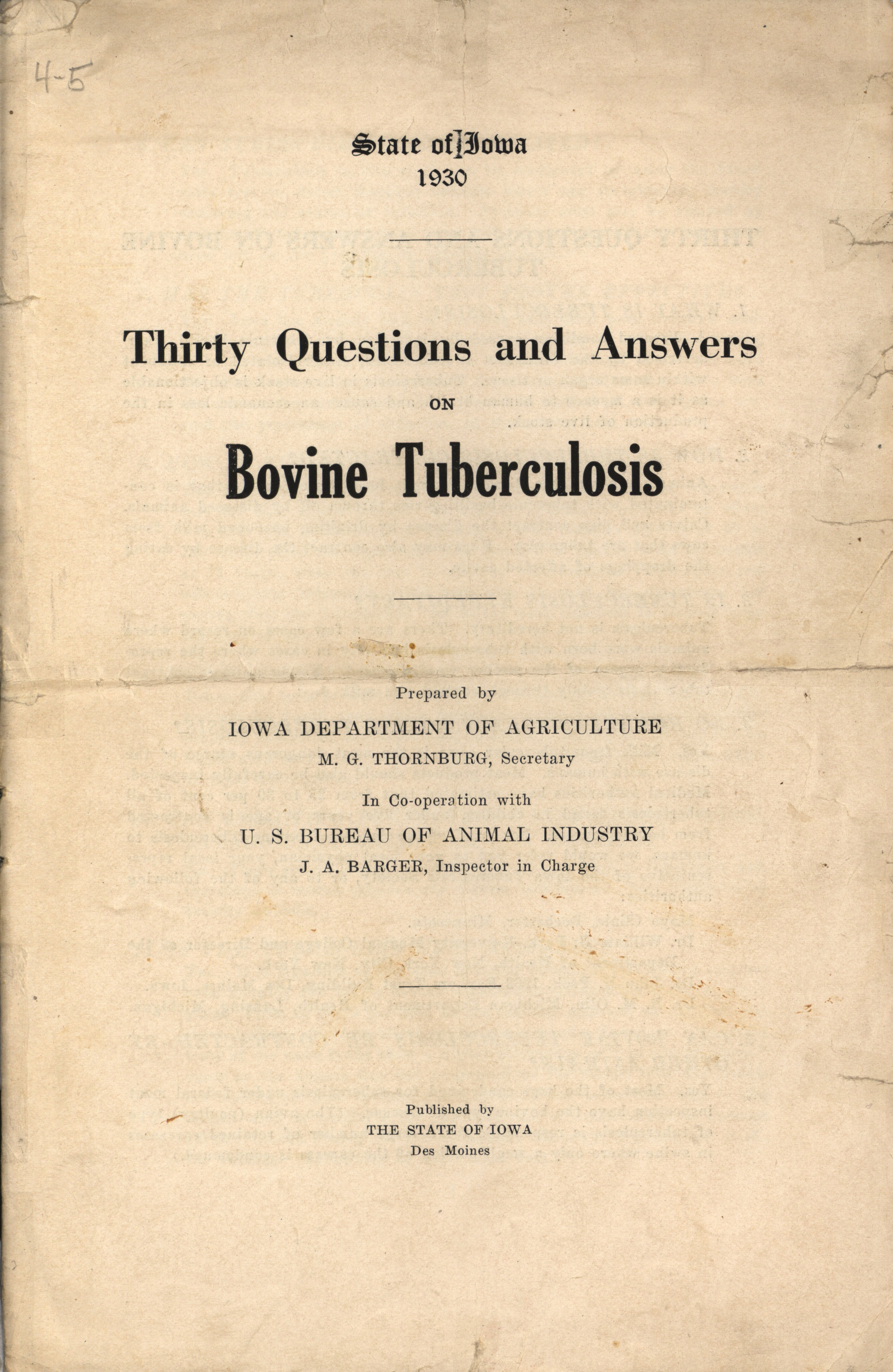 - "Thirty Questions and Answers on Bovine Tuberculosis: Prepared by Iowa Department of Agriculture", Activist Agriculture Collection, Iowa State University Library Digital Collections