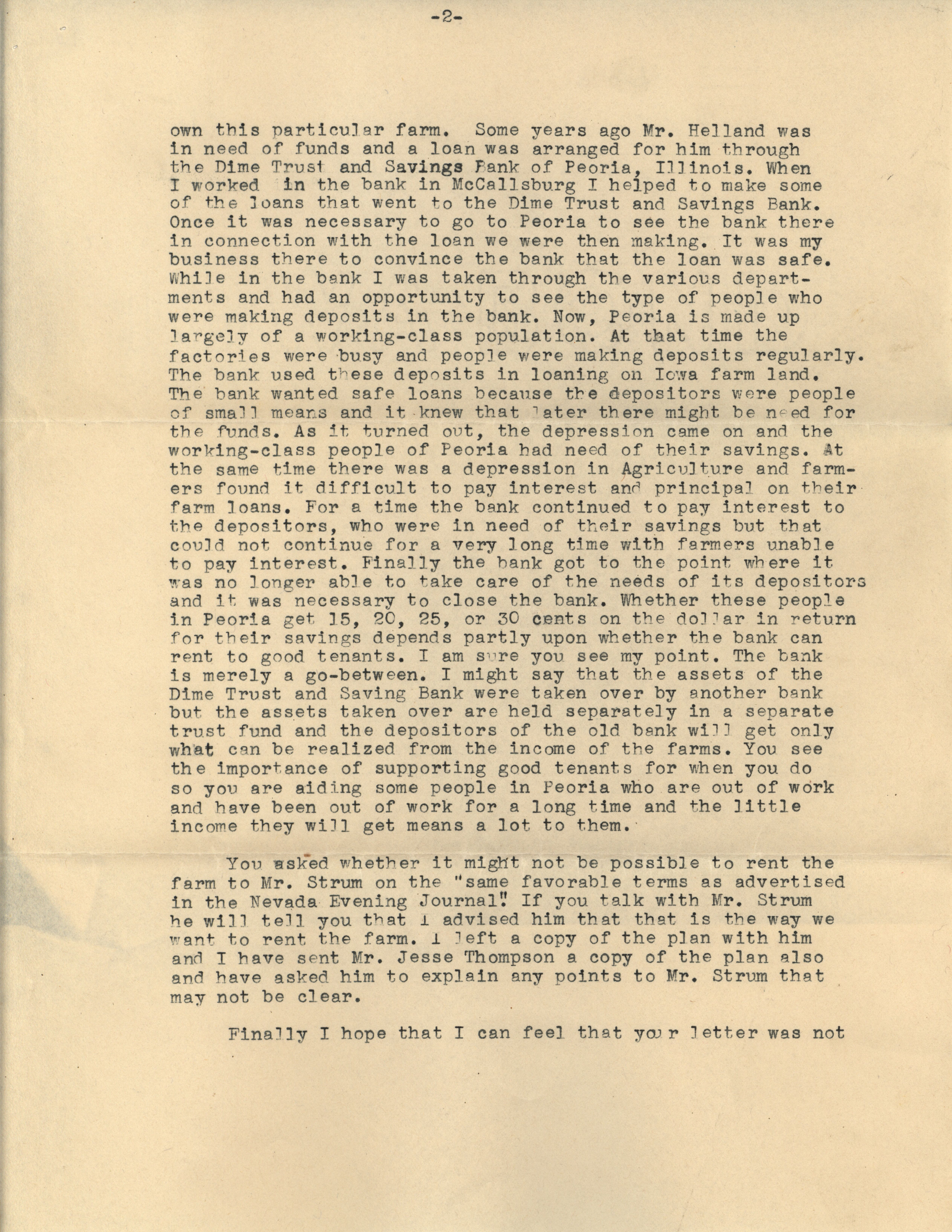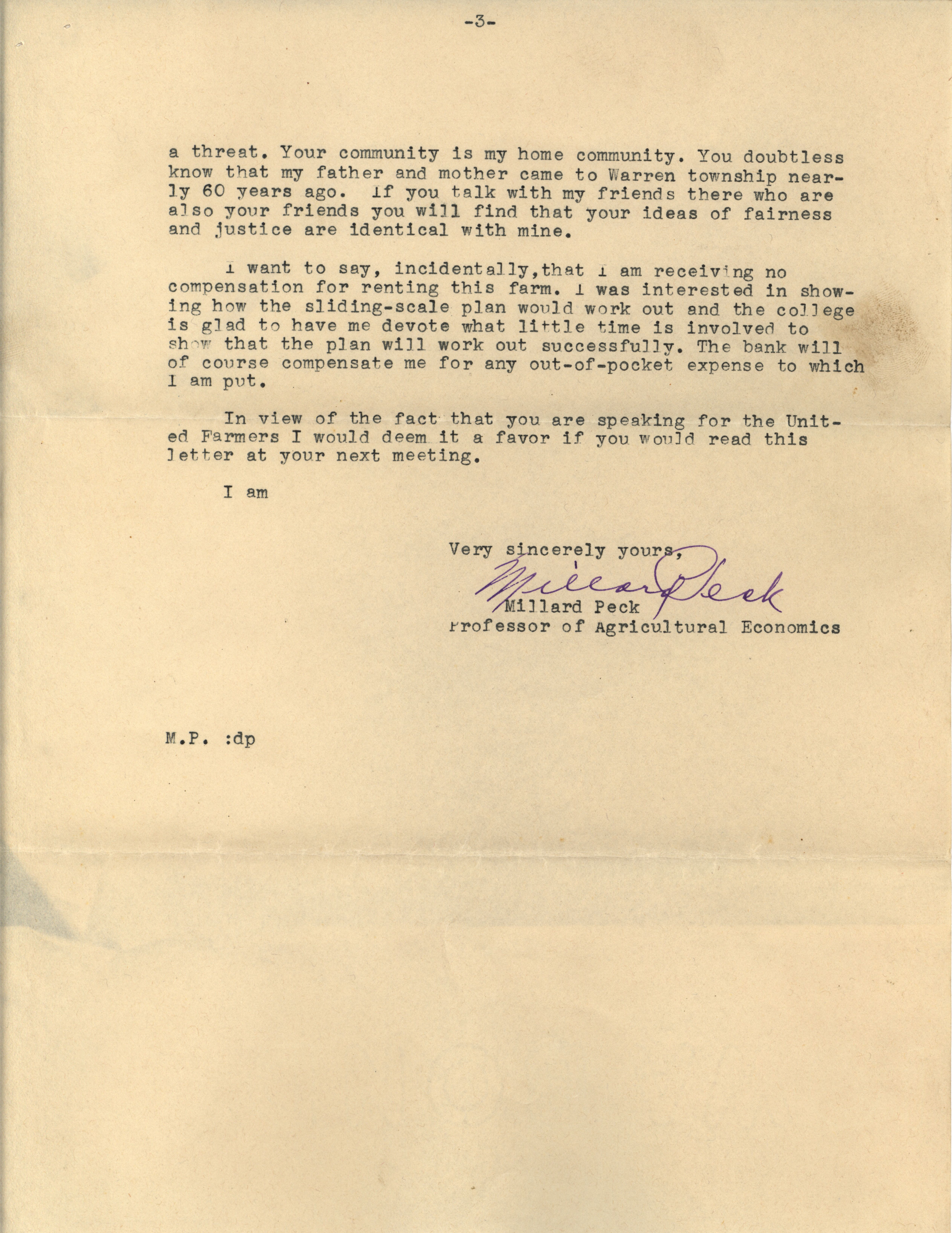 - Letter from Millard Peck to S.J. Nelson, describing rationale for granting farm tenancy to a particular farmer on the recommendation of the United Farmers of Story County.