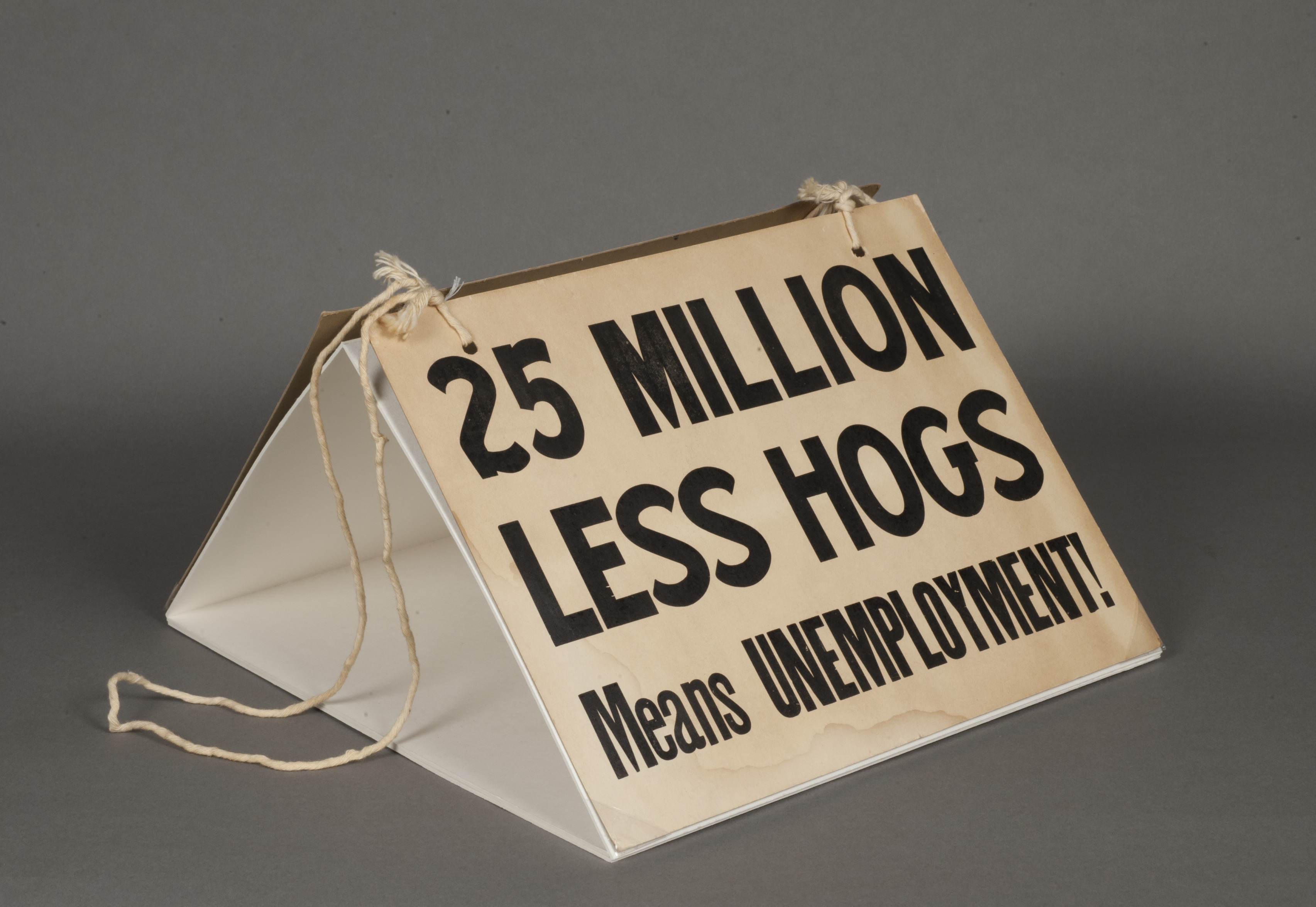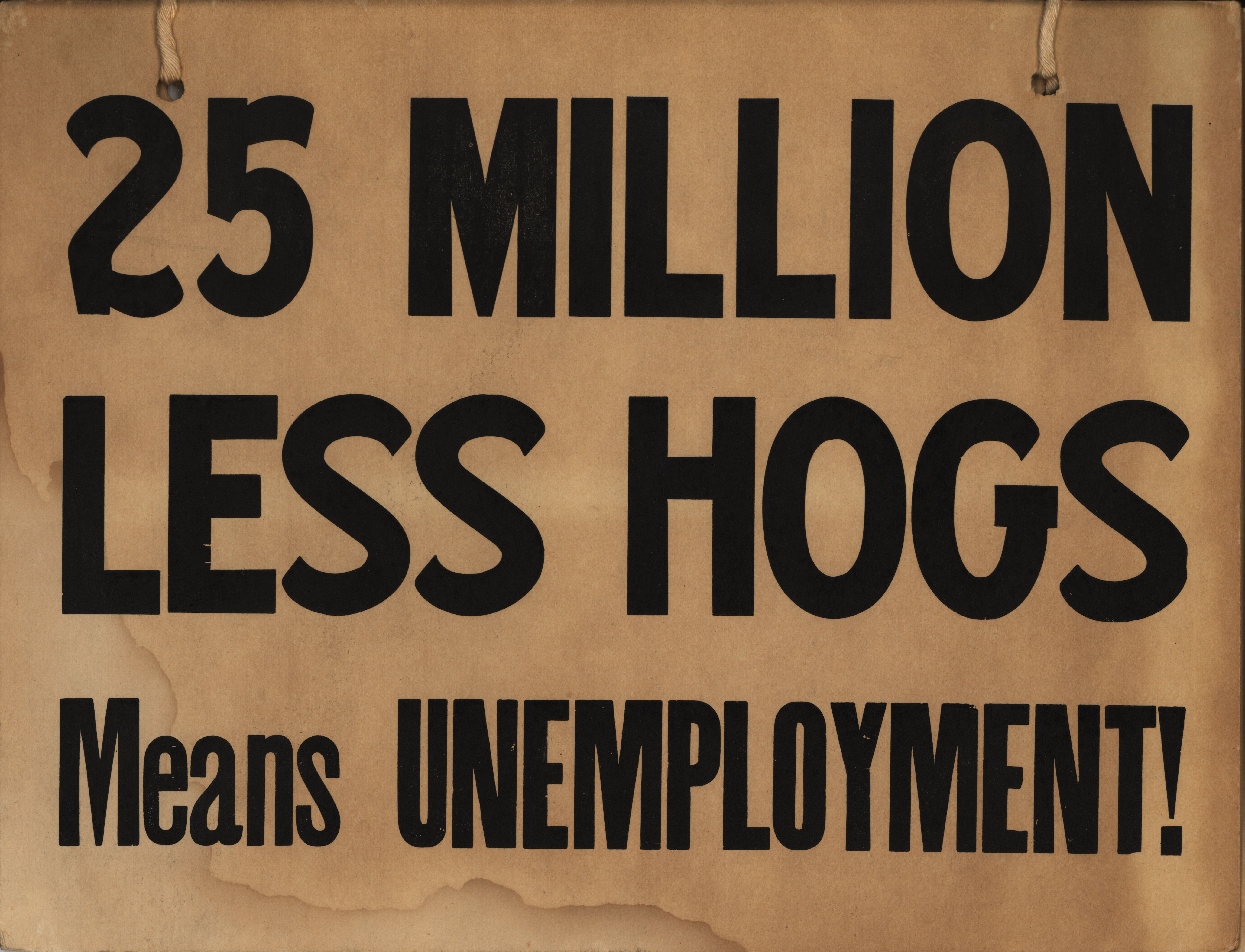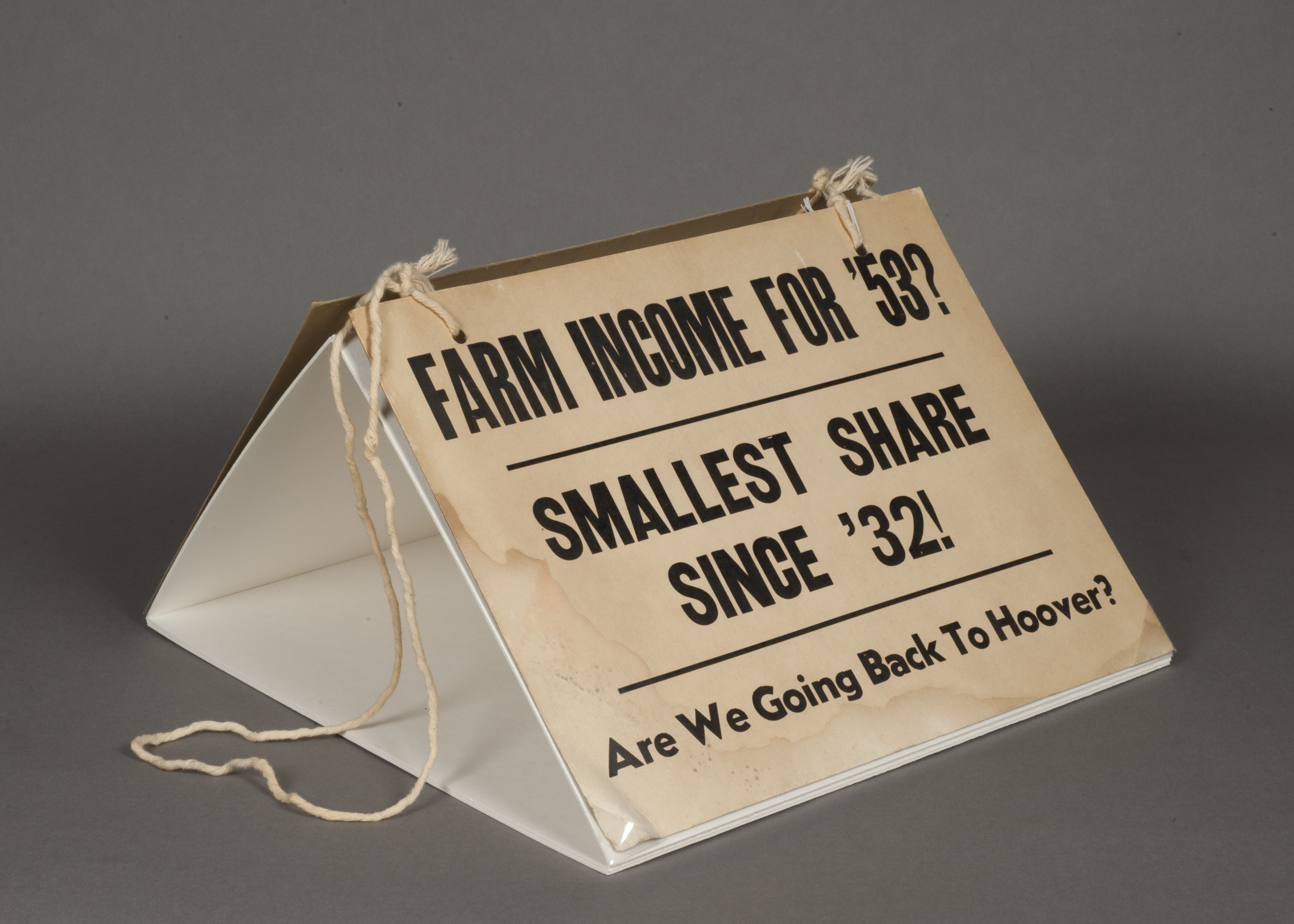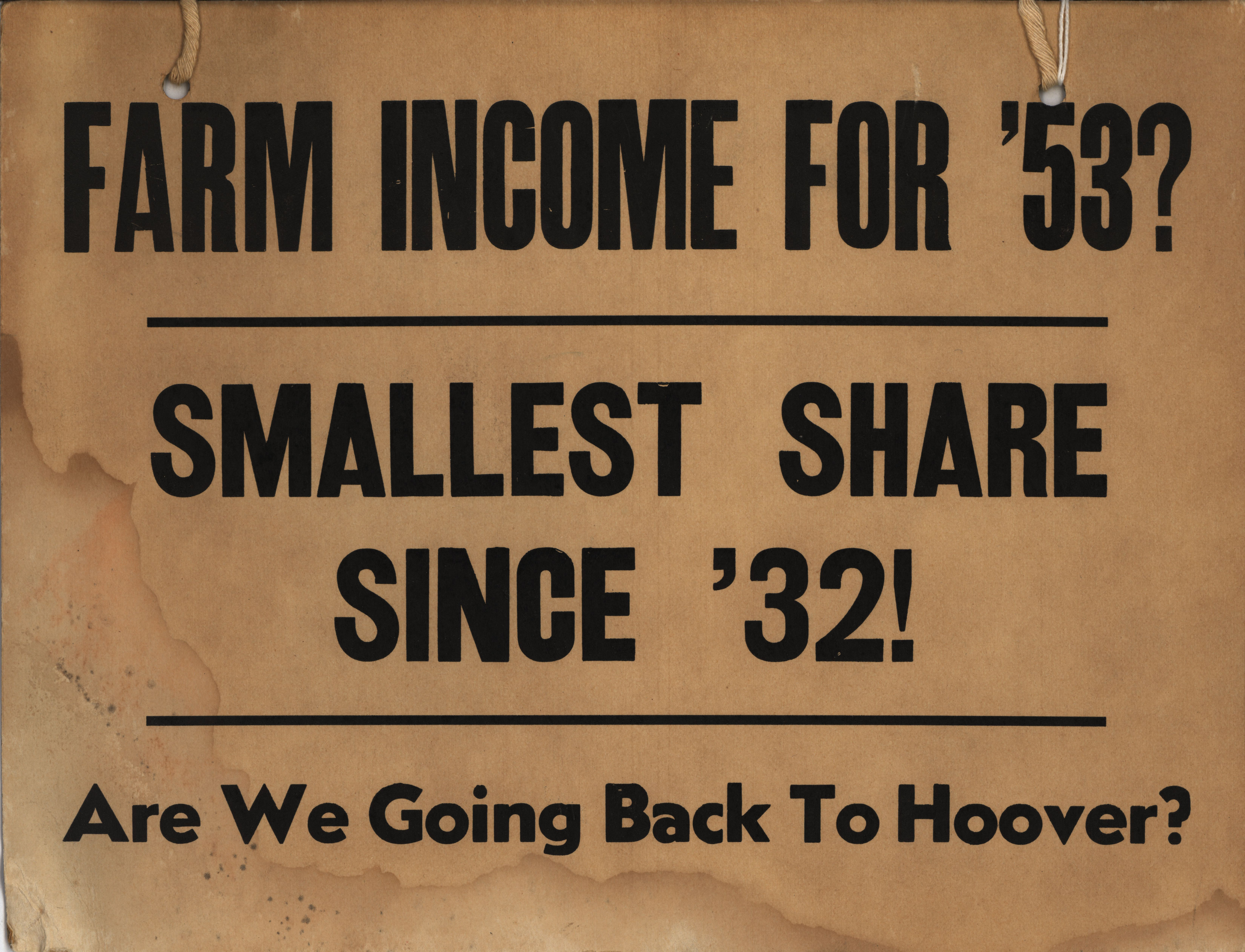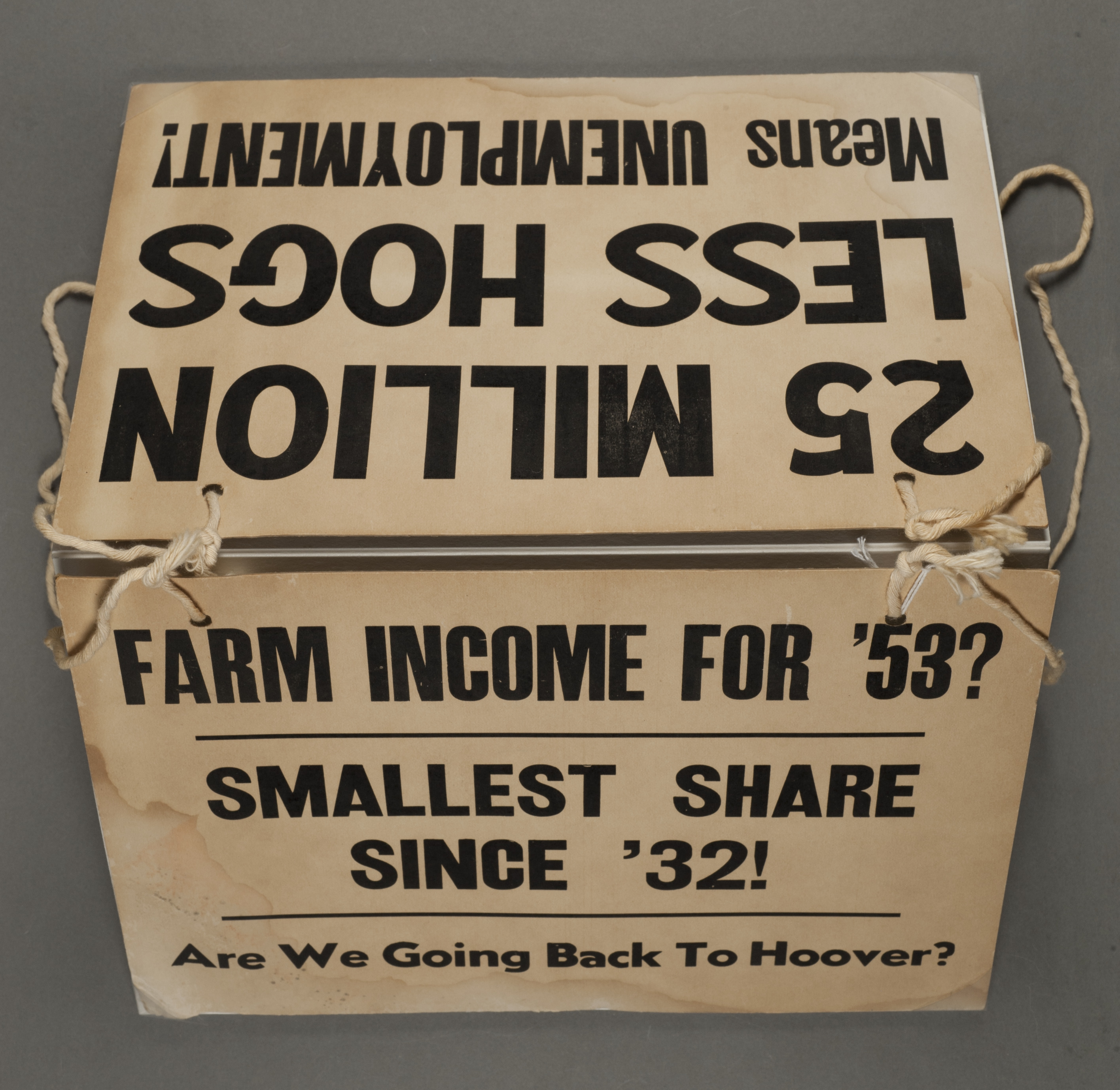 - Picket sign from the Iowa Farmers Union. One side reads, "Farm Income '53? Smallest Share since '32! Are We going Back to Hoover?" The other side reads, "25 Million Less Hogs Means Unemployment."