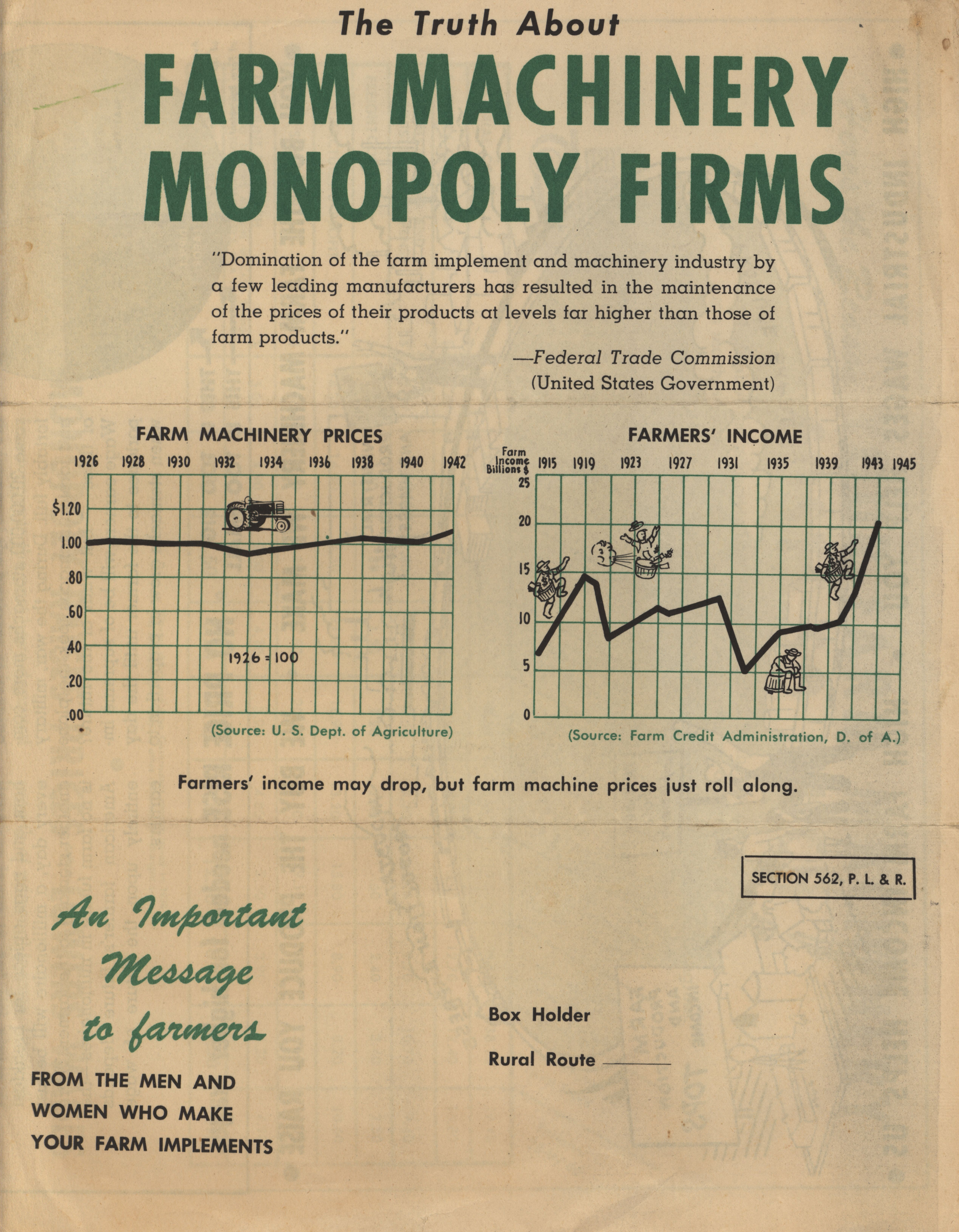 - "Here's the Reason Your Farm Machinery Cost So Much!", Activist Agriculture Collection, Iowa State University Library Digital Collections