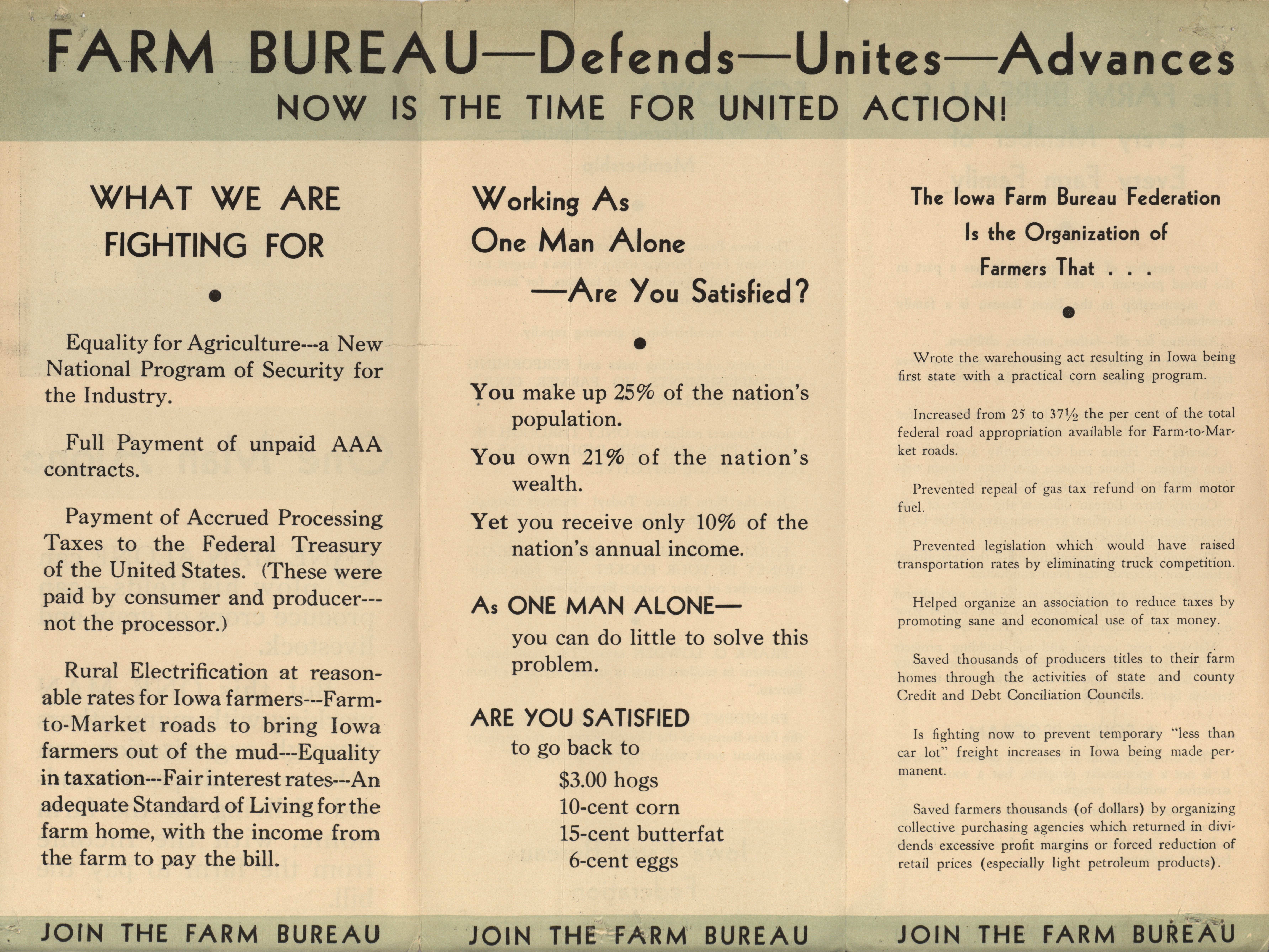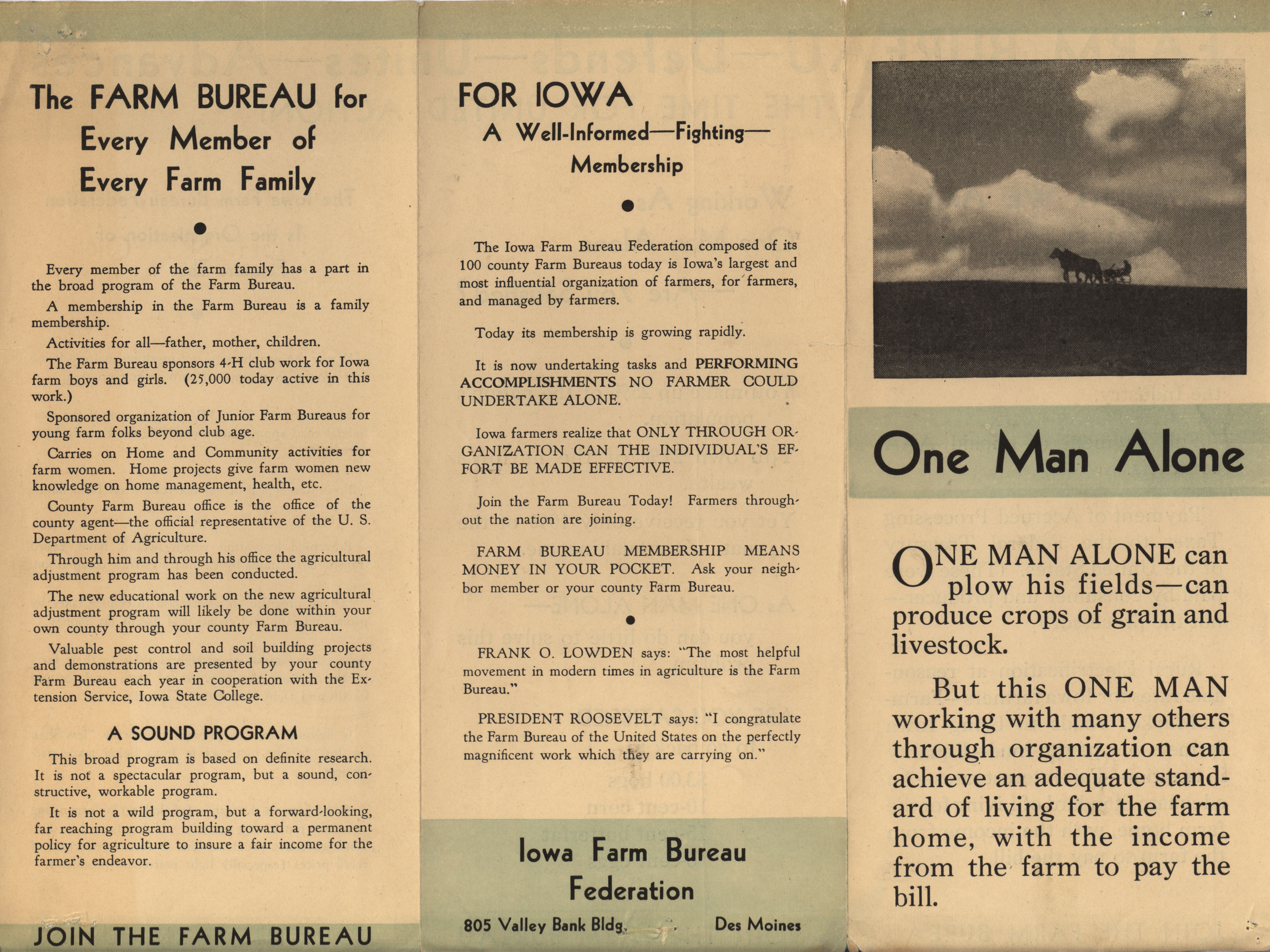 - Recruitment brochure titled "One Man Alone," promoting the Iowa Farm Bureau Federation.