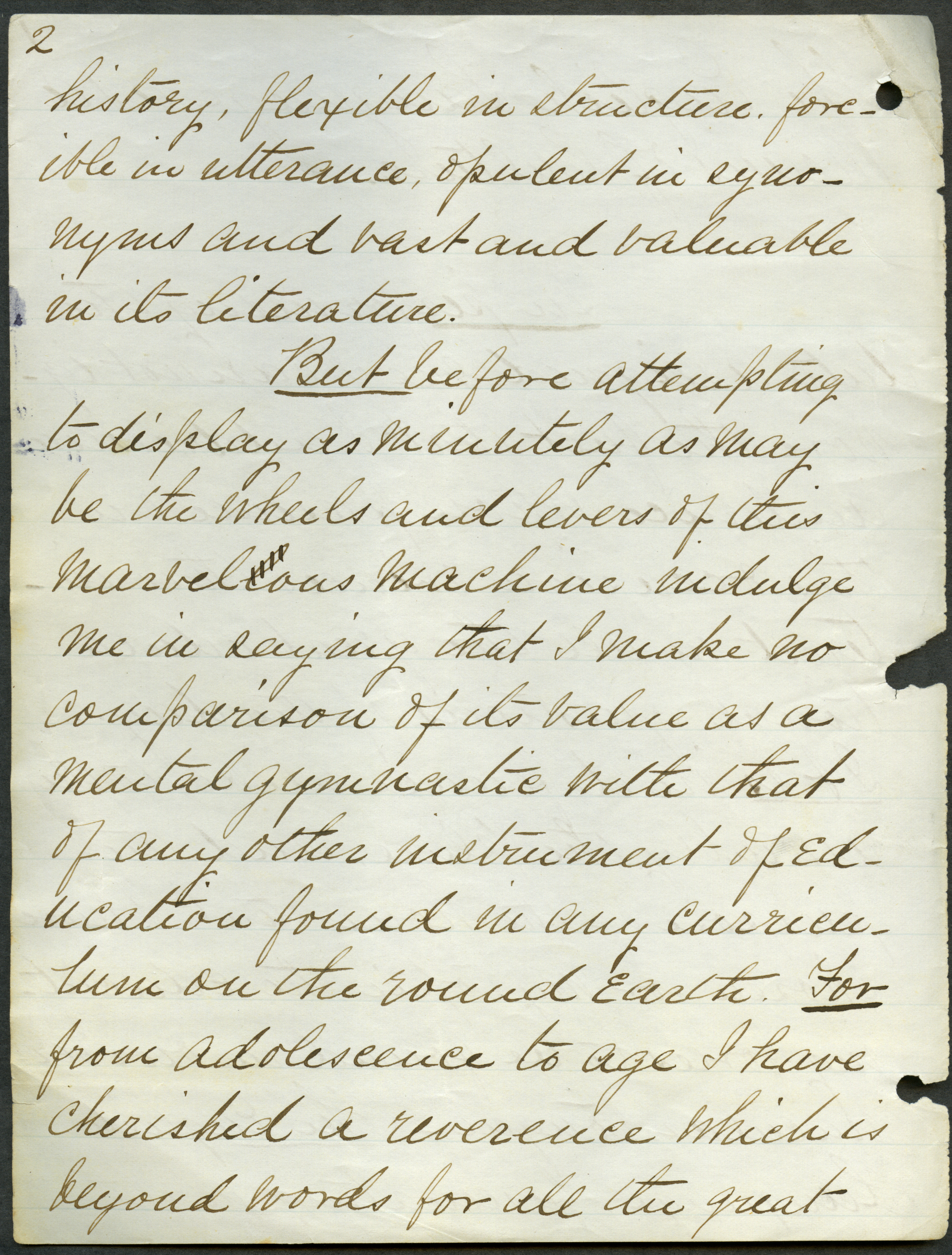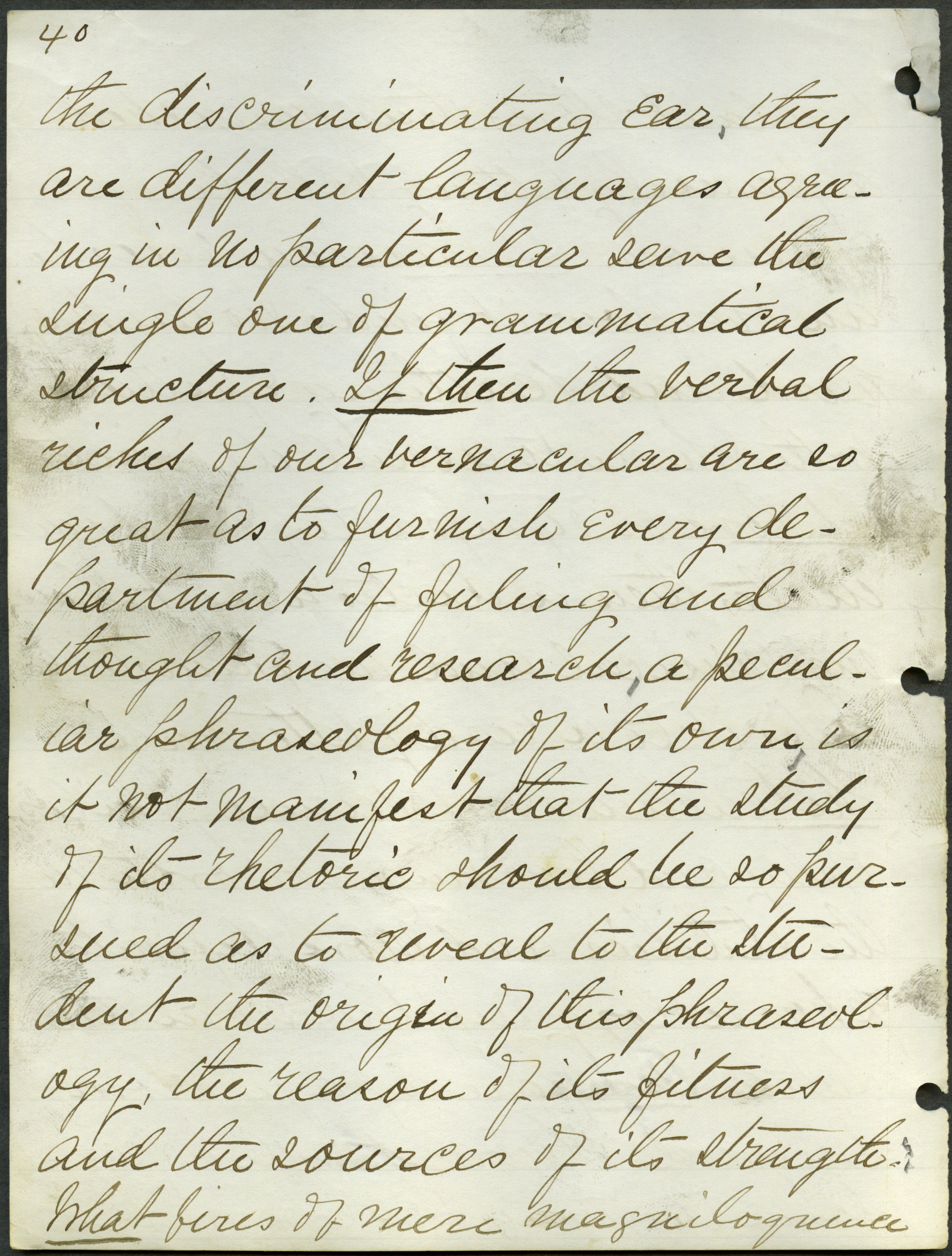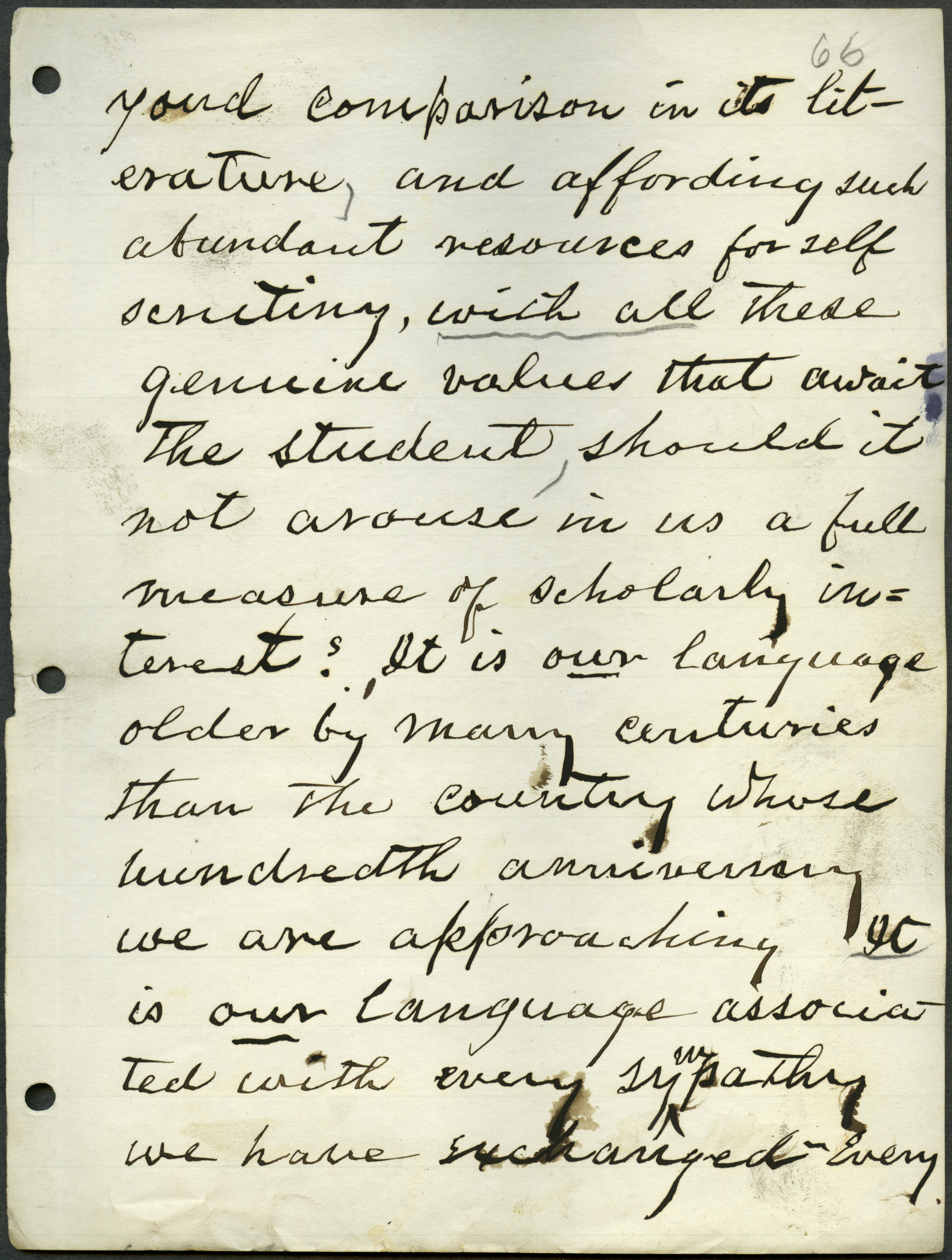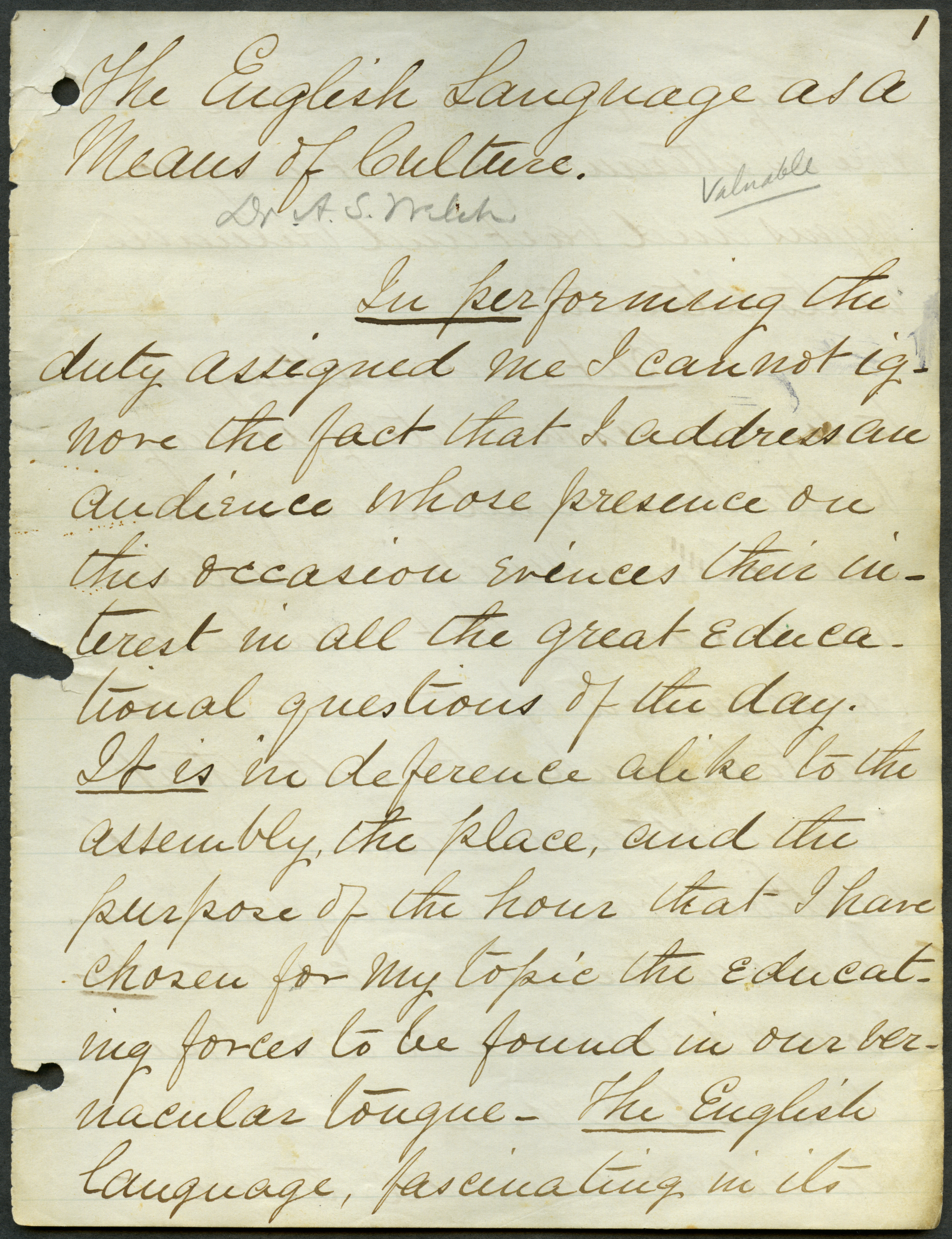 - Box 2, Folder 1: Welch discusses the importance of studying the English language as a means of learning about English culture and history and explains the relationship of language to intellectual culture.