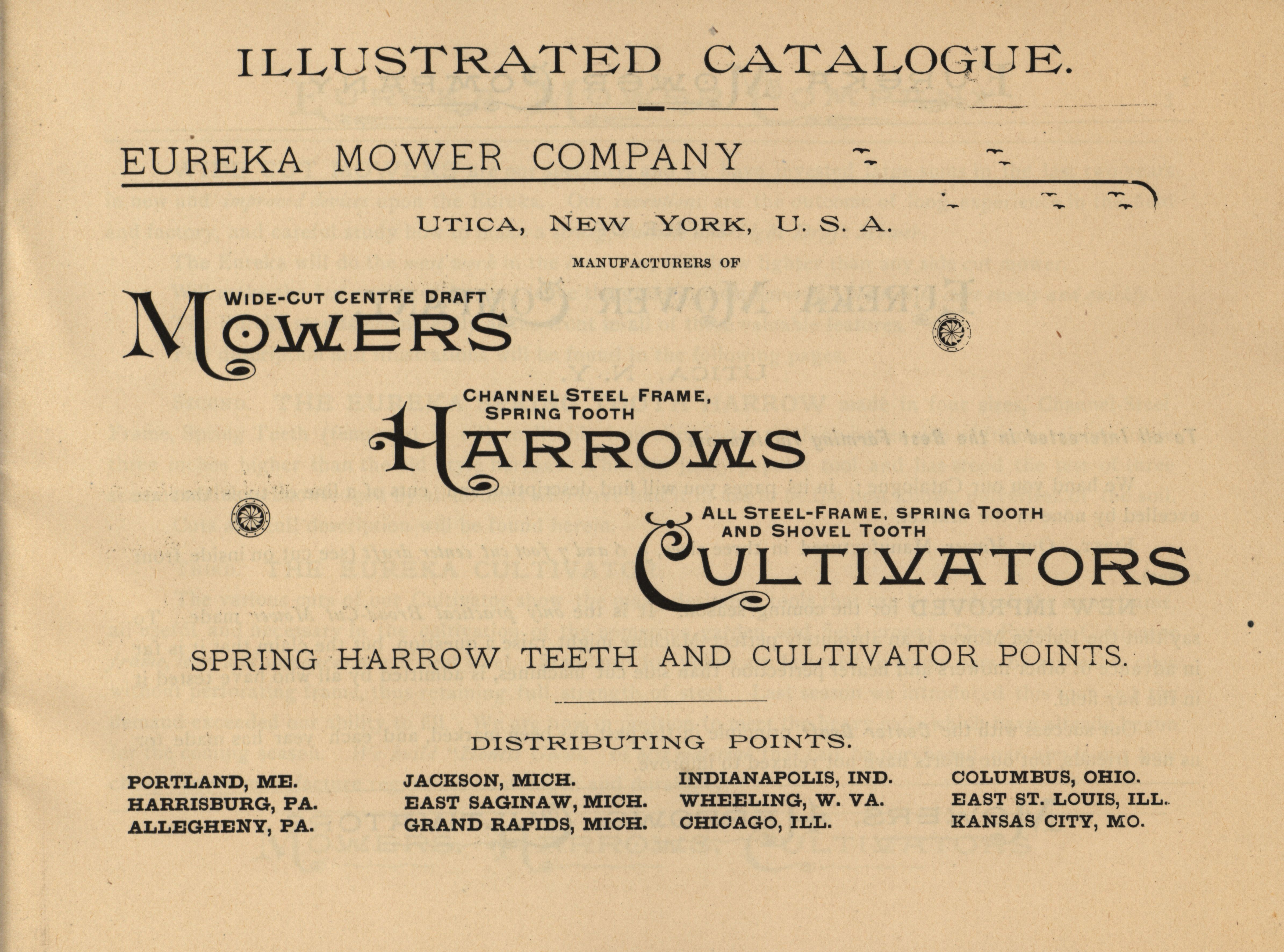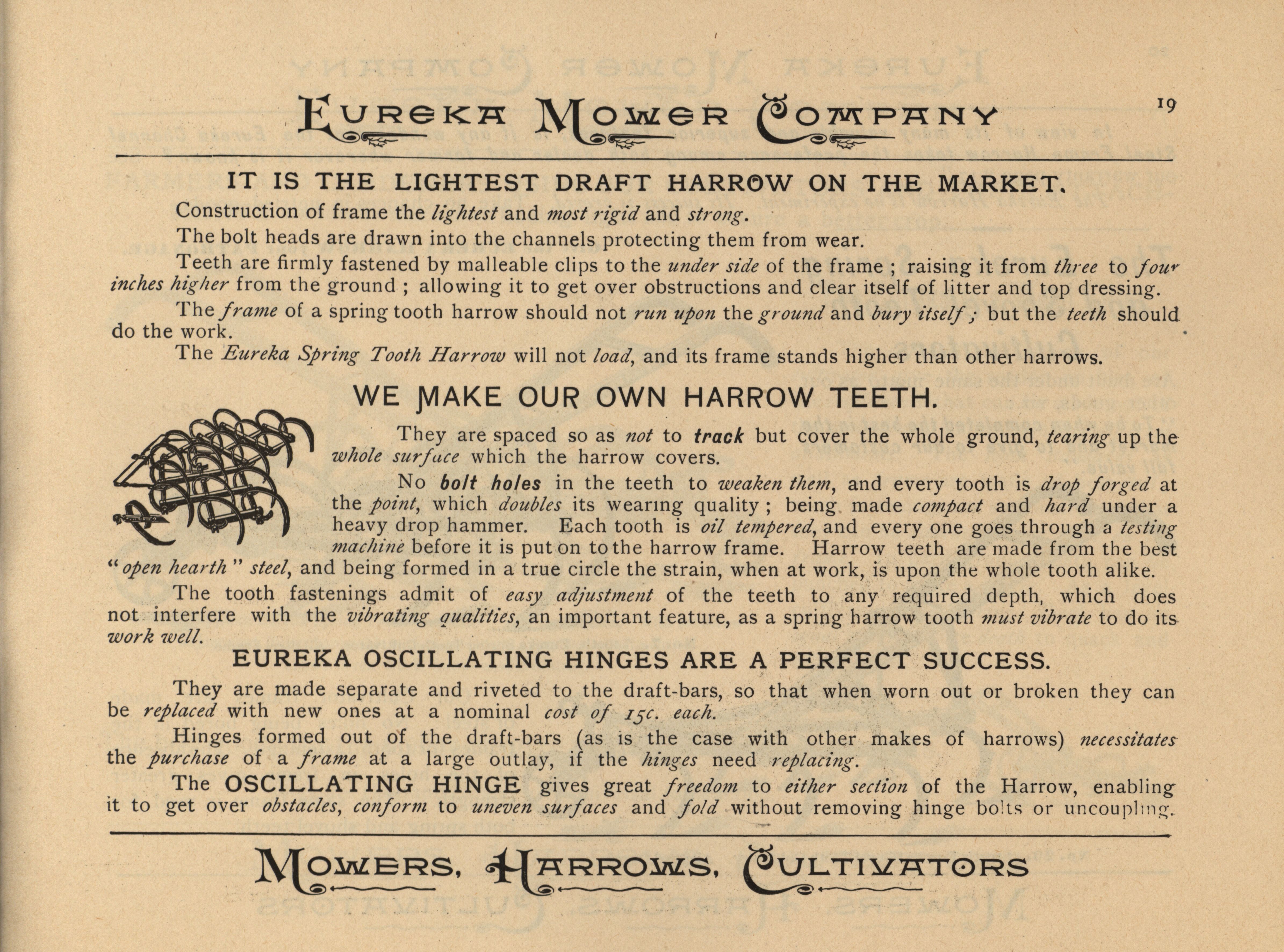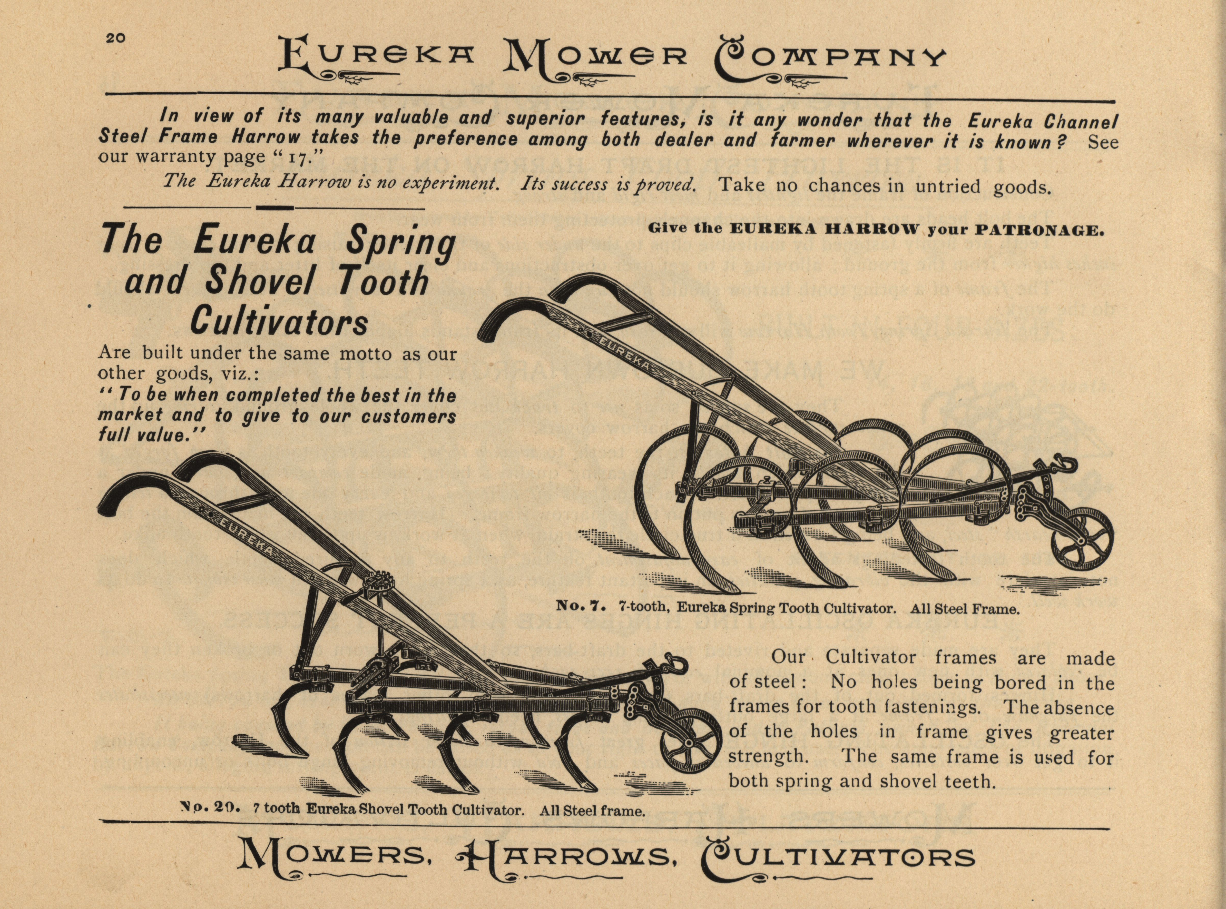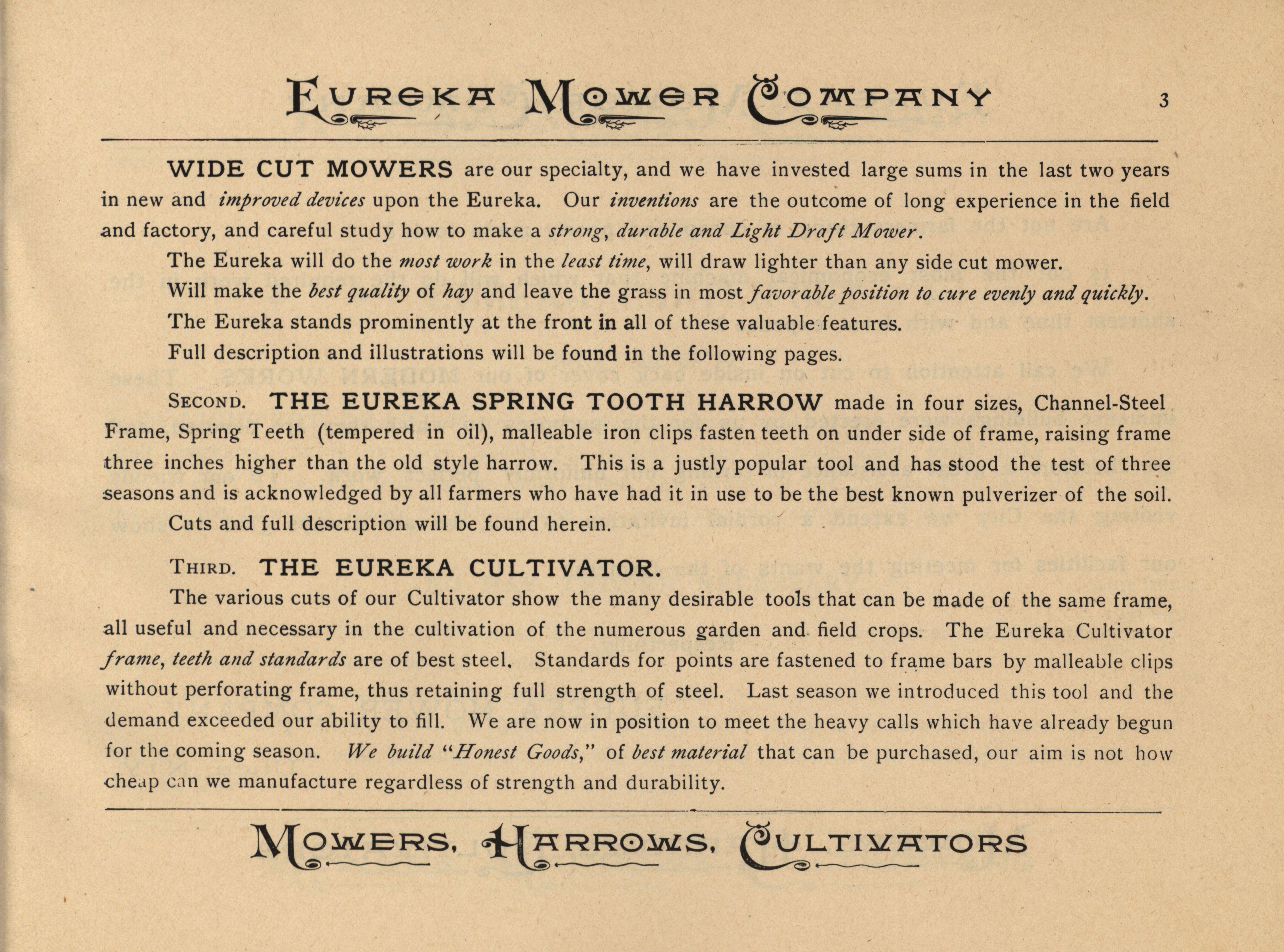 - Illustrated catalog describing the farm implements offered by Eureka Mower Company.