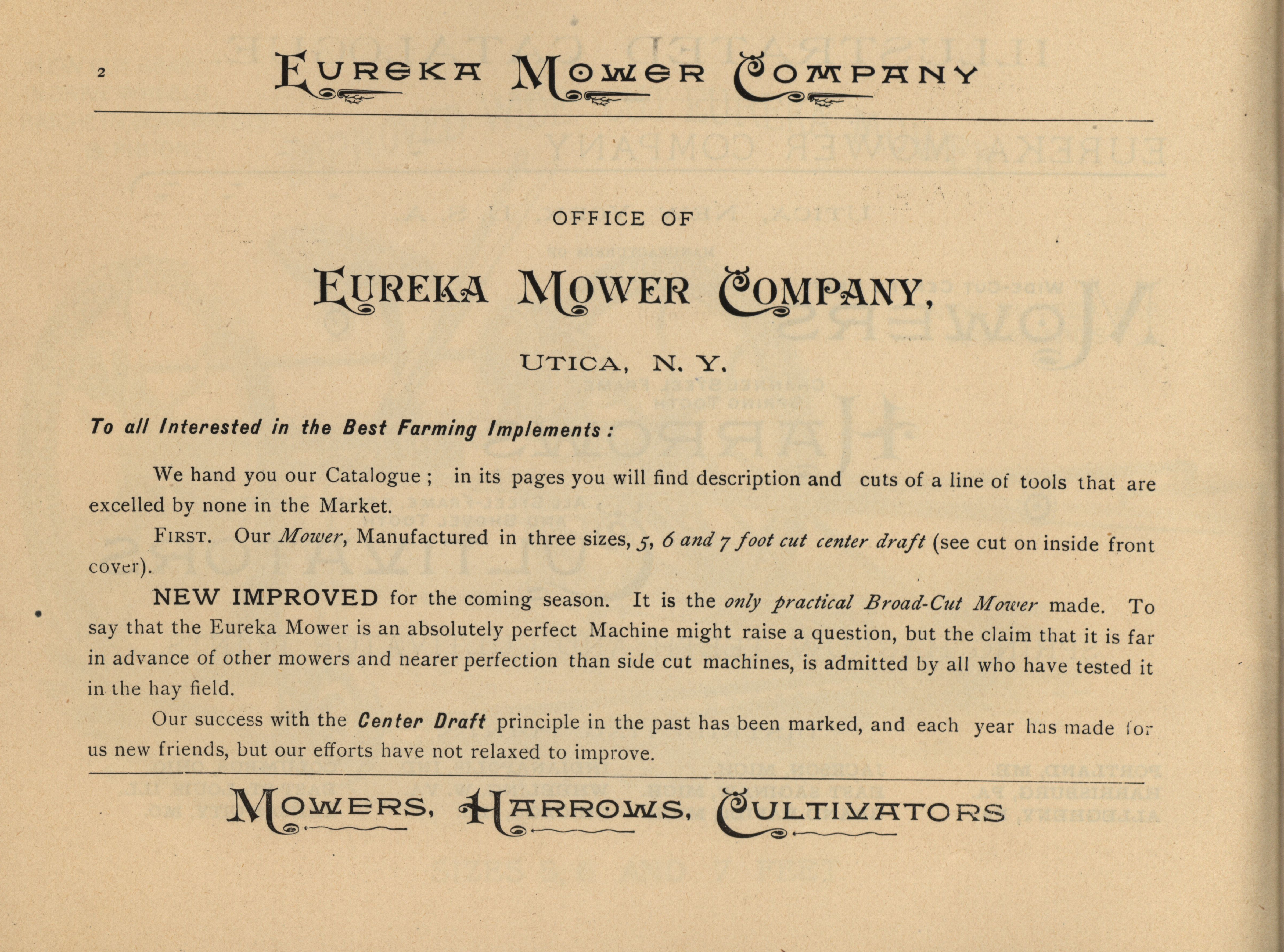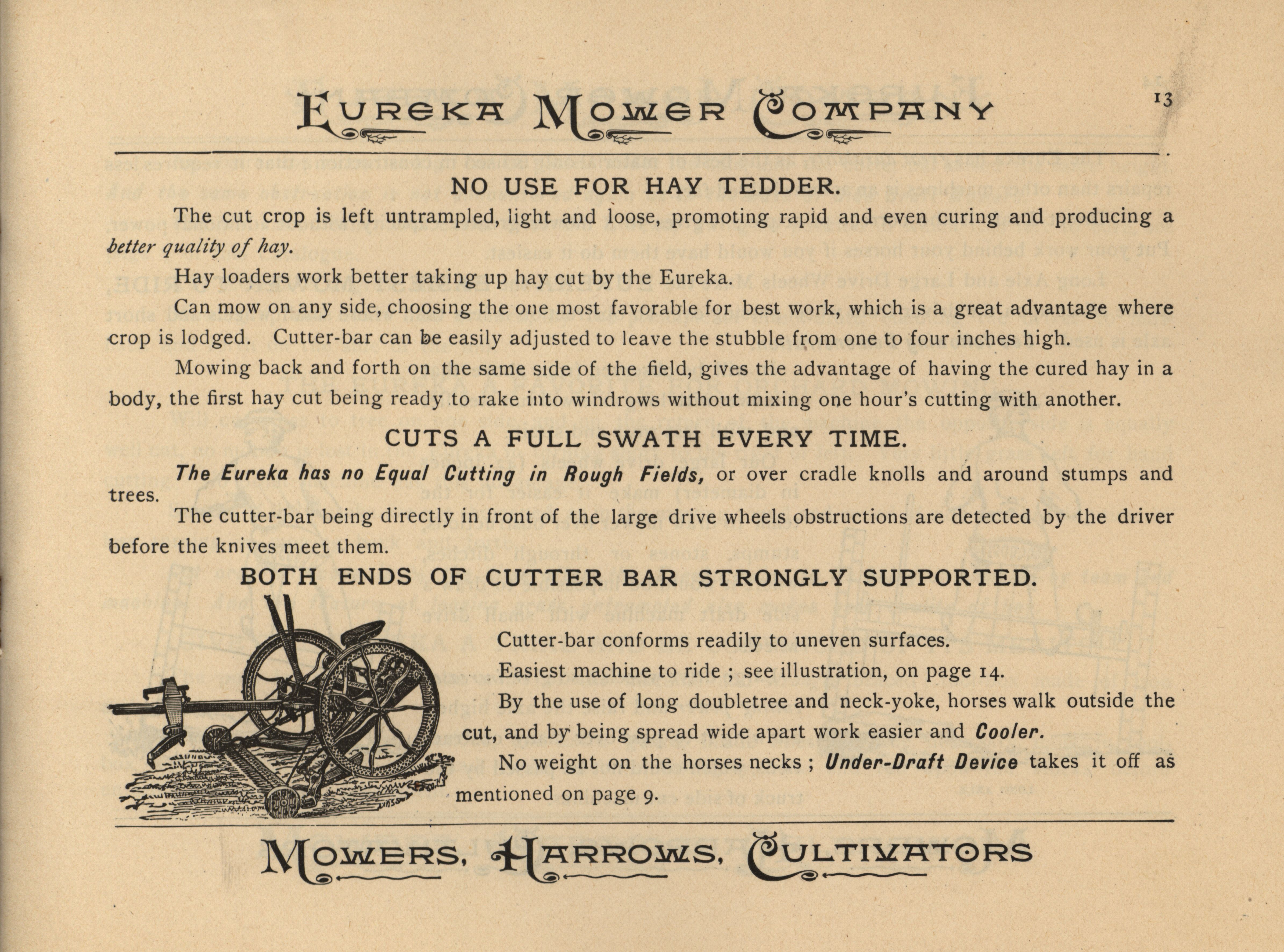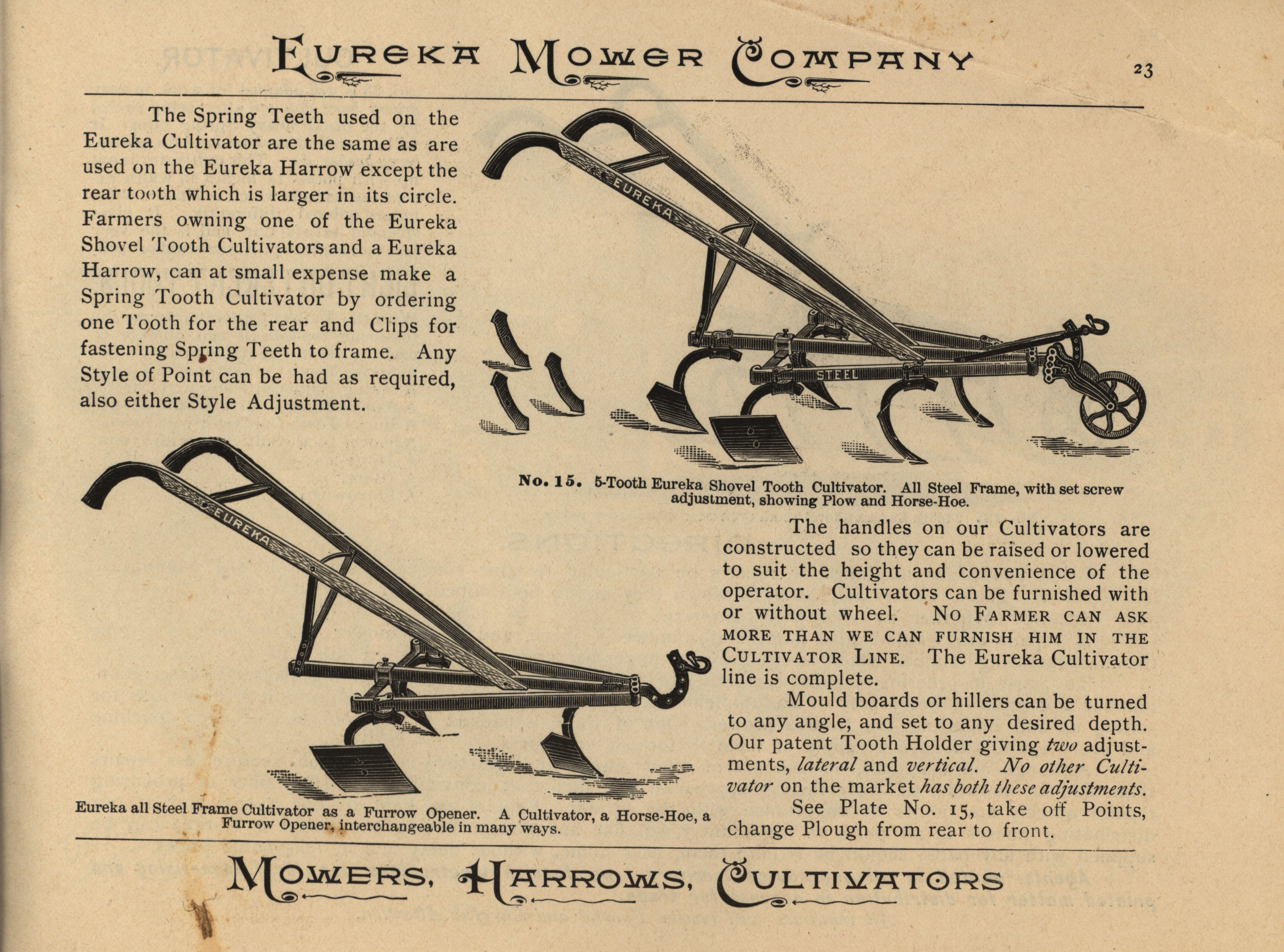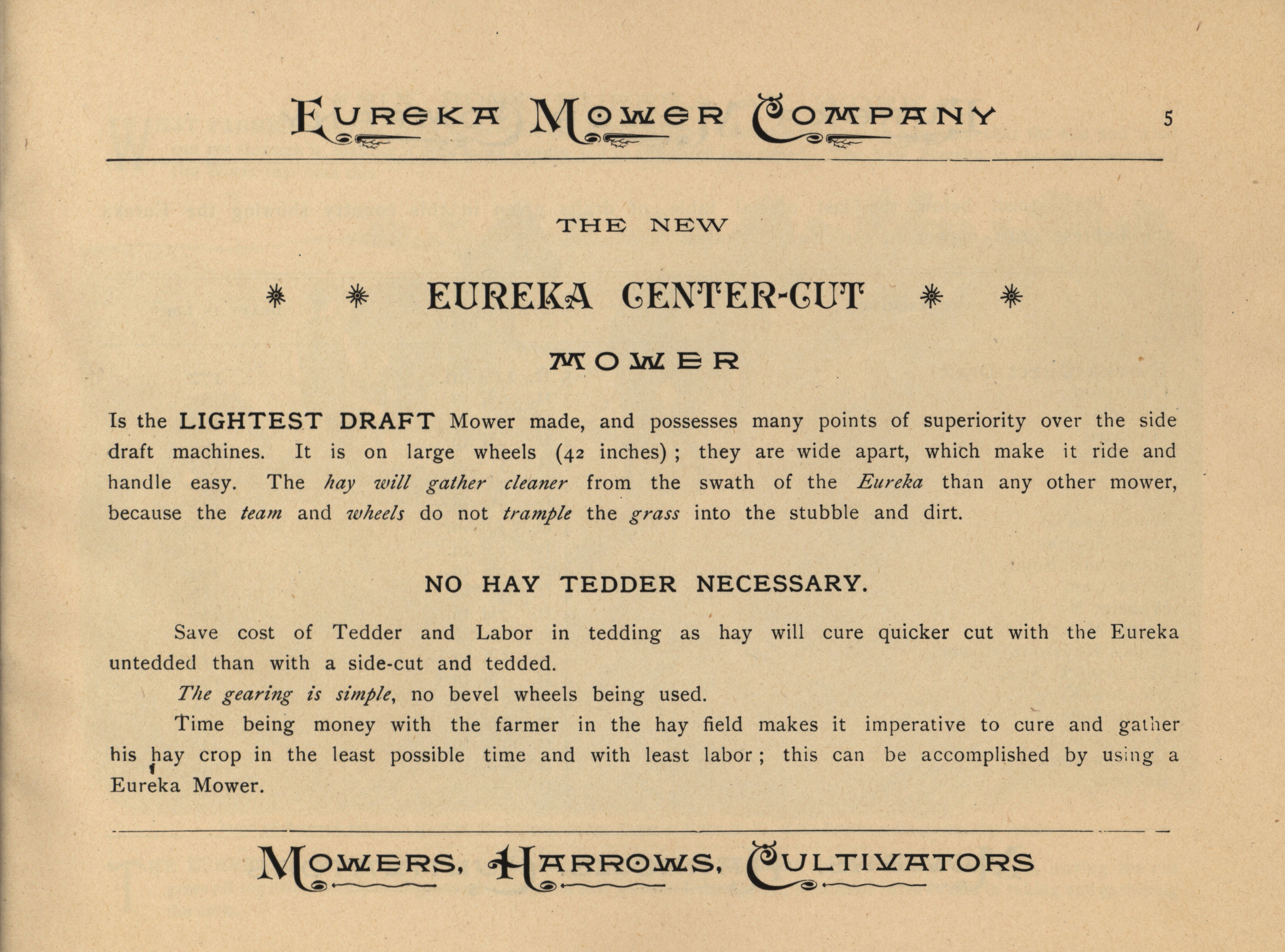 - Illustrated catalog describing the farm implements offered by Eureka Mower Company.