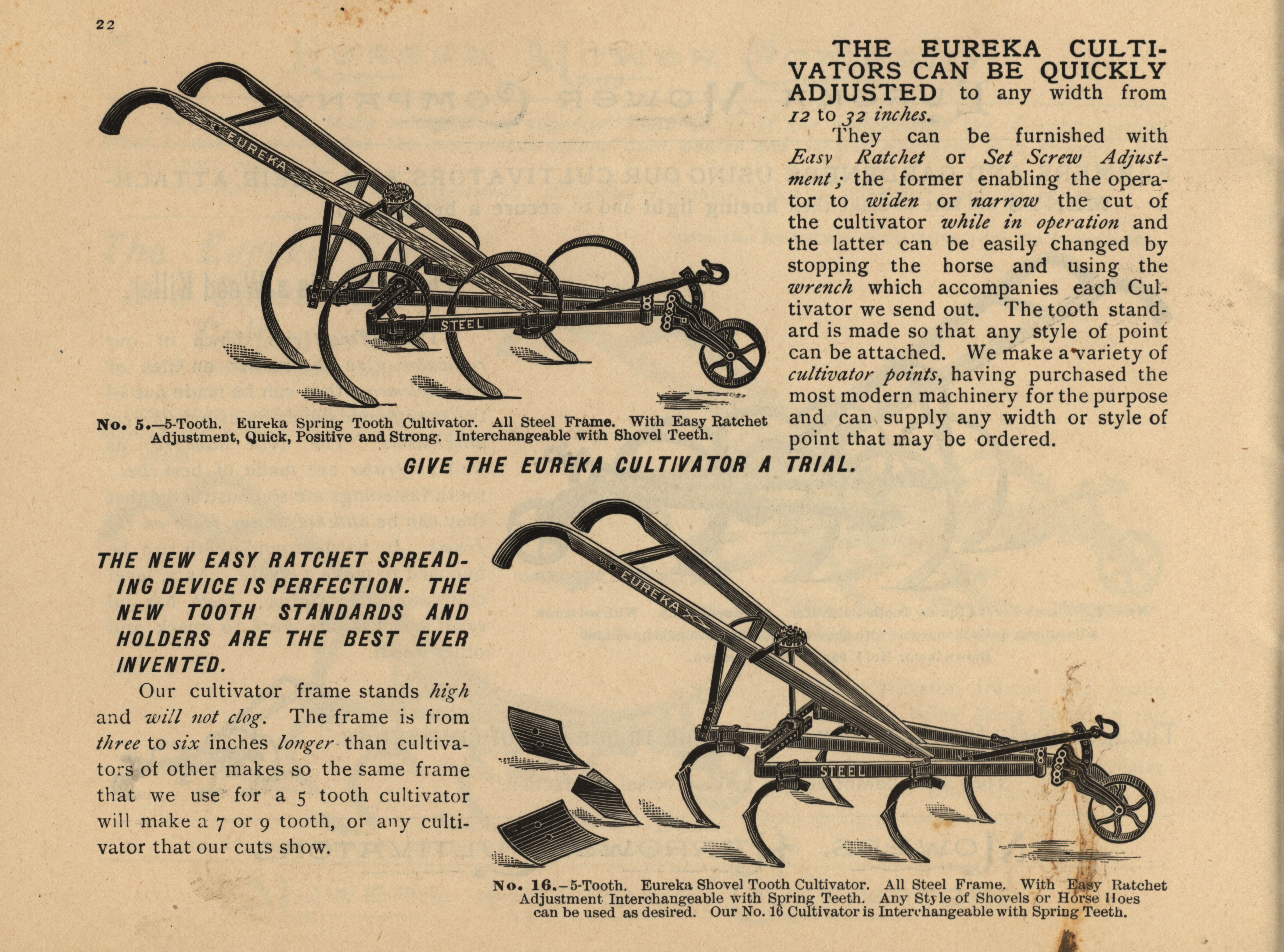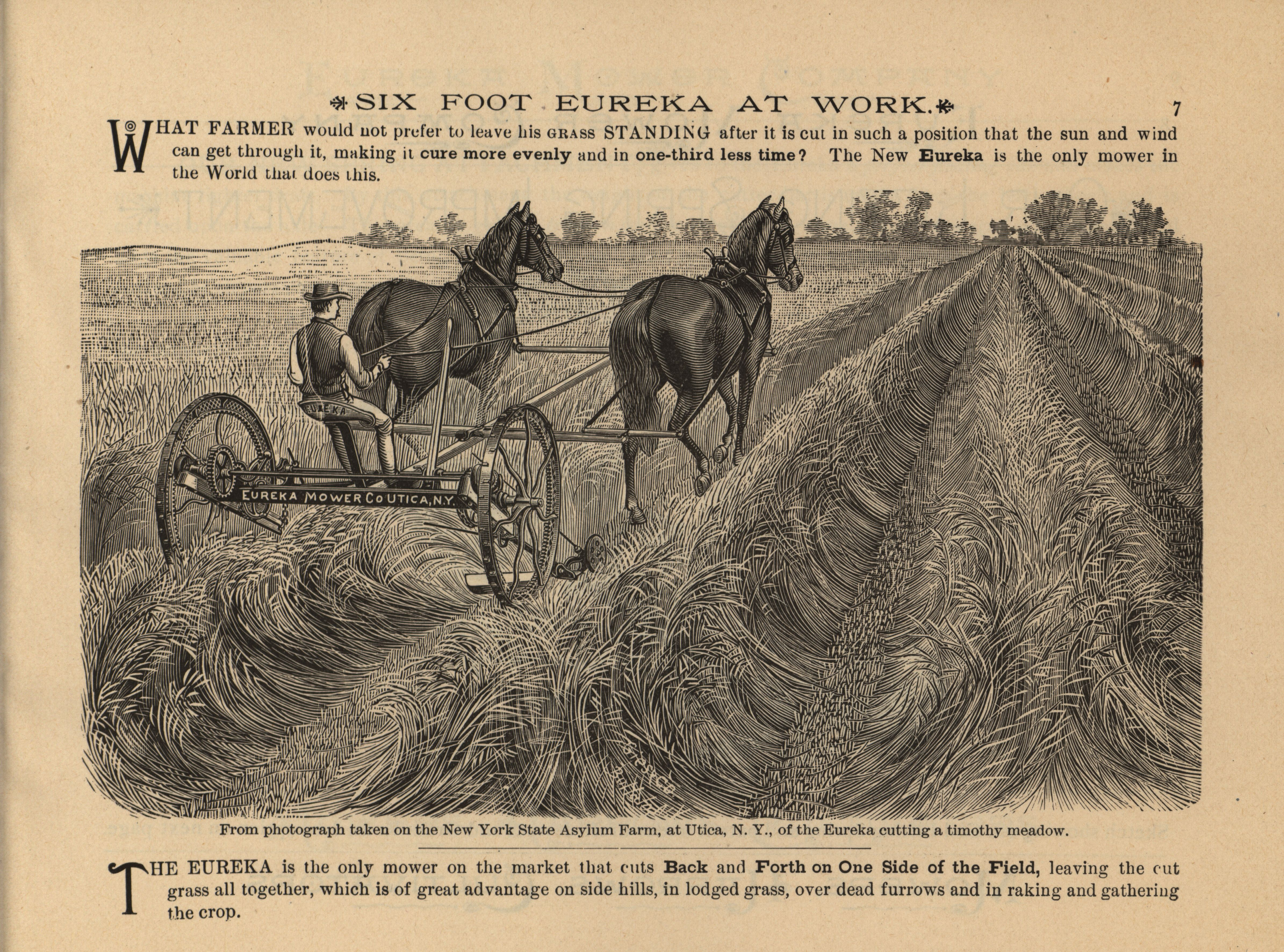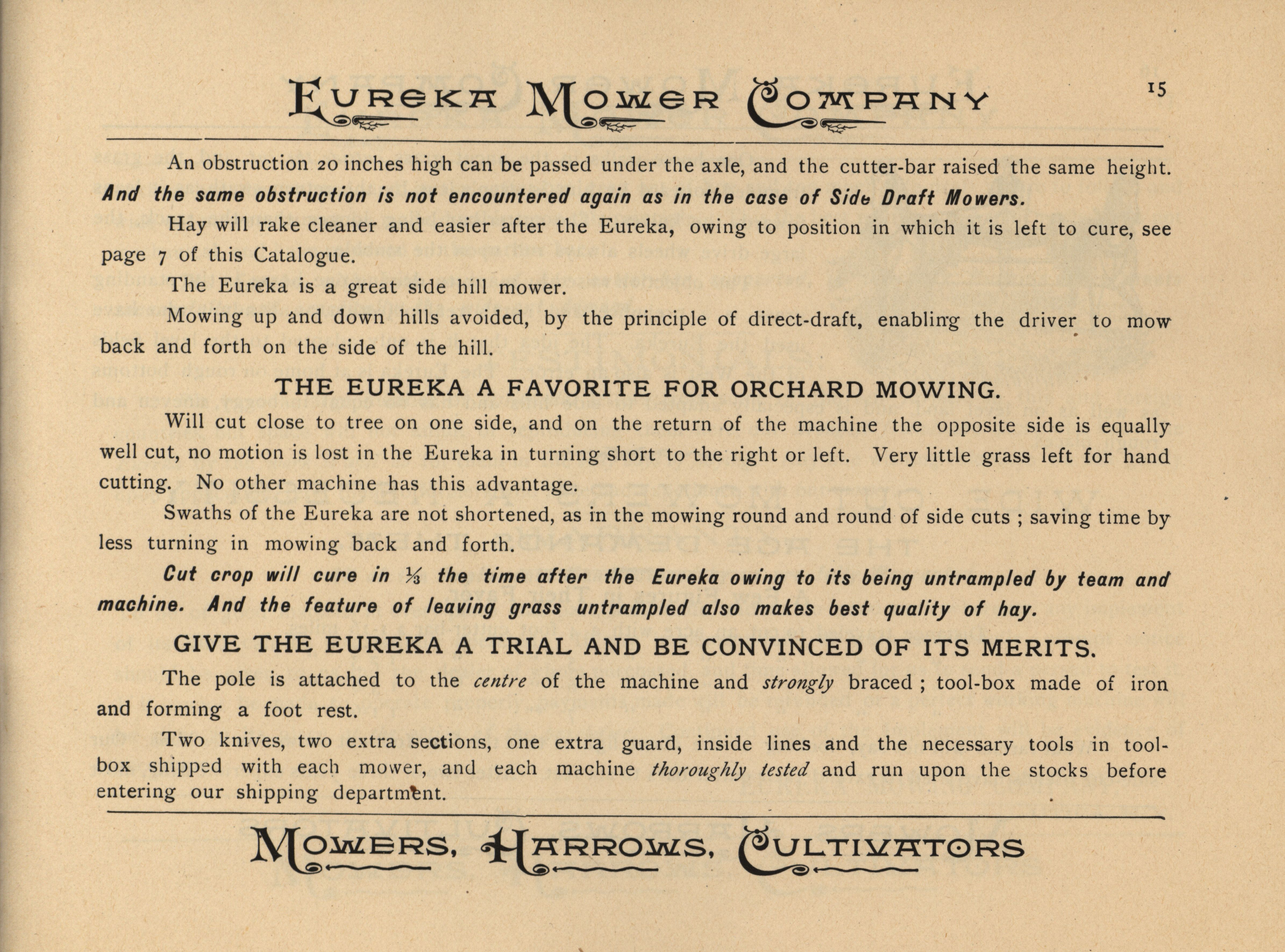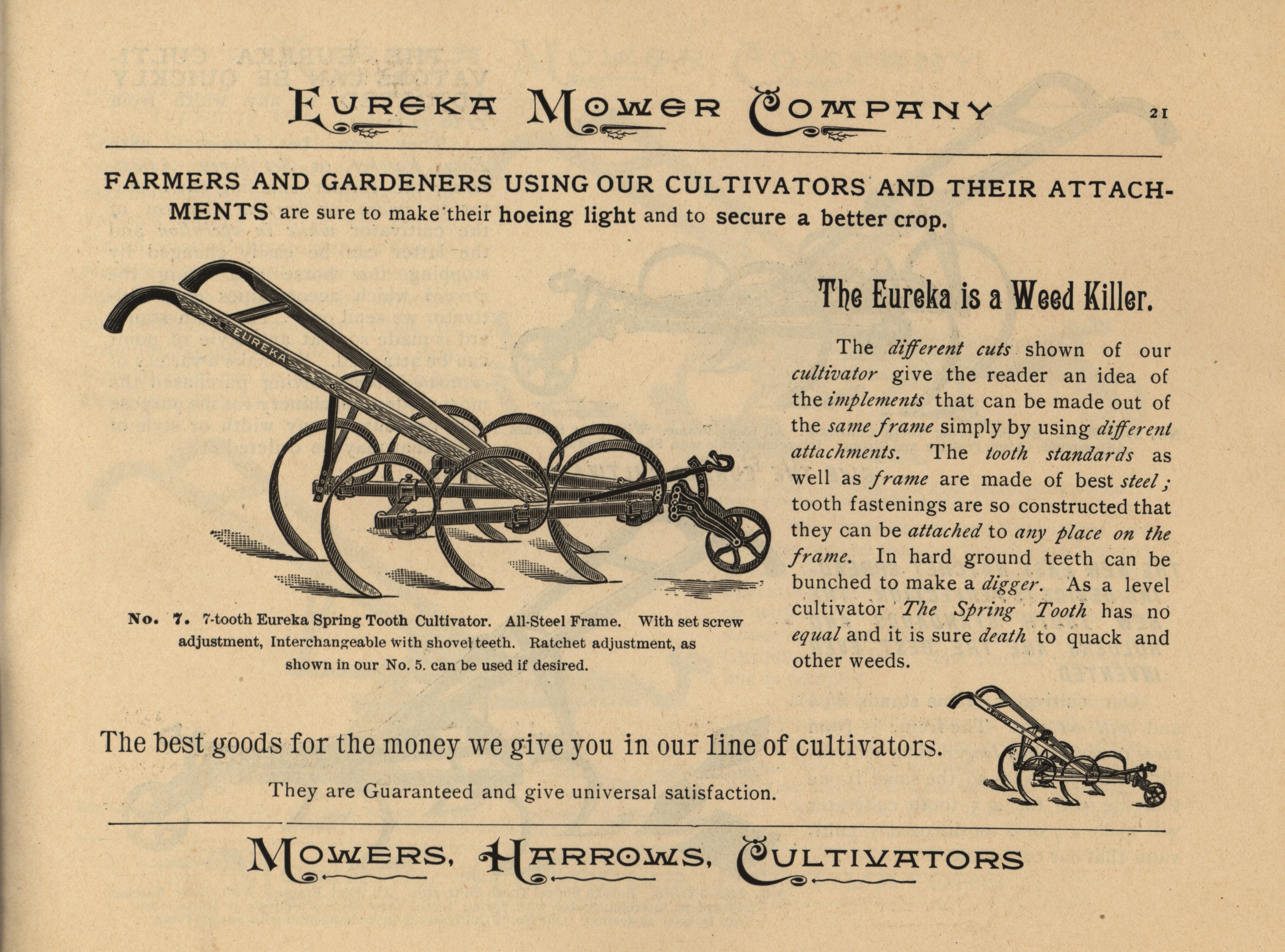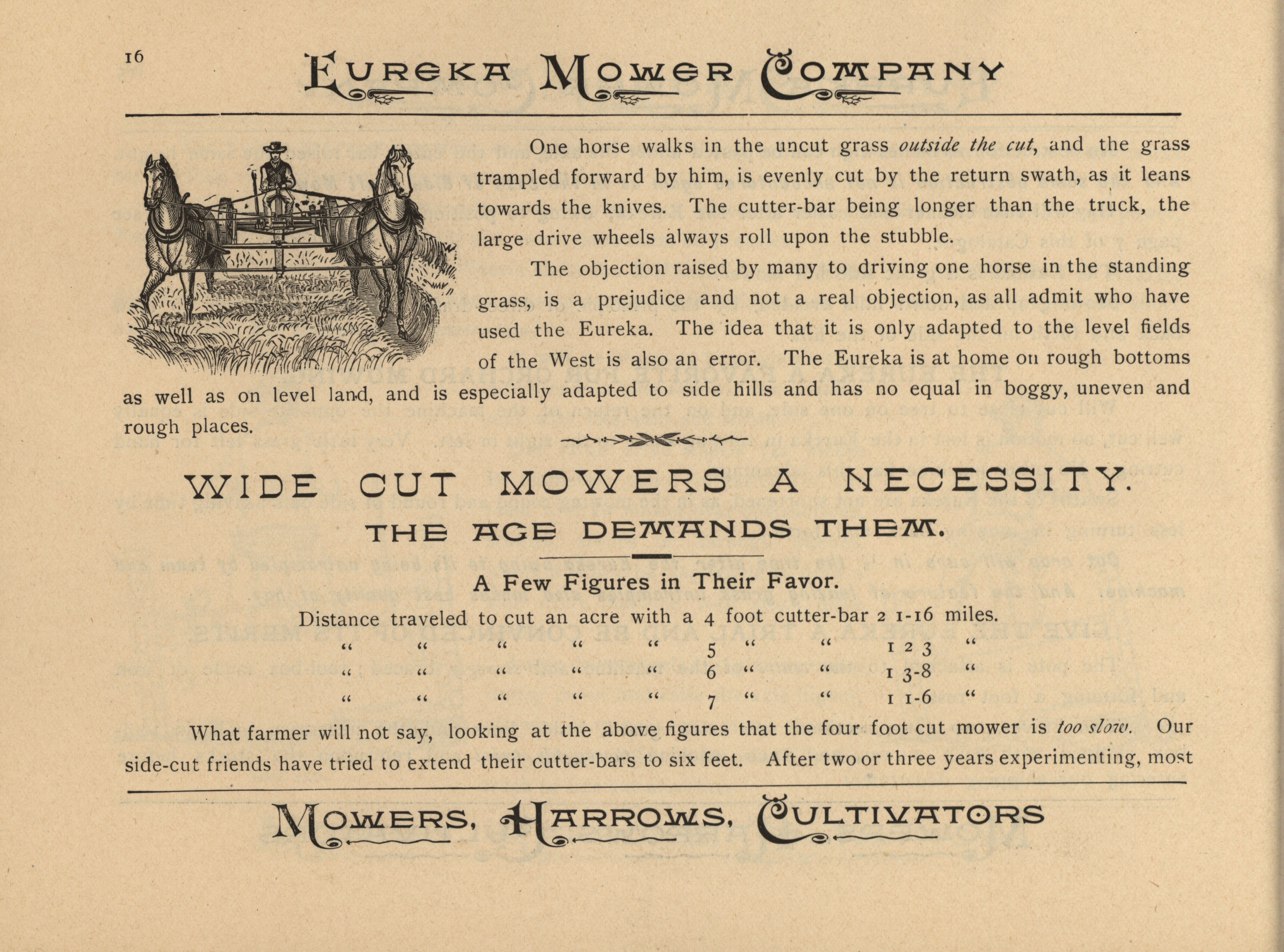 - Illustrated catalog describing the farm implements offered by Eureka Mower Company.