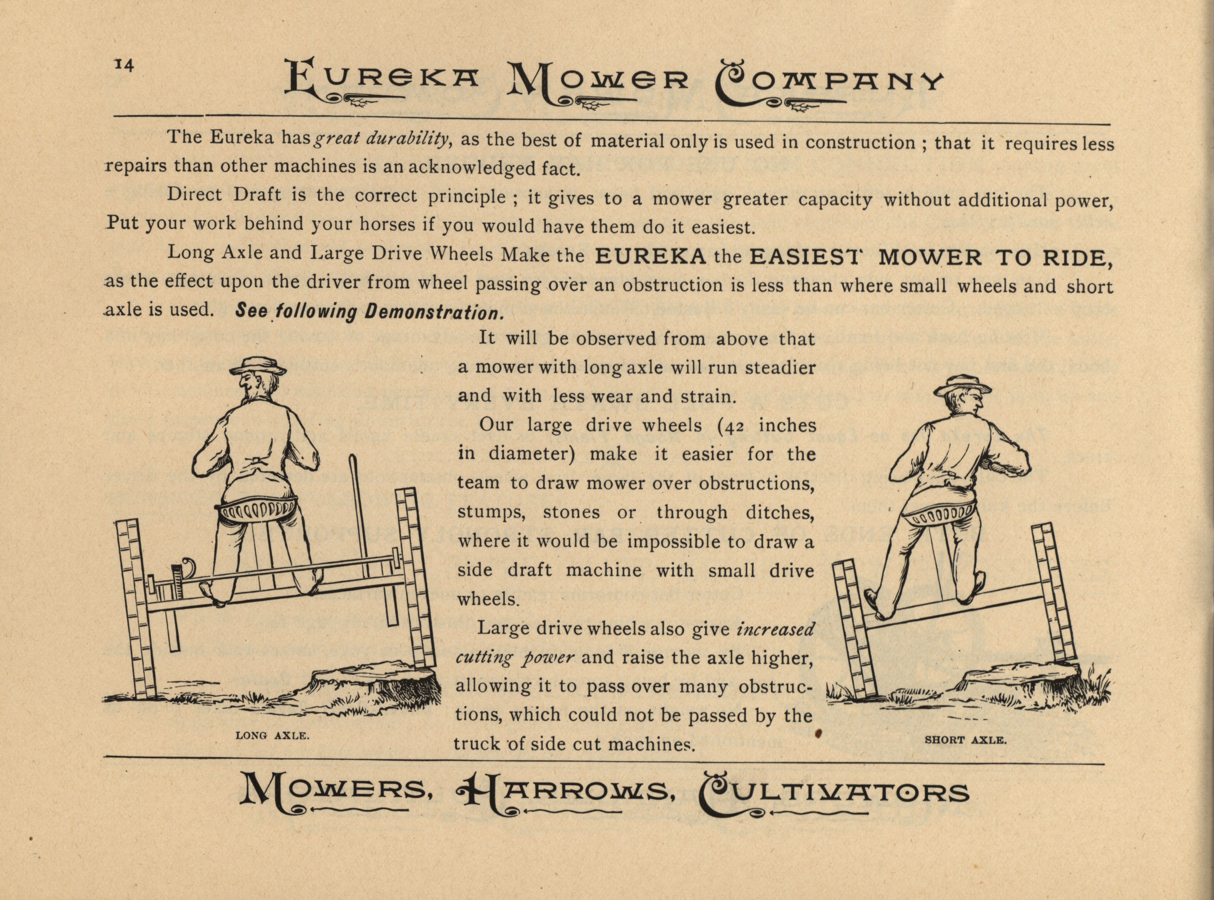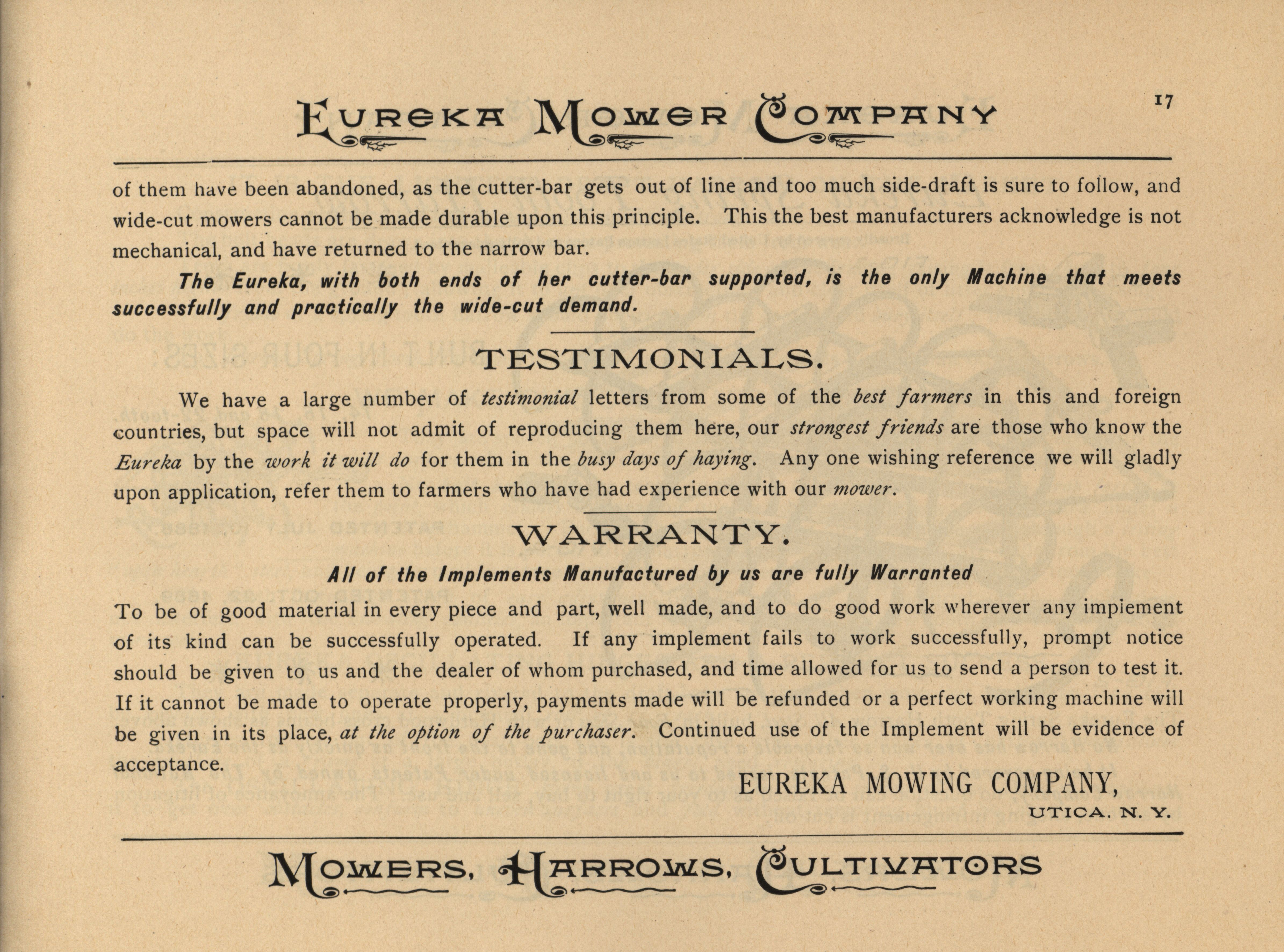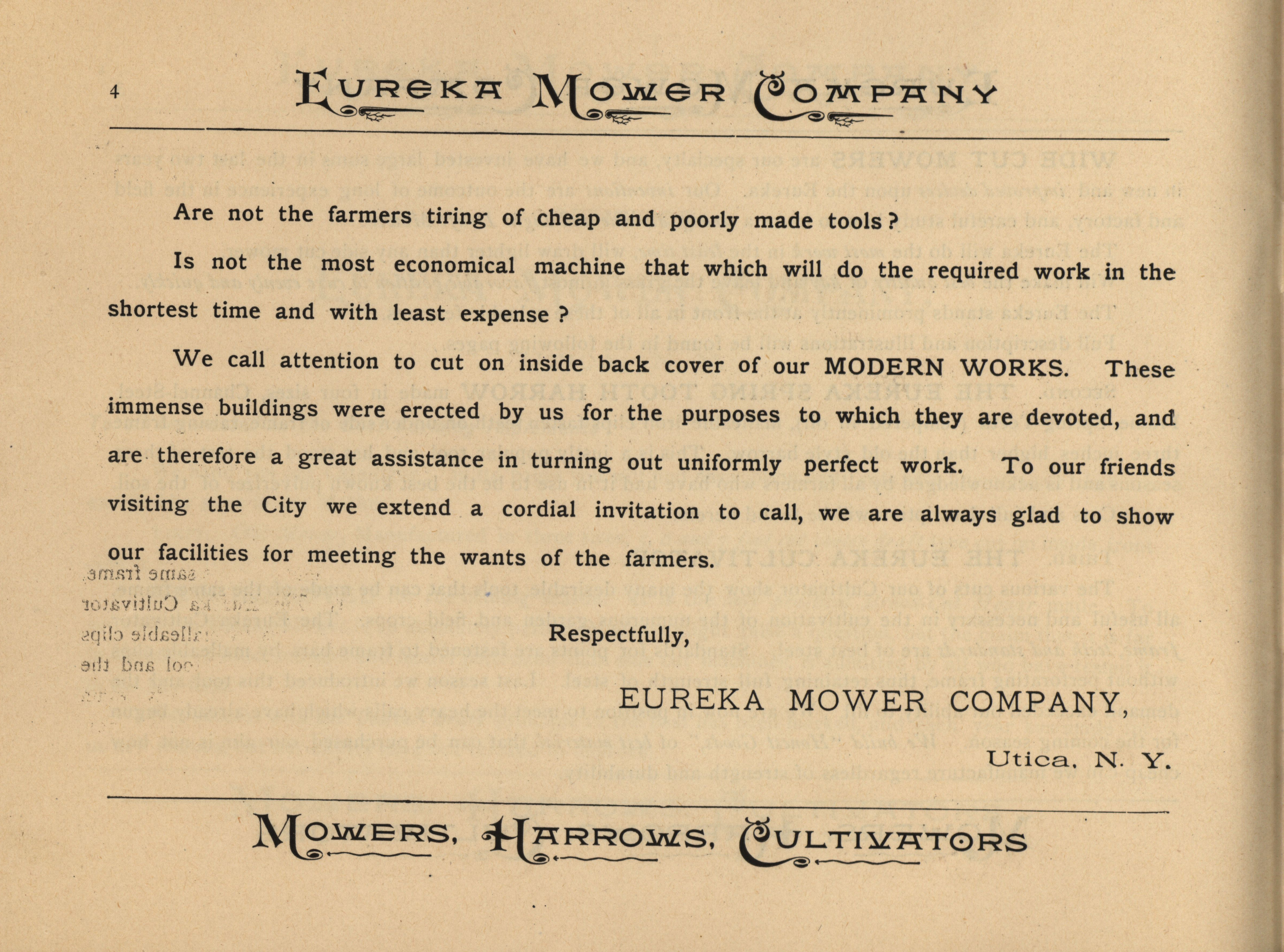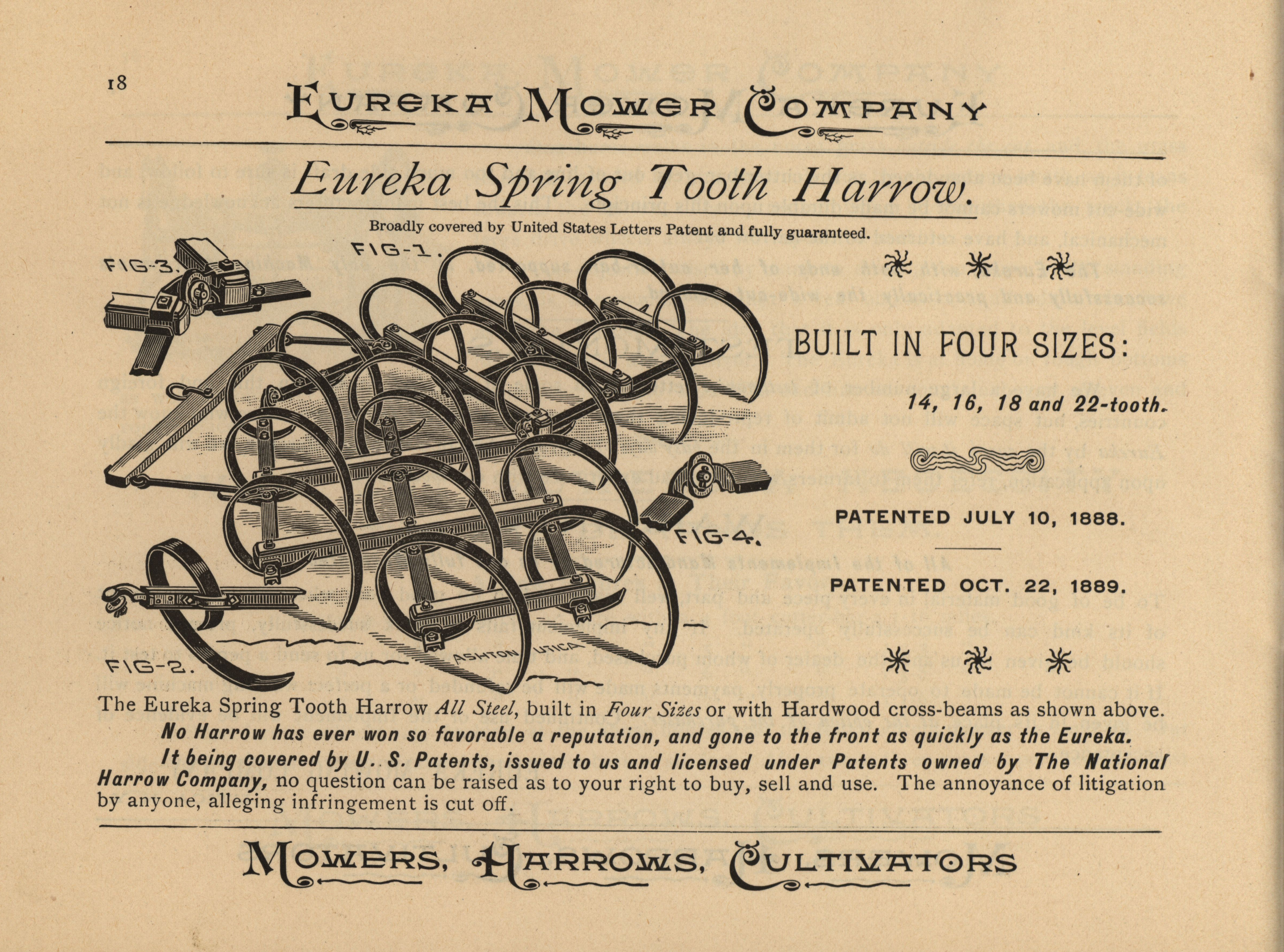 - Illustrated catalog describing the farm implements offered by Eureka Mower Company.