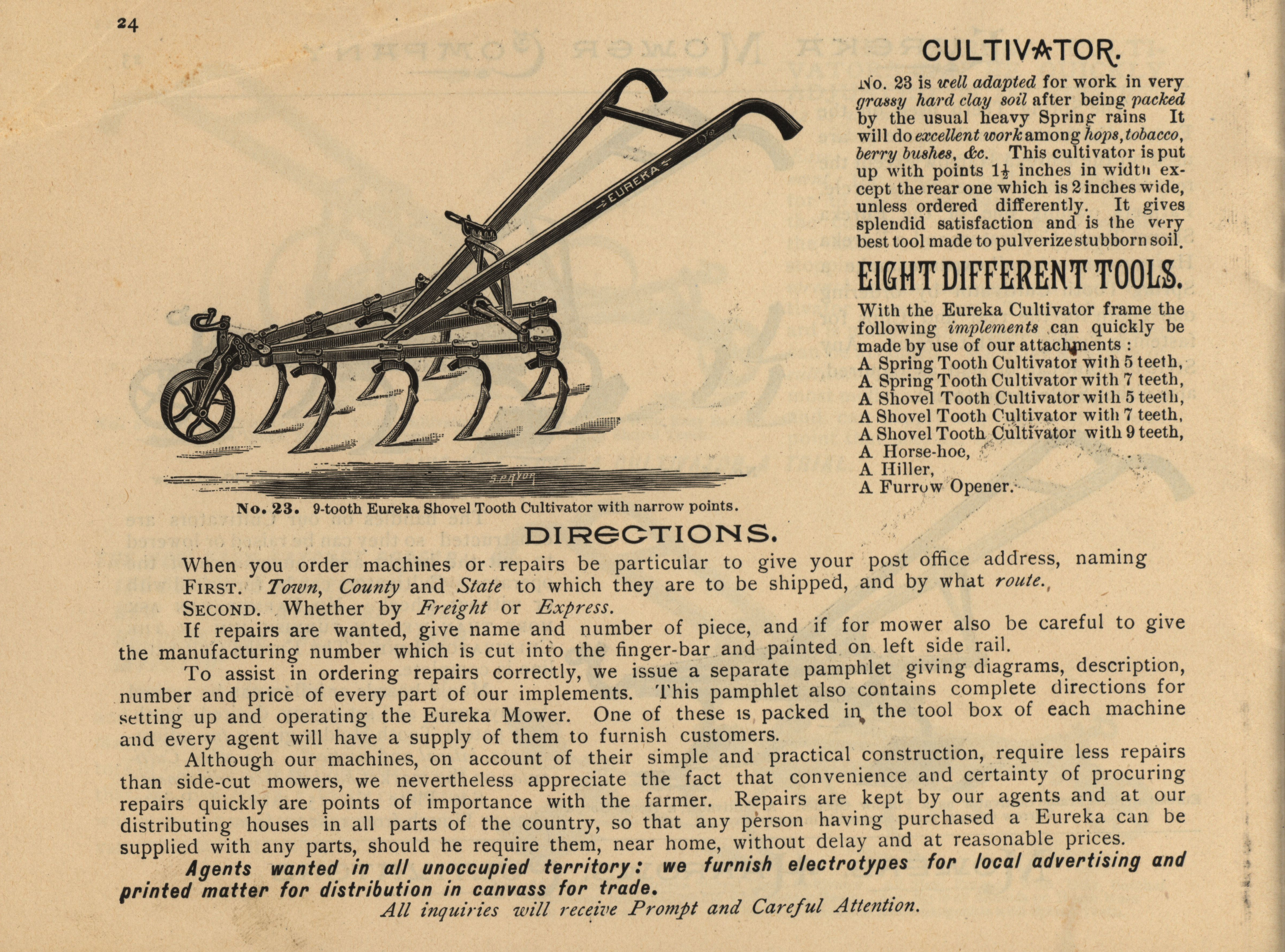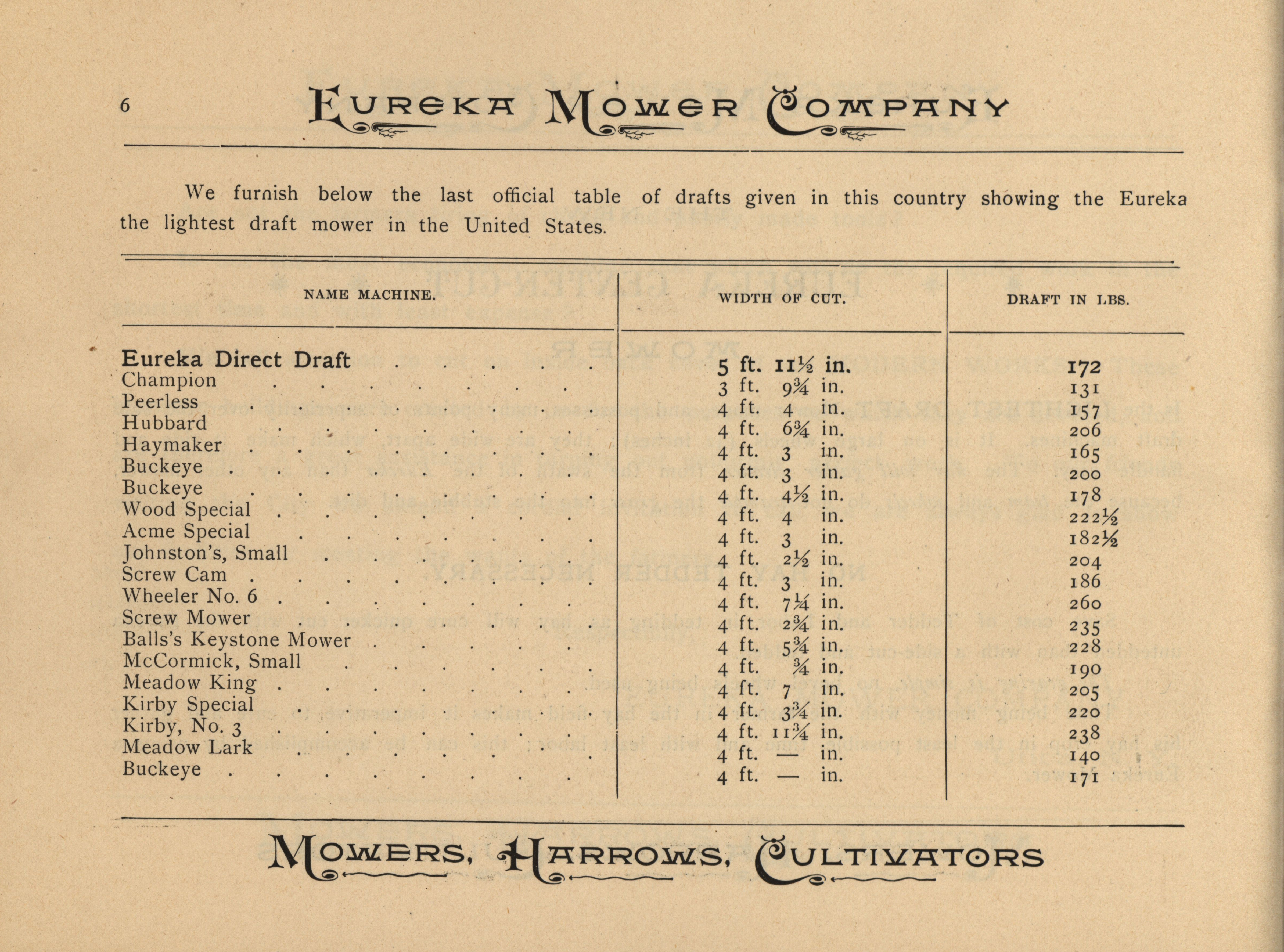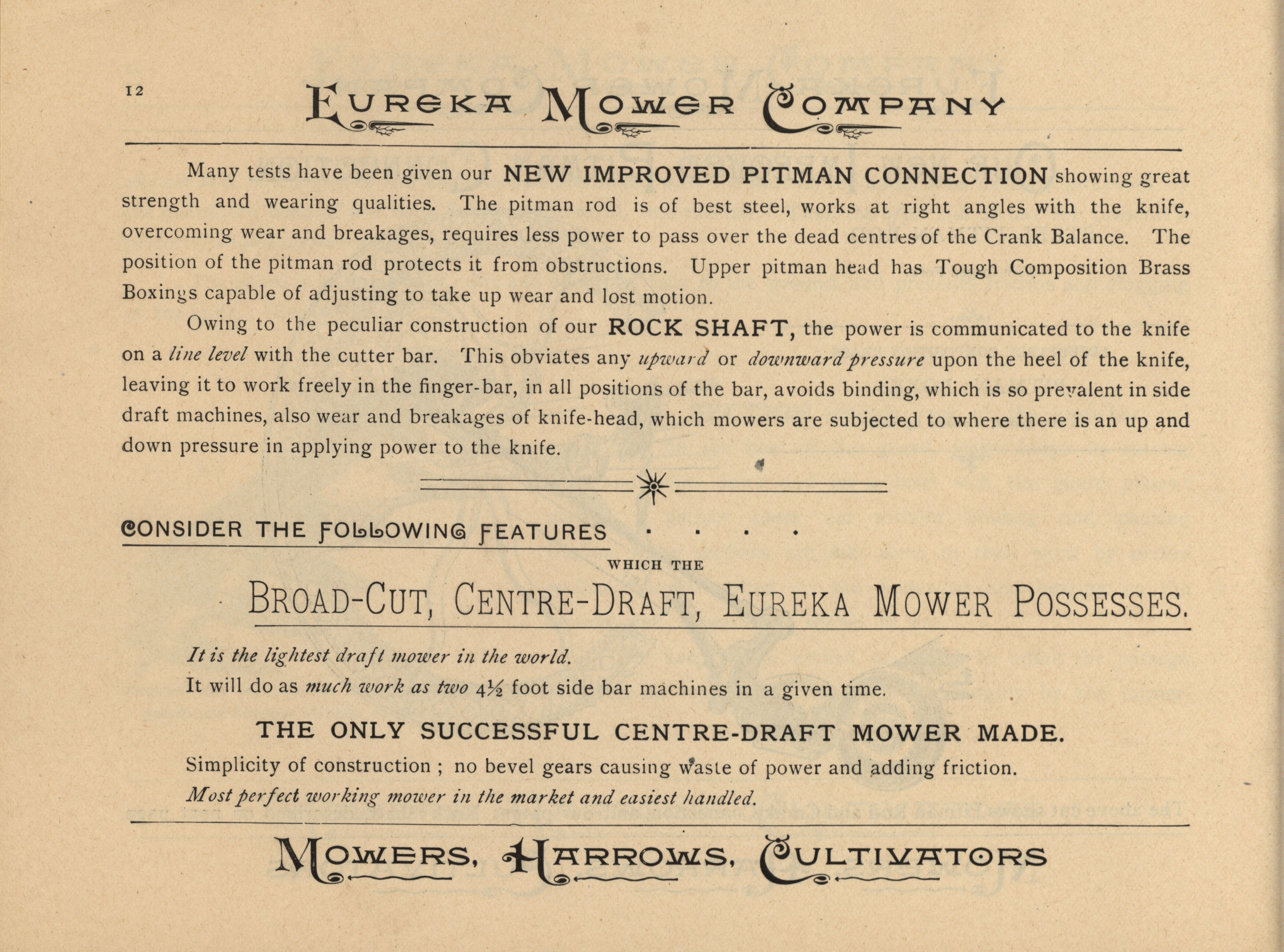 - "Eureka Mower Company farm implements catalog", Agricultural Machinery Literature Collection, Iowa State University Library Digital Collections