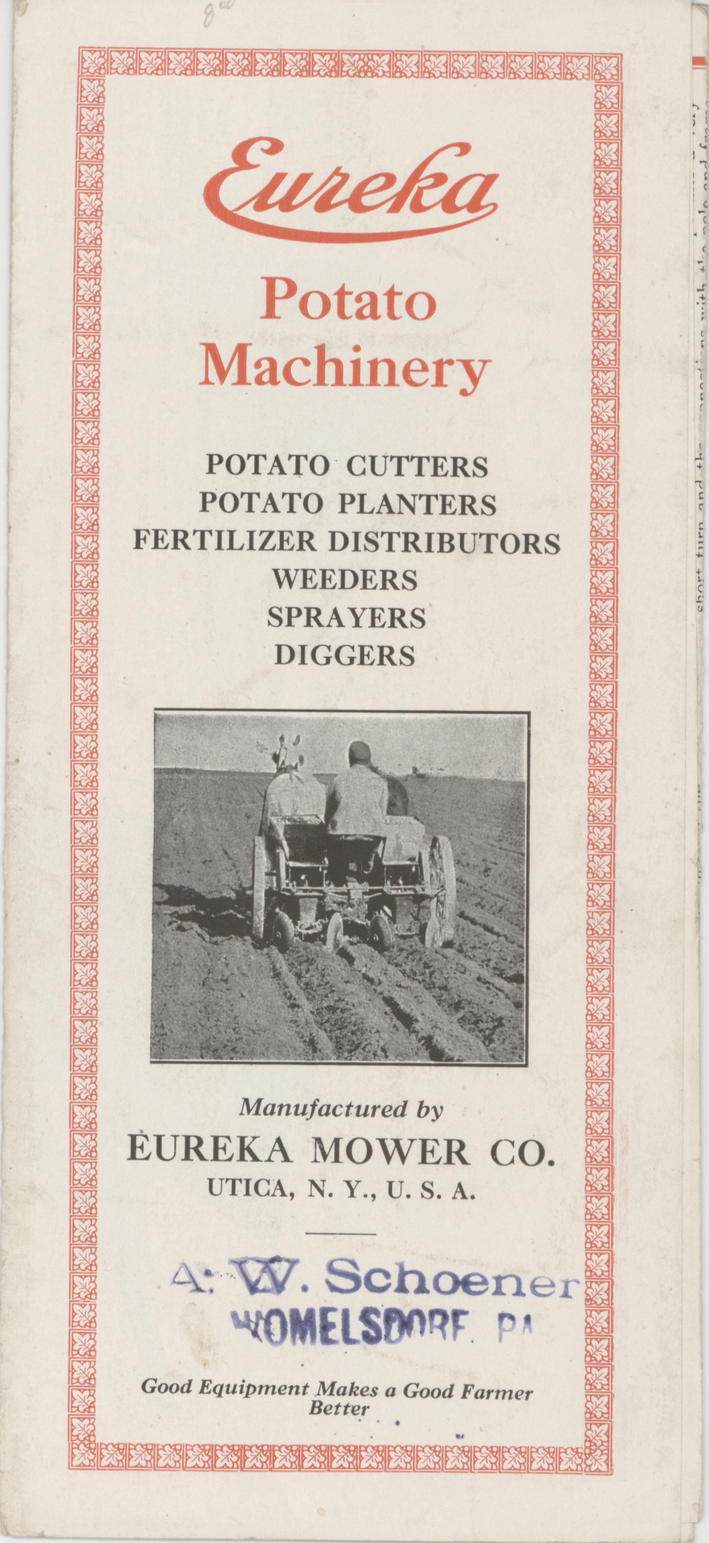- Illustrated advertising pamphlet for potato machinery offered by Eureka Mower Company.